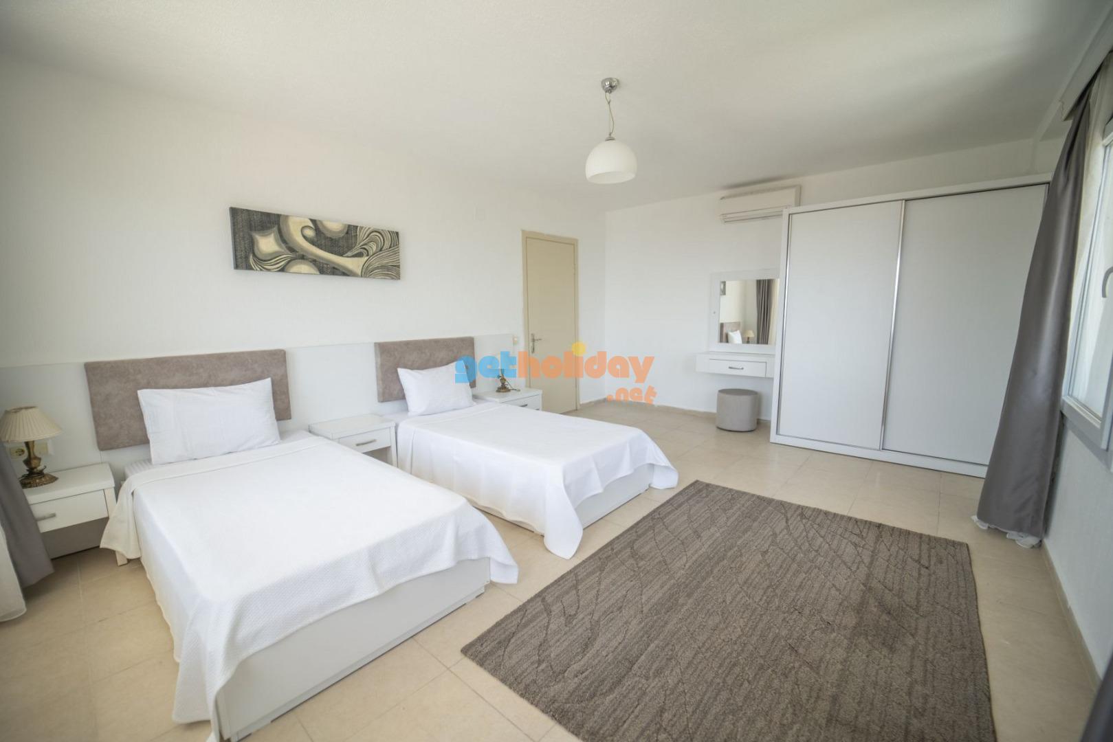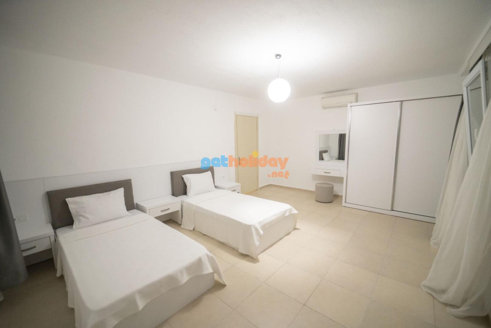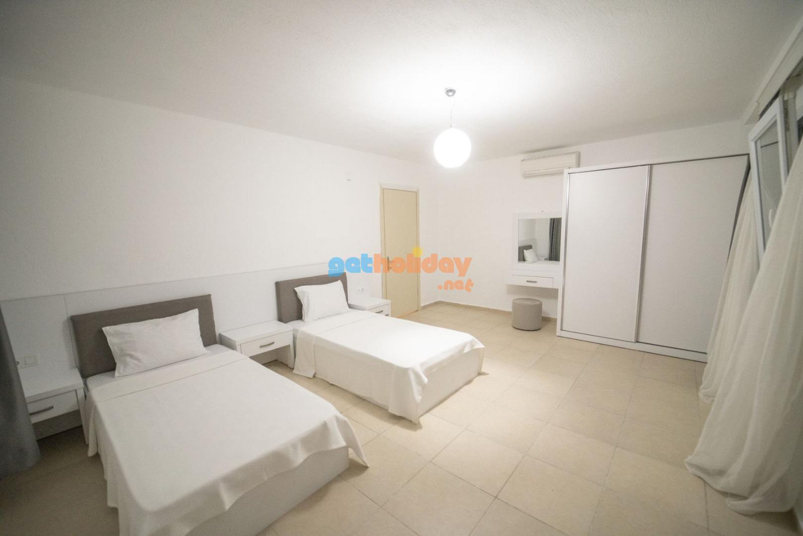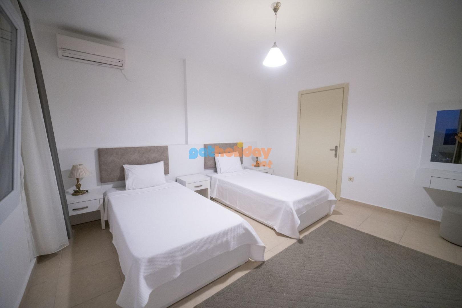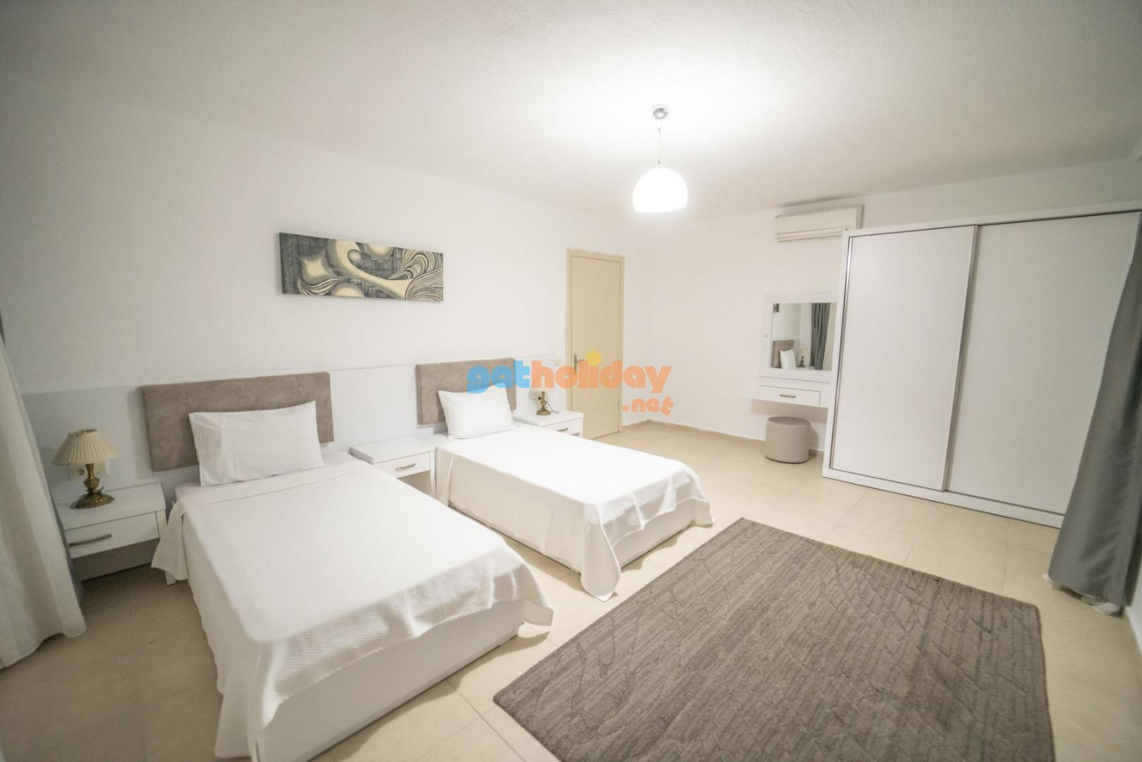 1. Yatak Odası: 2 adet tek kişilik yatak, komodin, makyaj masası, elbise dolabı, klima, ve banyo tuvalet bulunmaktadır.
