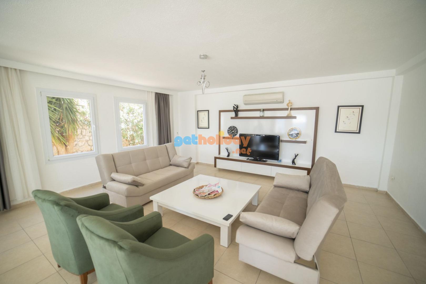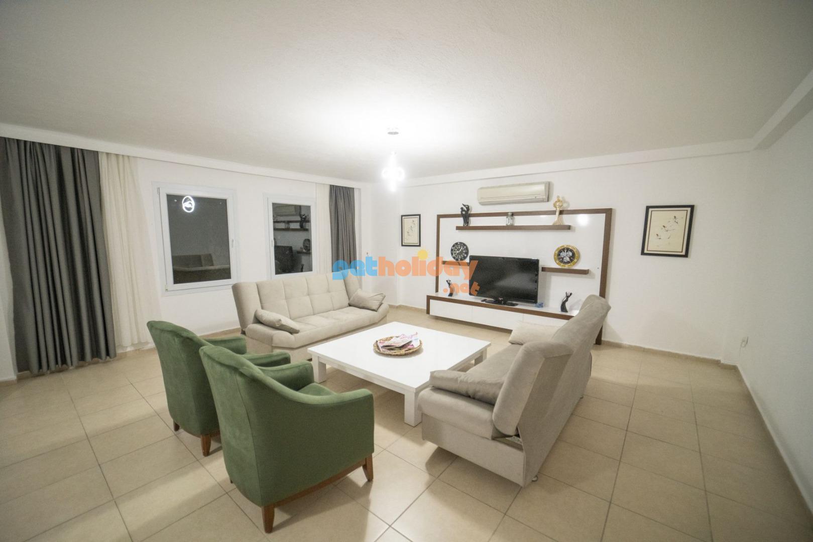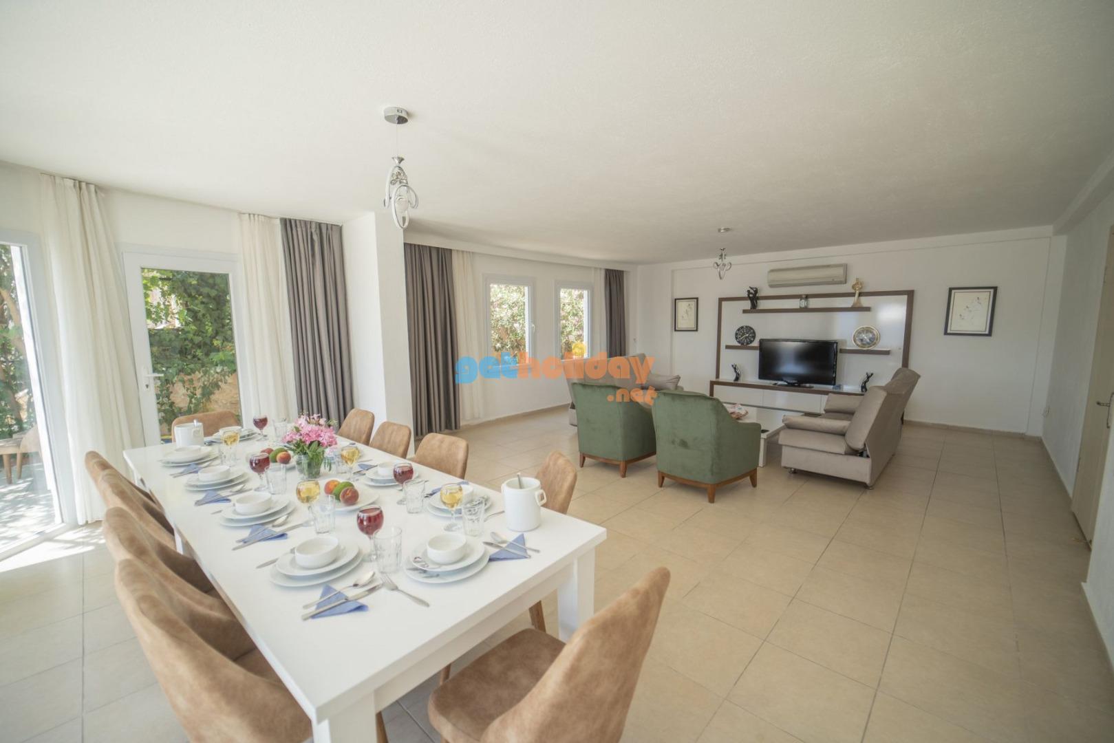 Salon: Salon içerisinde modern oturma grubu, uydu alıcı, LCD TV, internet için modem, klima, WC ve havuz terasına çıkış bulunmaktadır.