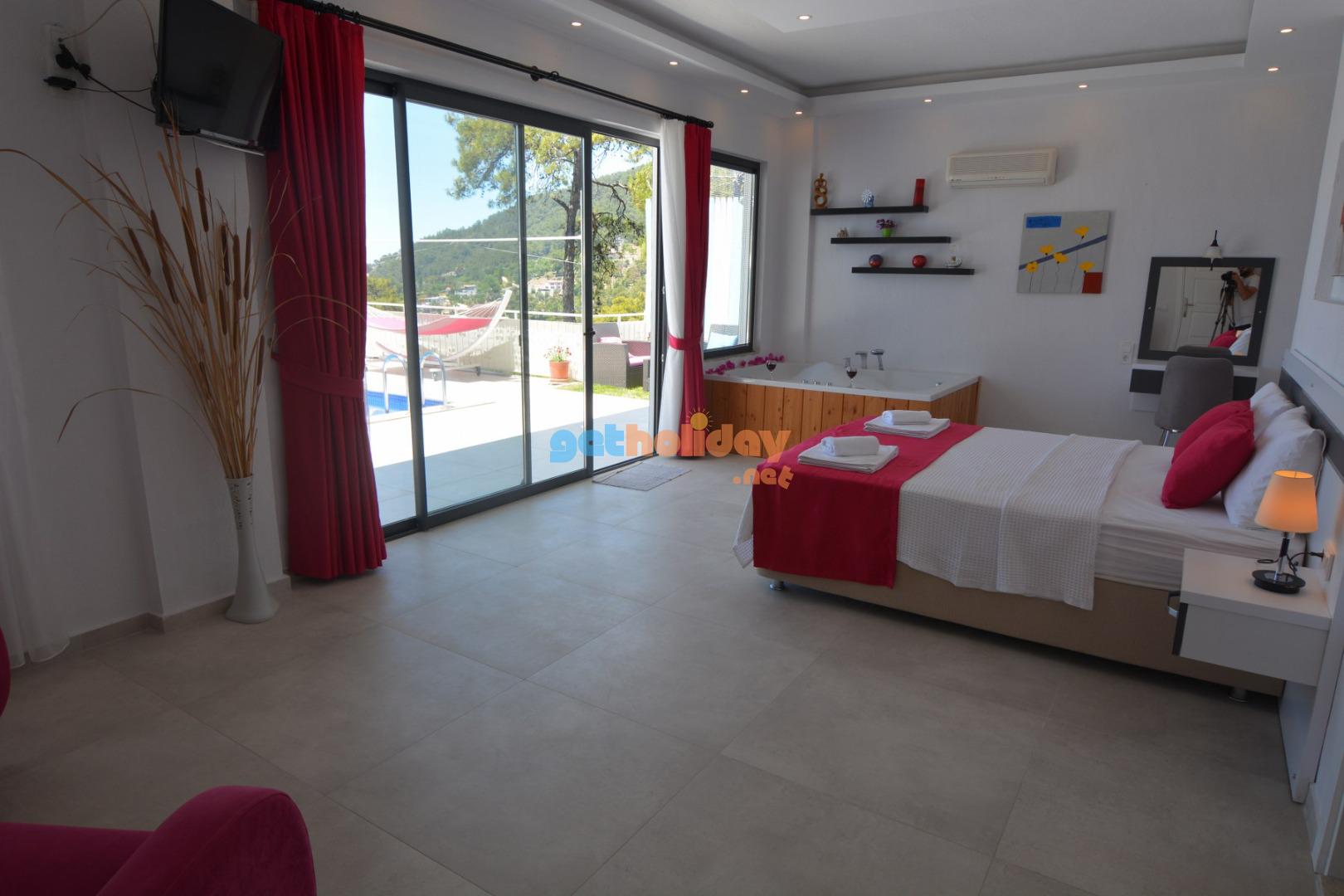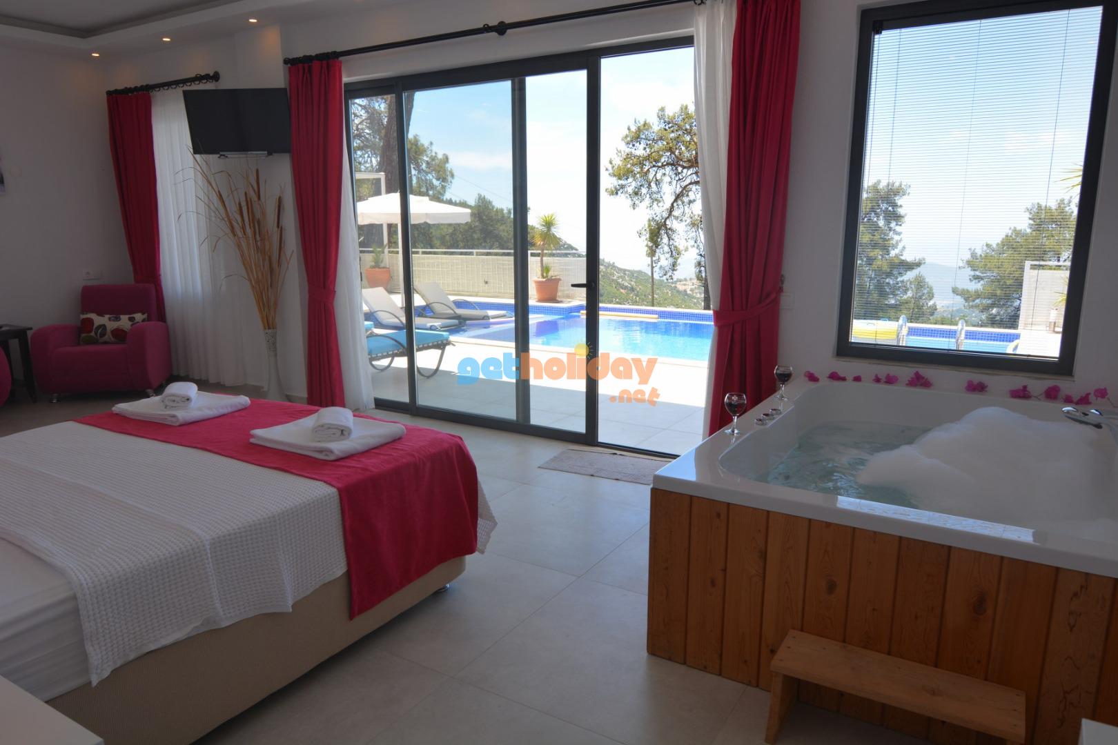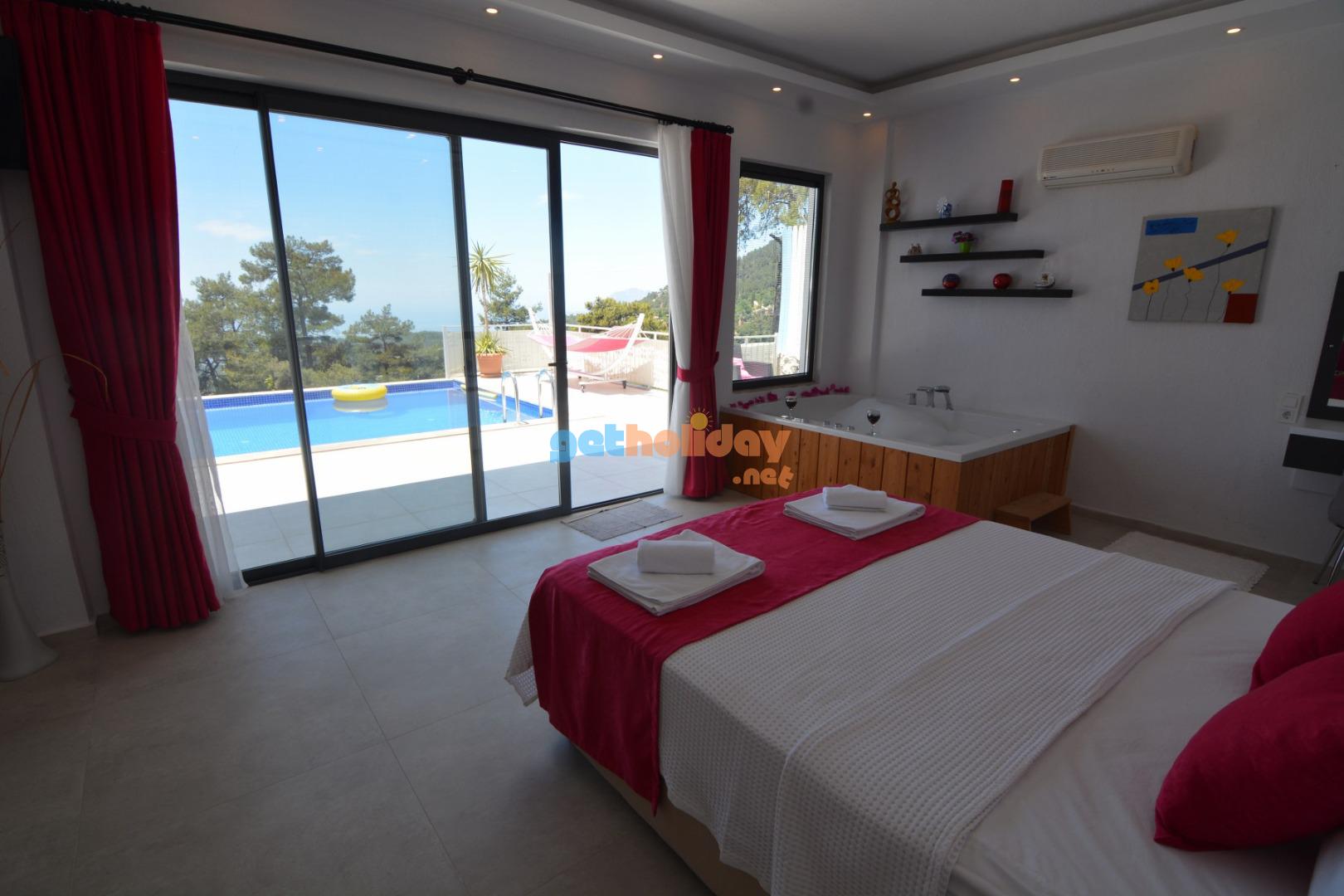 Yatak odasında bir adet çift kişilik yatak ve içerisinde jakuzi, banyo bulunmaktadır.
