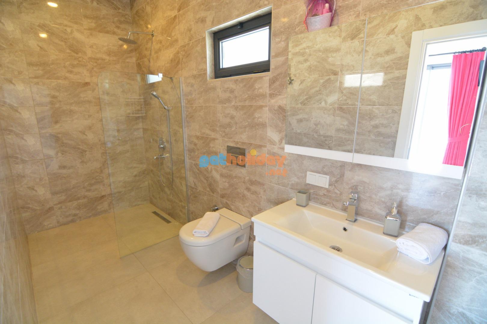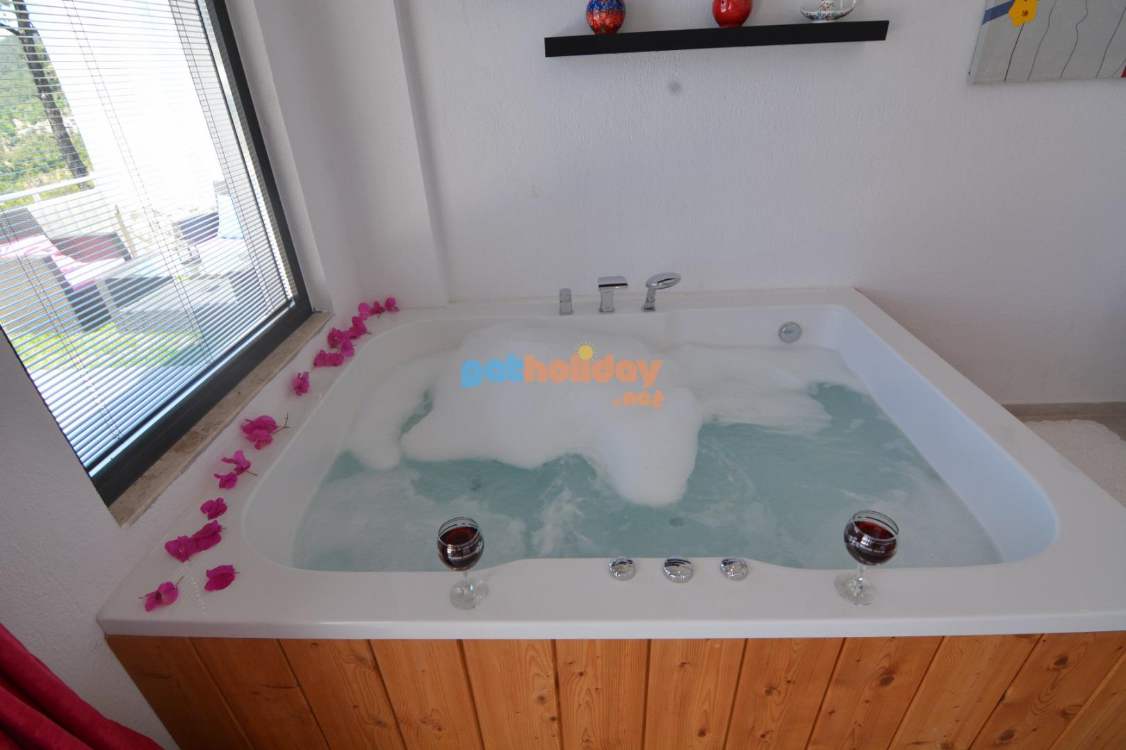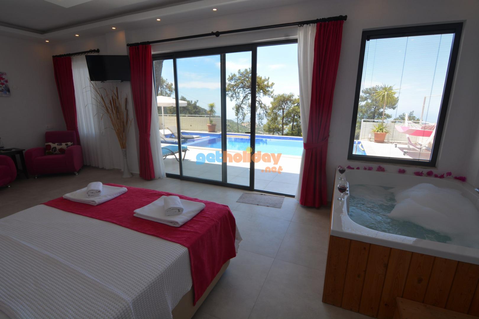 Yatak odasında bir adet çift kişilik yatak ve içerisinde jakuzi, banyo bulunmaktadır.