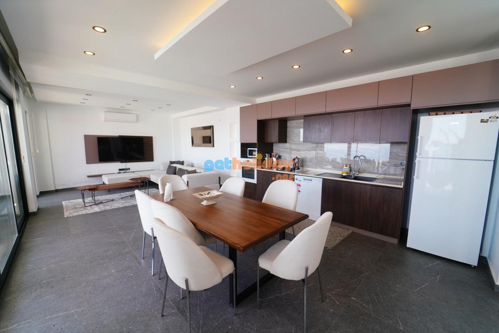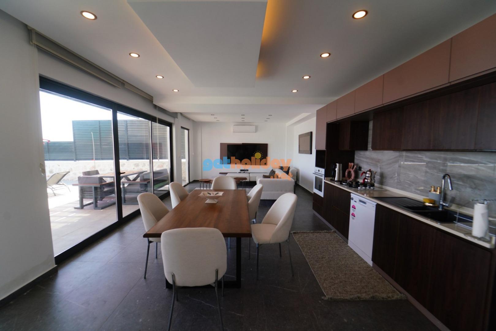 Modern şık oturma grubu, klima, televizyon, orta sehpa, havuz terasına çıkış bulunmaktadır.