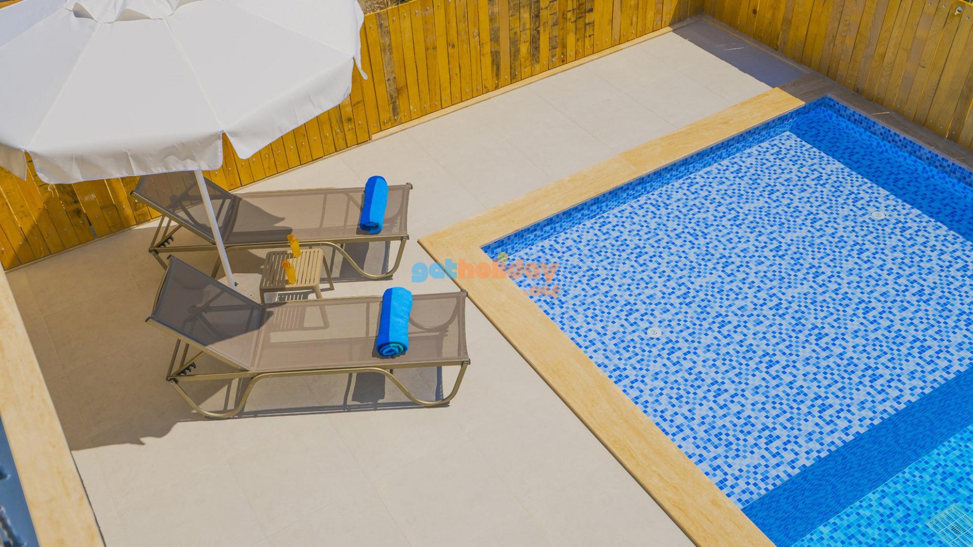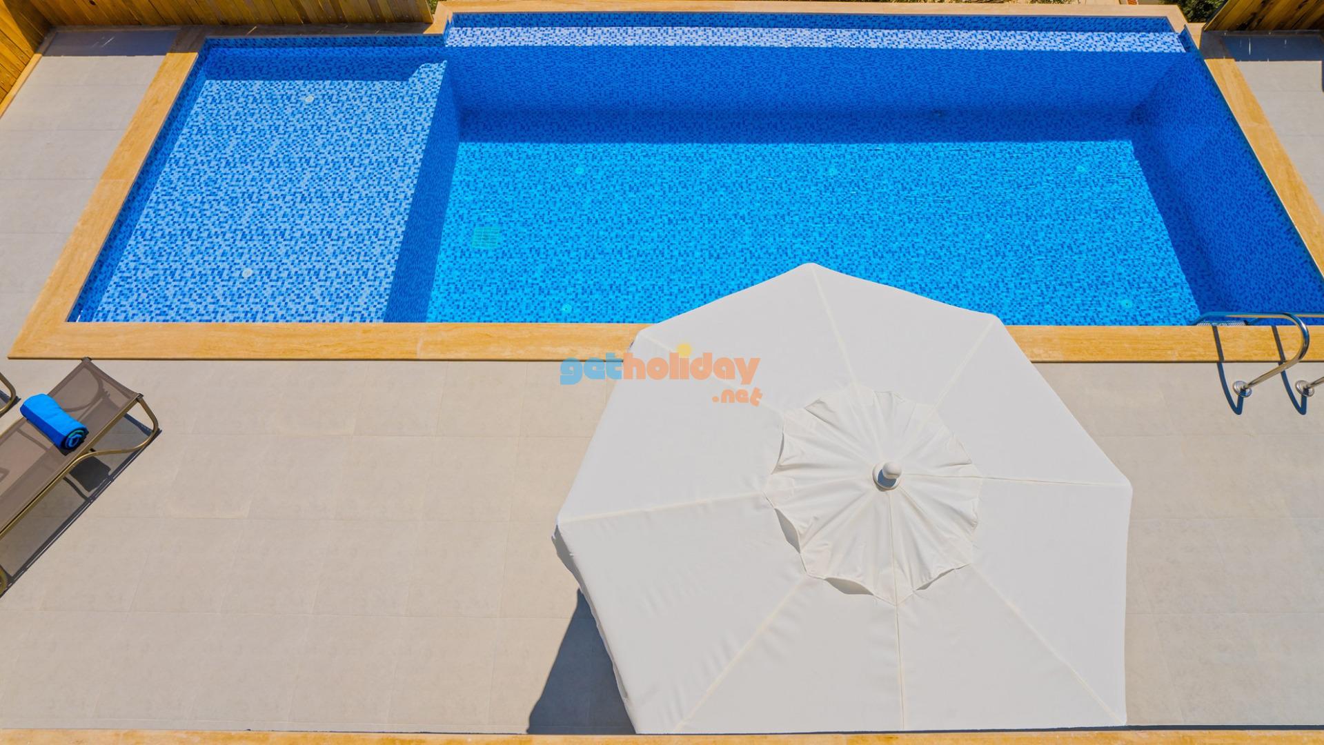 Boyu 10 mt x Eni 3.5 m derinlik 150 cm'dir. Havuzu korunaklı olup dışarıdan gözükmemektedir.