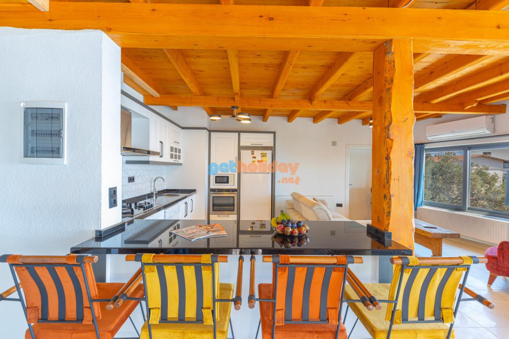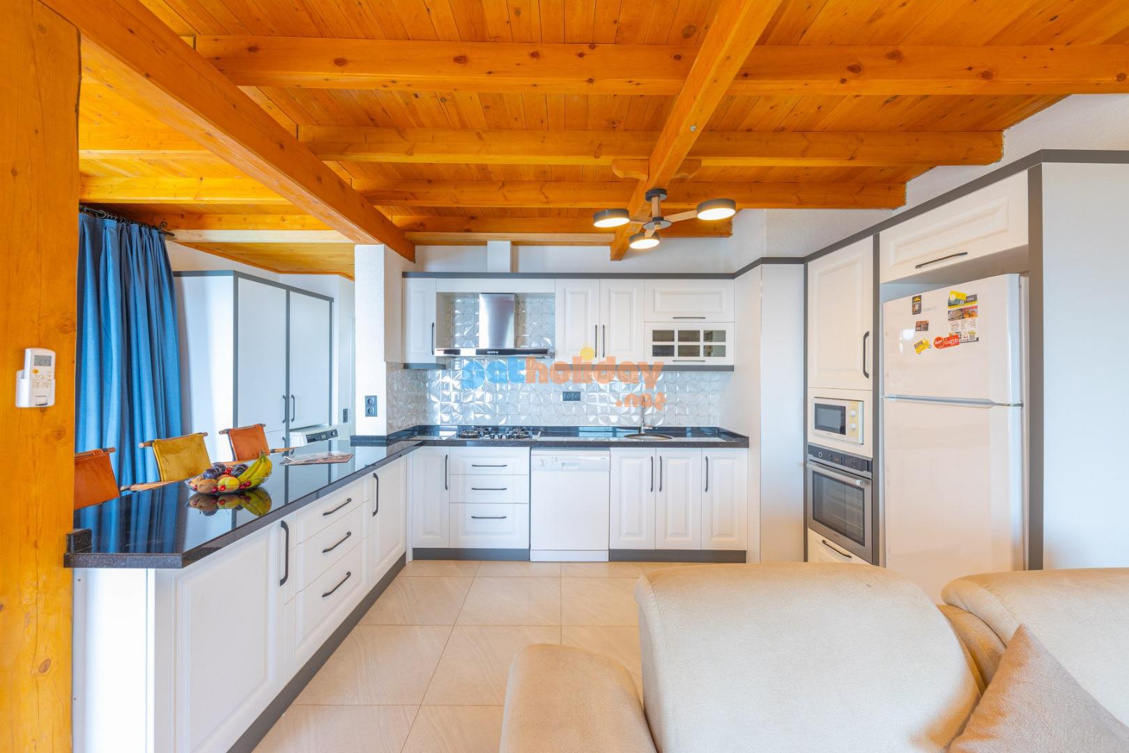 Mutfak: Modern Amerikan mutfakta ; buzdolabı, bulaşık makinesi, çamaşır makinesi, ankastre fırın, mikrodalga fırın, 4'lü ocak, tencereler, tavalar, bardaklar, elektrikli su ısıtıcısı, yemek takımı, çatal - kaşık takımı, yemek masası ve sandalyeler bulunmaktadır.