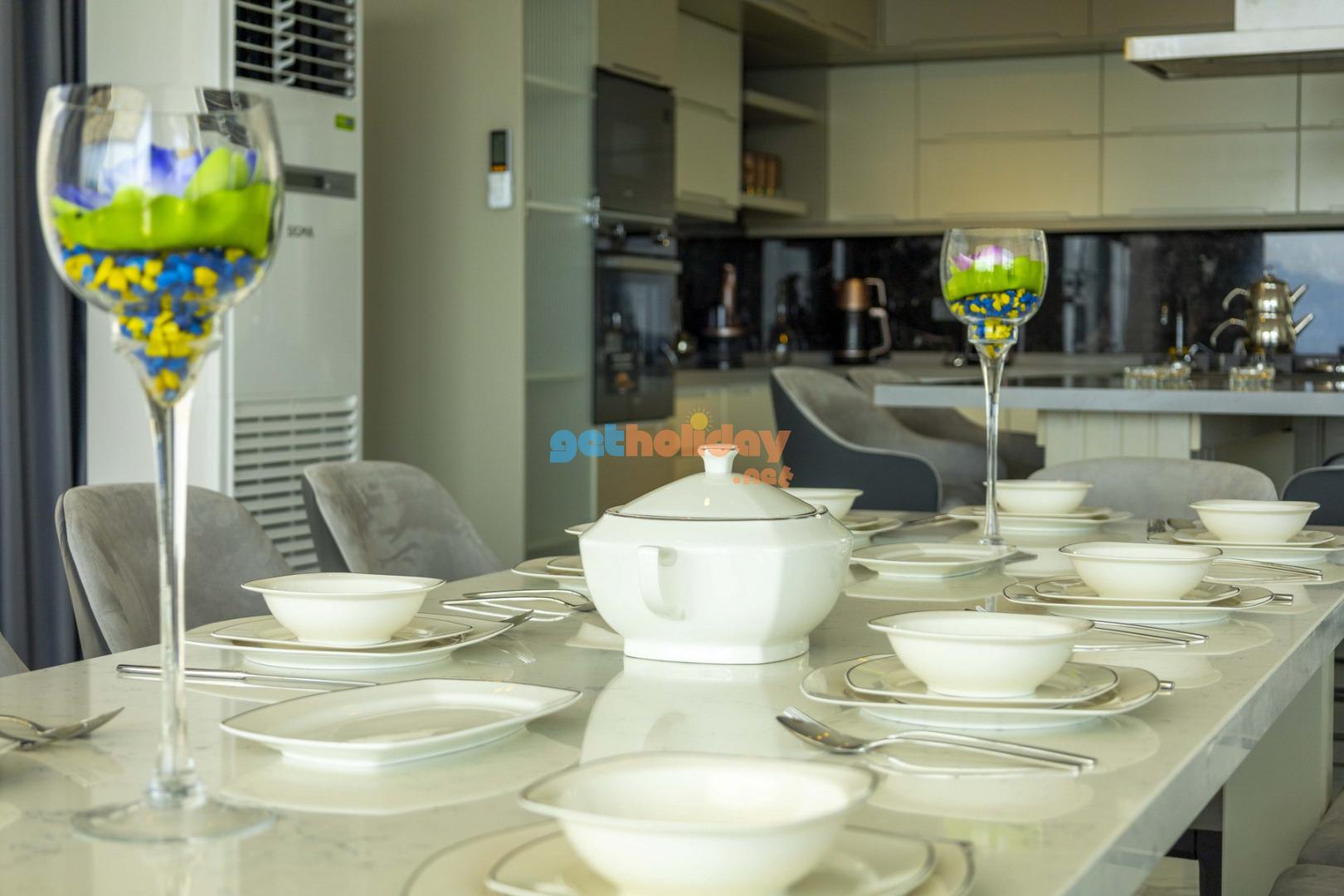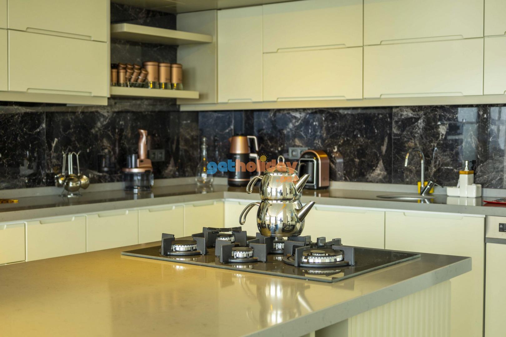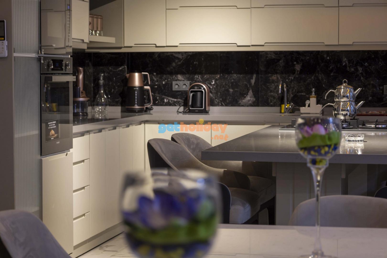 Mutfak : Amerikan tarzı mutfağı bulunan villamızda ; buzdolabı , fırın , ocak , mikrodalga , elektrikli su ısıtıcısı , bulaşık makinası , çatal & bıçak takımı , yemek takımı , yemek masası vb. gerekli tüm mutfak gereçleri bulunmaktadır.