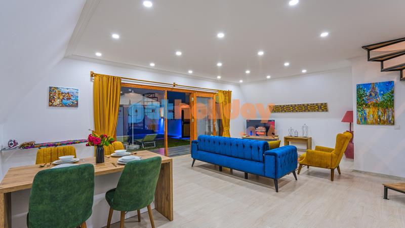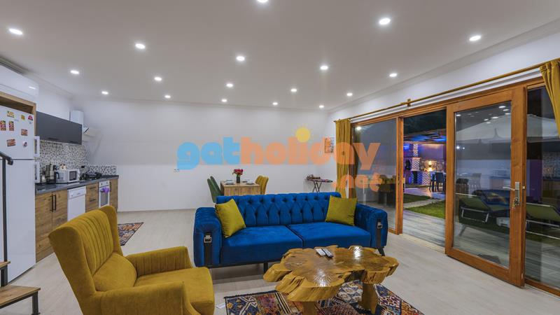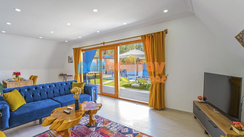 Salon : Villa ’in salonunda sizi şık bir oturma grubu ile TV, internet, uydu, koltuk, sehpa ile ferah bir salon bekliyor olacaktır. Havuz kısmına çıkışlar ise bu kısımdan yapılmaktadır.