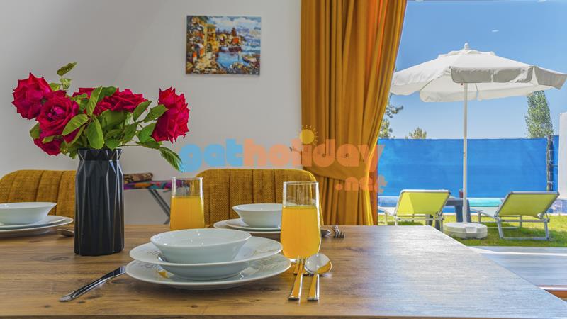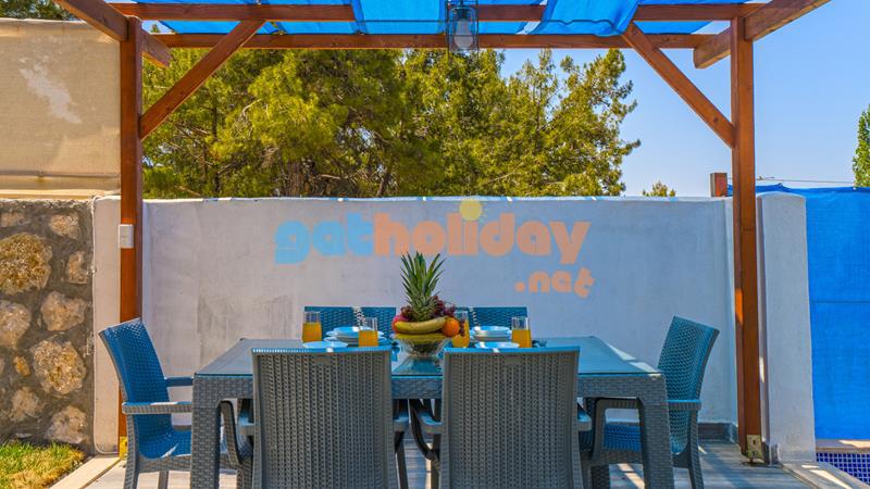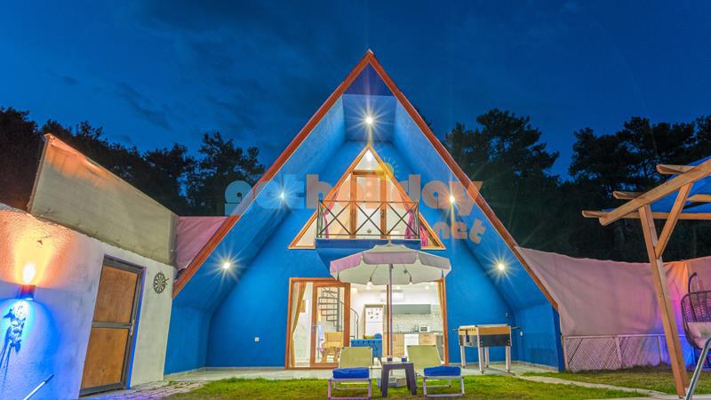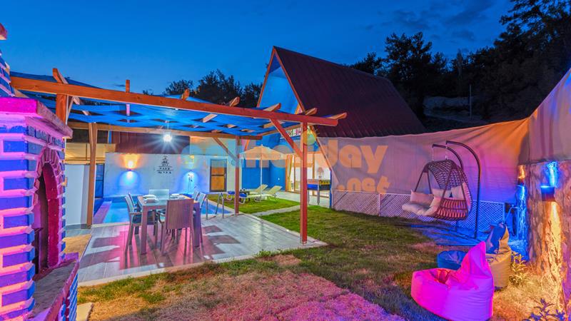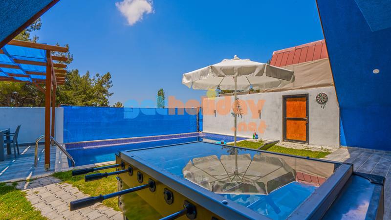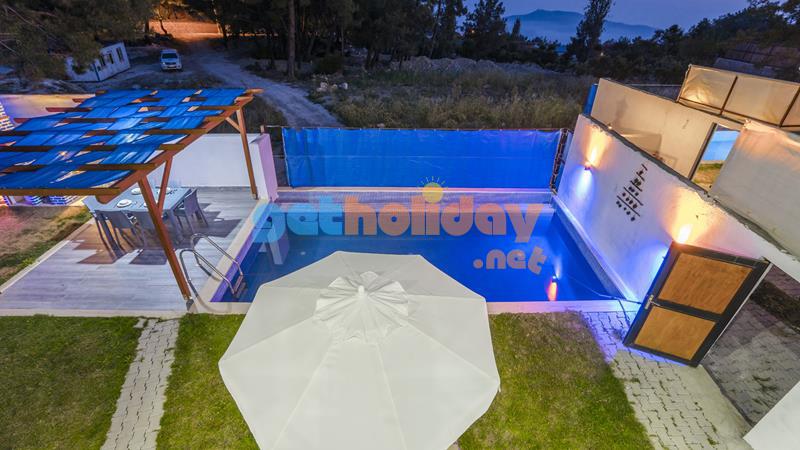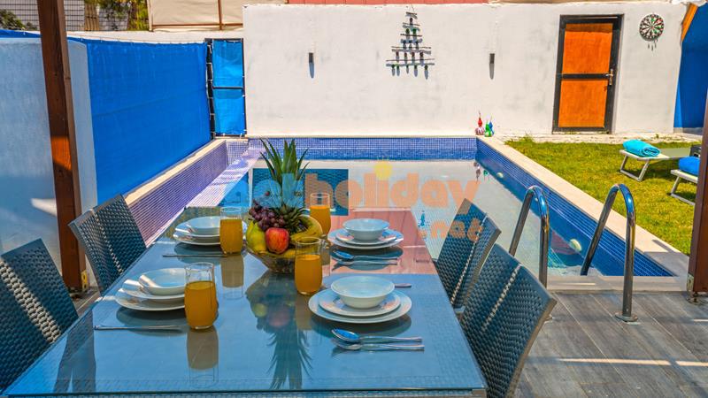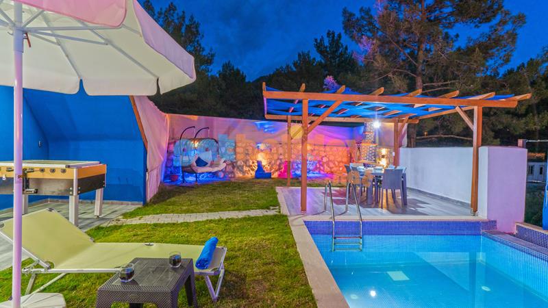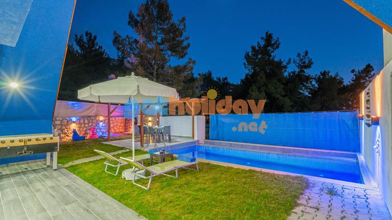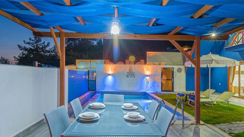 Bahçe : Villamızın bahçesinde özel yüzme havuzu, güneşlenmeniz için 2 adet şezlong, 2 kişilik masa, mangal keyfiniz için barbekü, güneş şemsiyesi bulunmaktadır