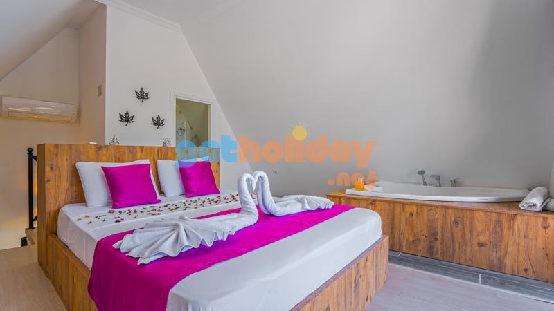 1. Yatak Odası : İki kişilik yatakla beraber sizleri sıcak yaz günlerinde serin tutması için bakımları yapılmış klima ile komodin eşyalarınız için geniş elbise dolabı, makyaj masası, banyo ve lavabodan oluşmaktadır. Villamızın jakuzisi de bu oda da bulunmaktadır.