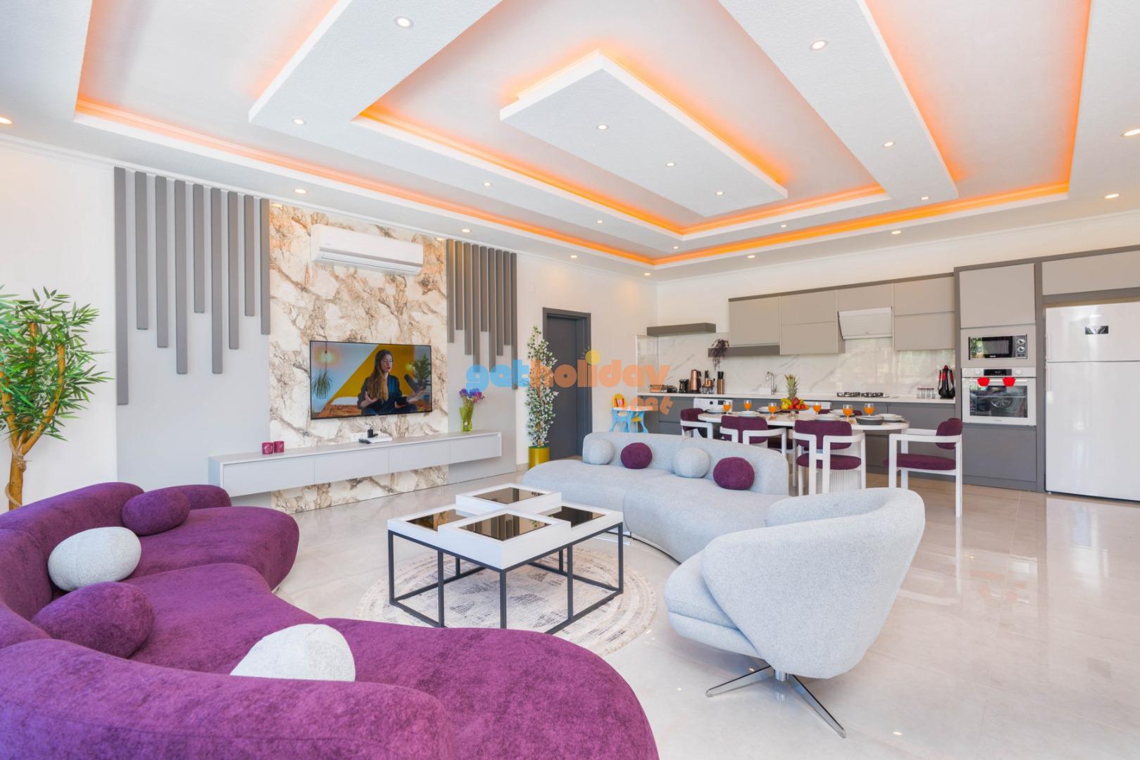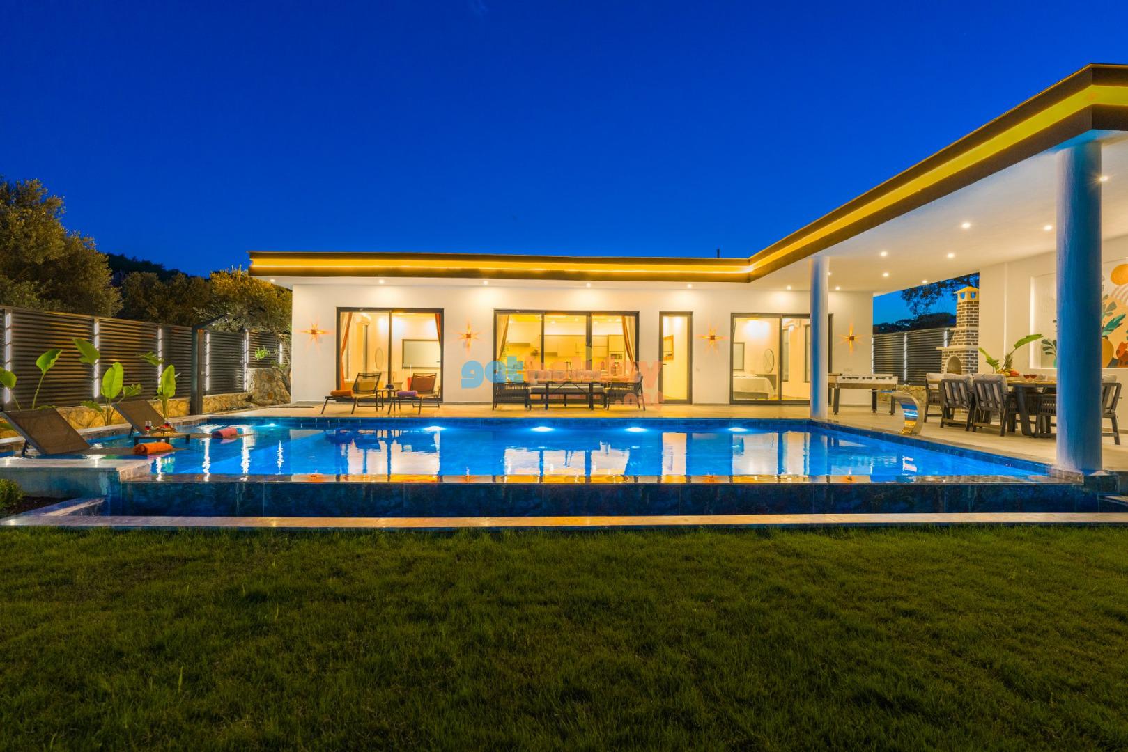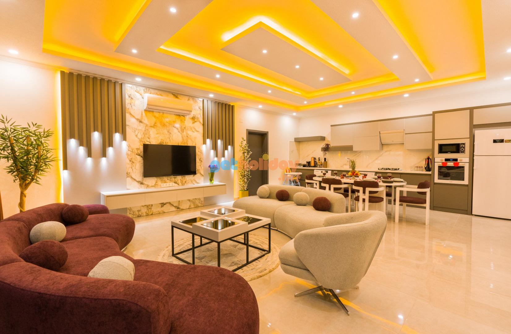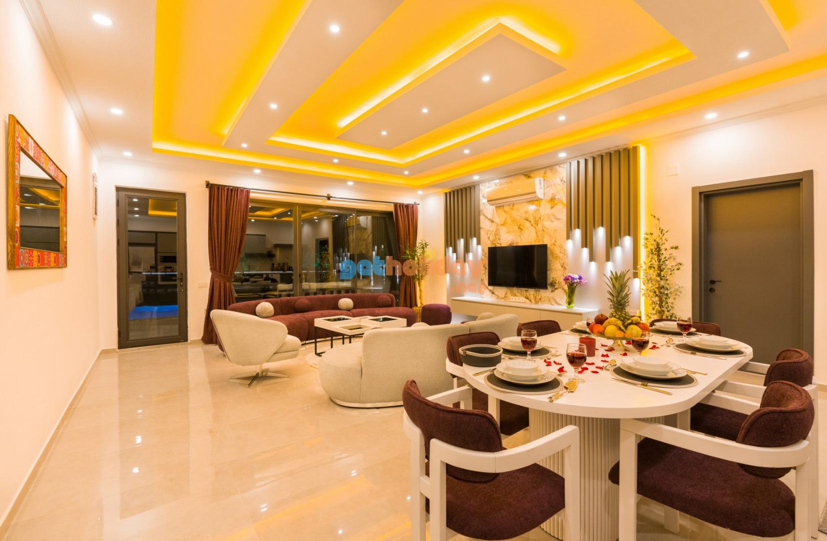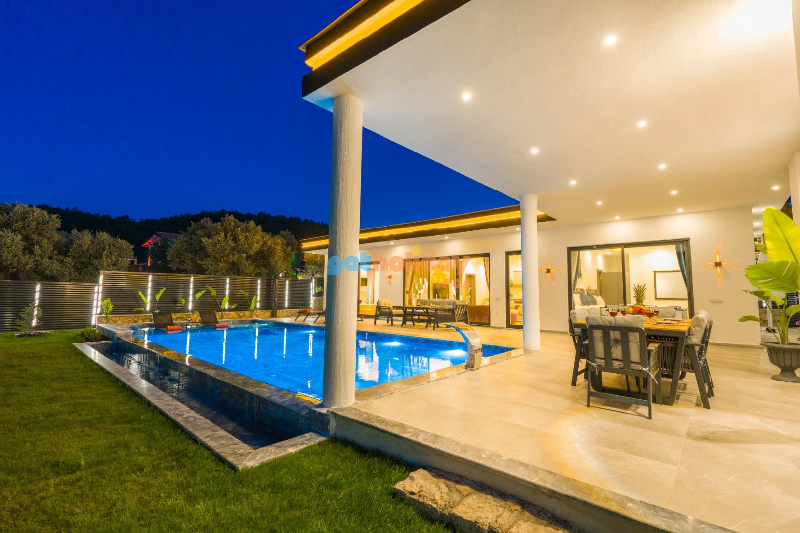 Salon : Modern ve lüks dizayna sahip salon içerisinde konforlu oturma grubu, TV, DVD oynatıcı, klima ve internet yer almaktadır. Salondan havuz terasına geçiş vardır.
