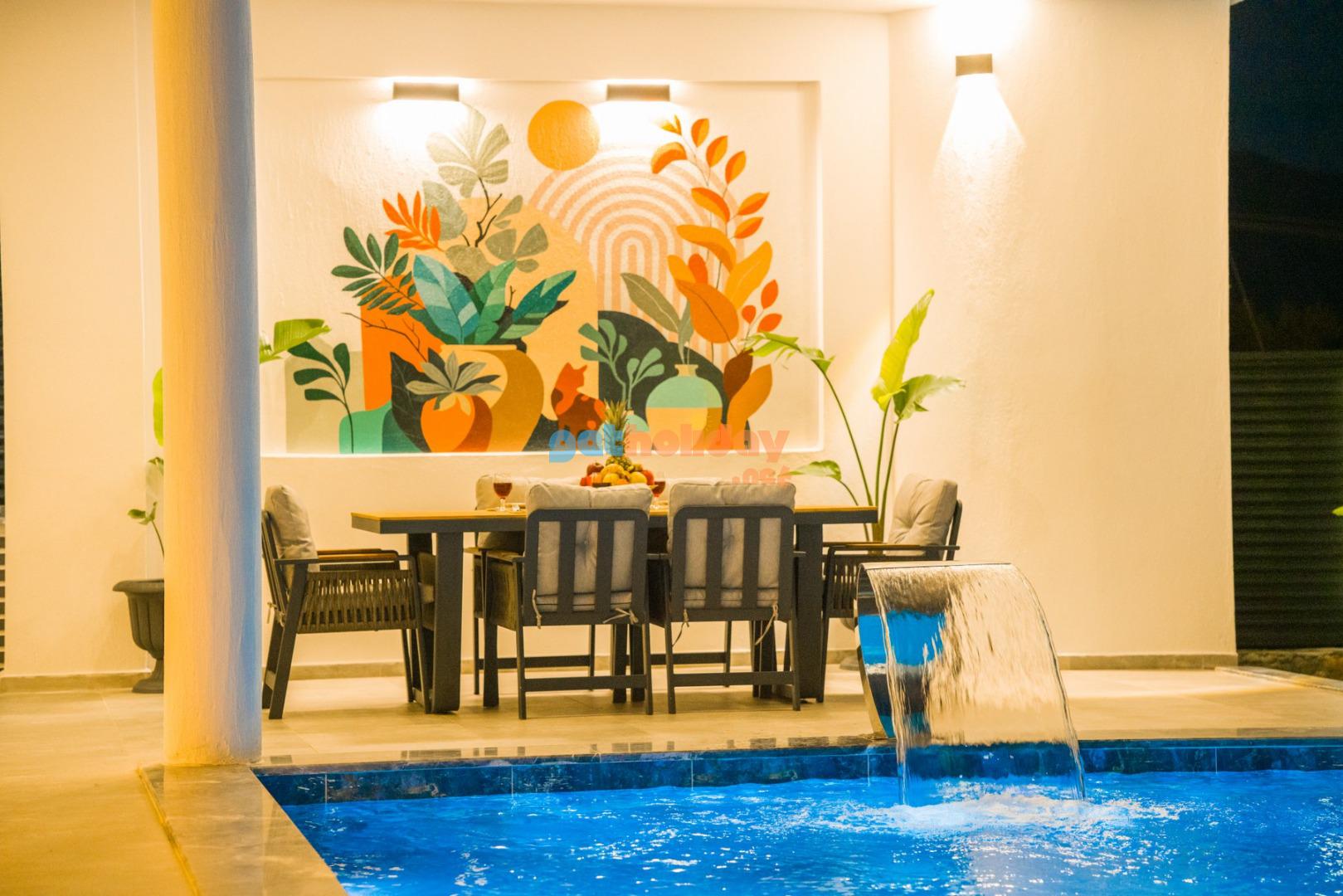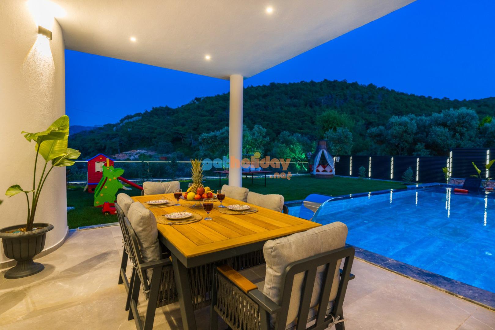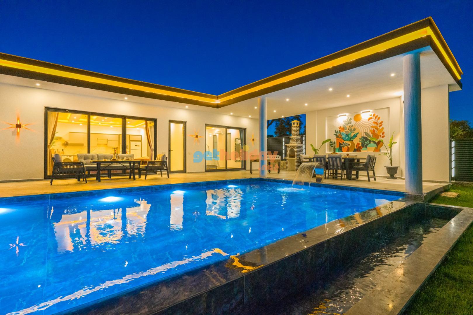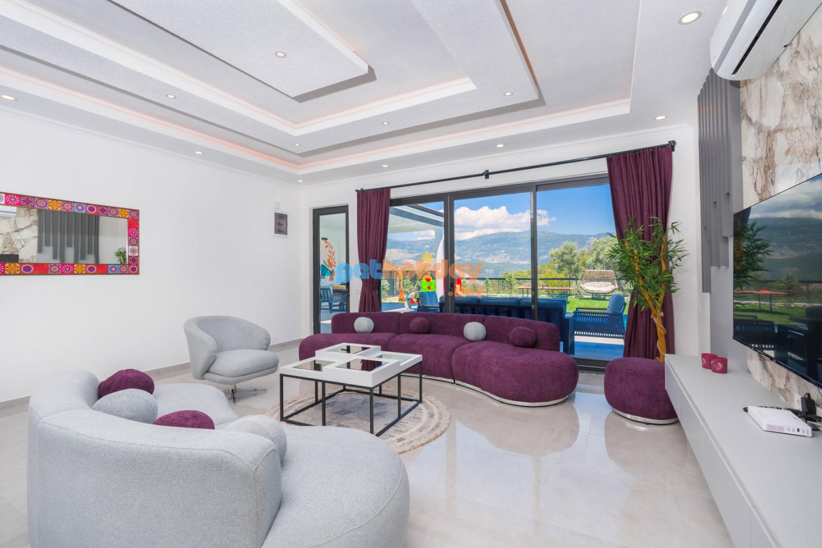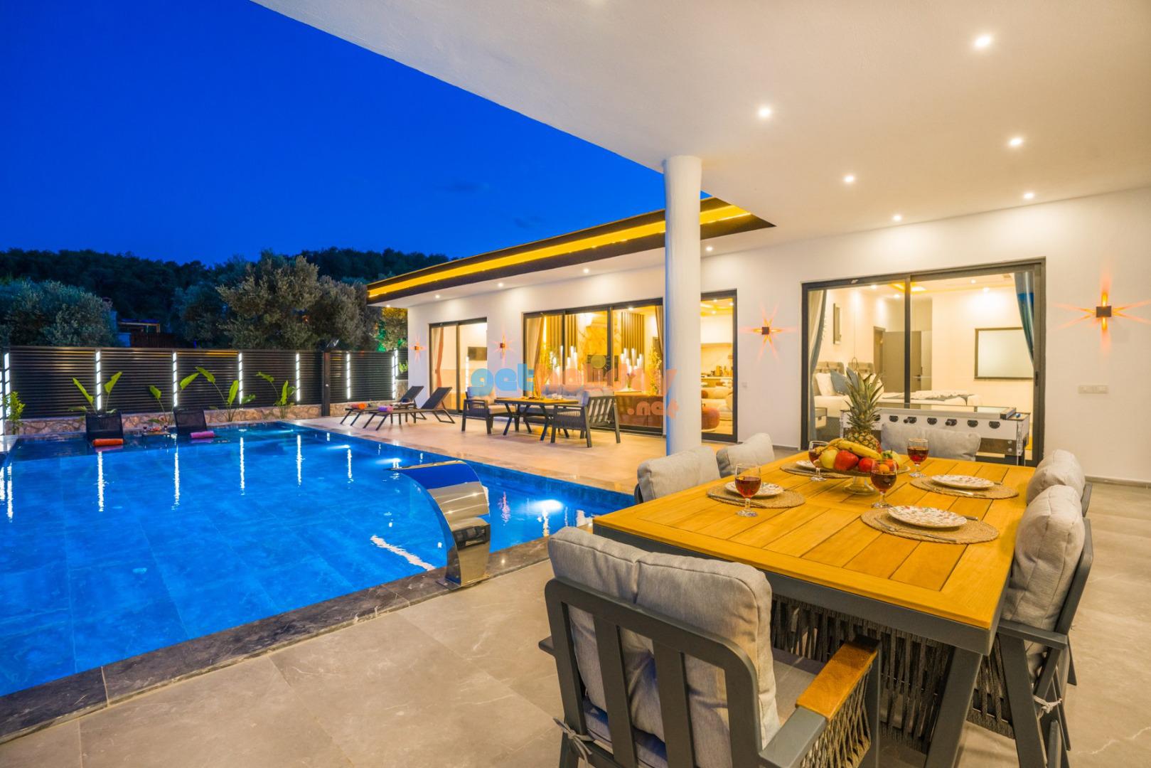 Salon : Modern ve lüks dizayna sahip salon içerisinde konforlu oturma grubu, TV, DVD oynatıcı, klima ve internet yer almaktadır. Salondan havuz terasına geçiş vardır.
