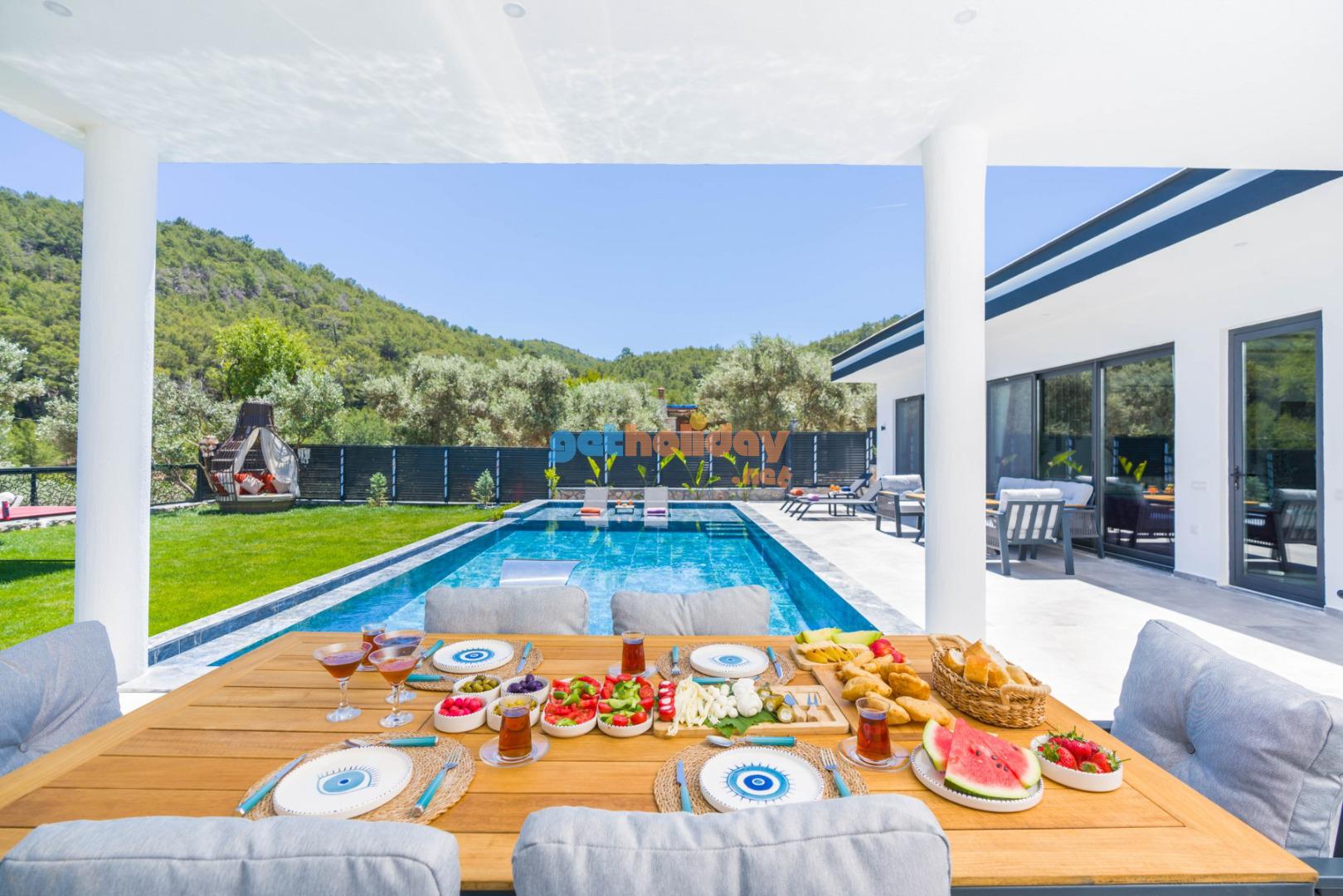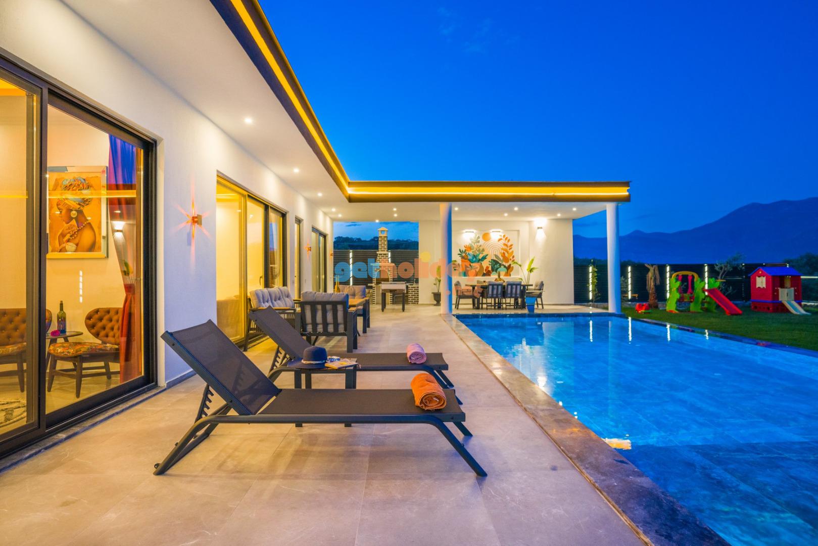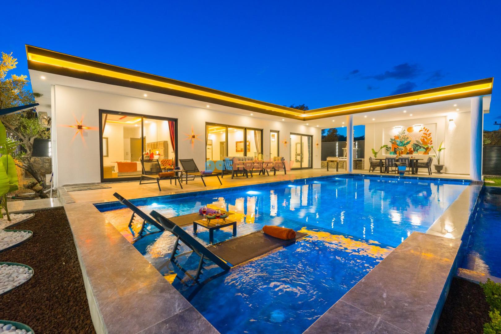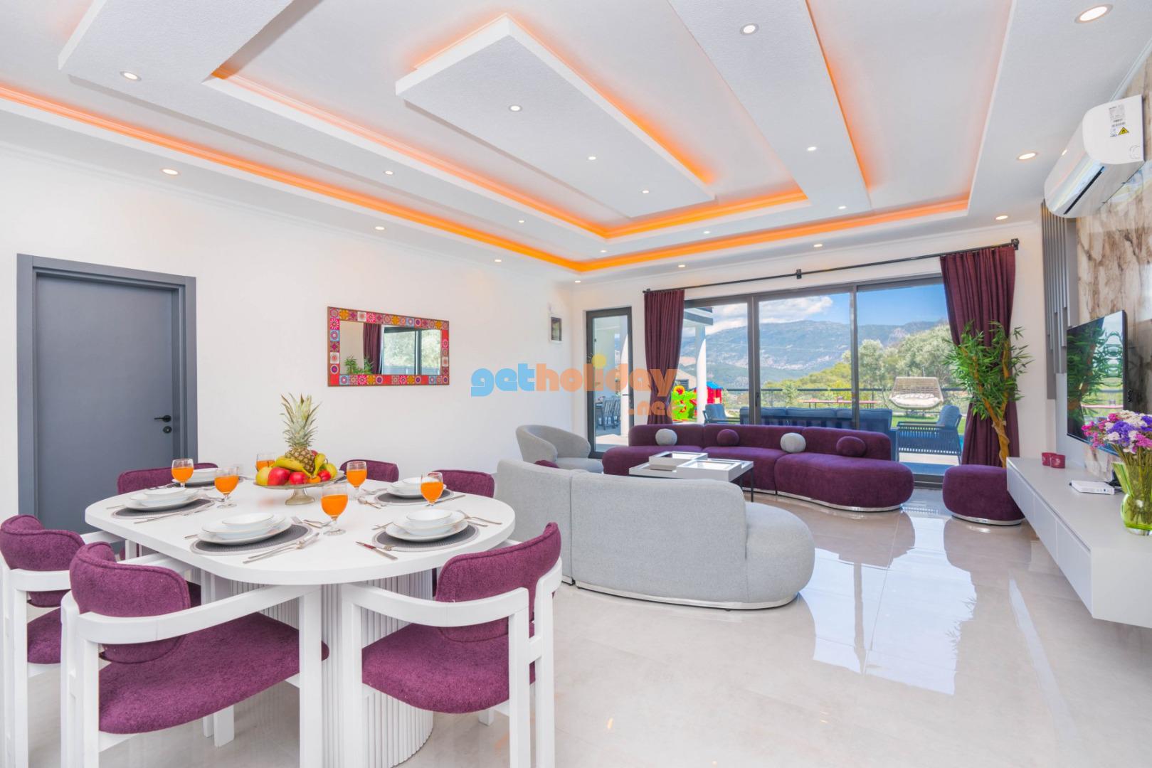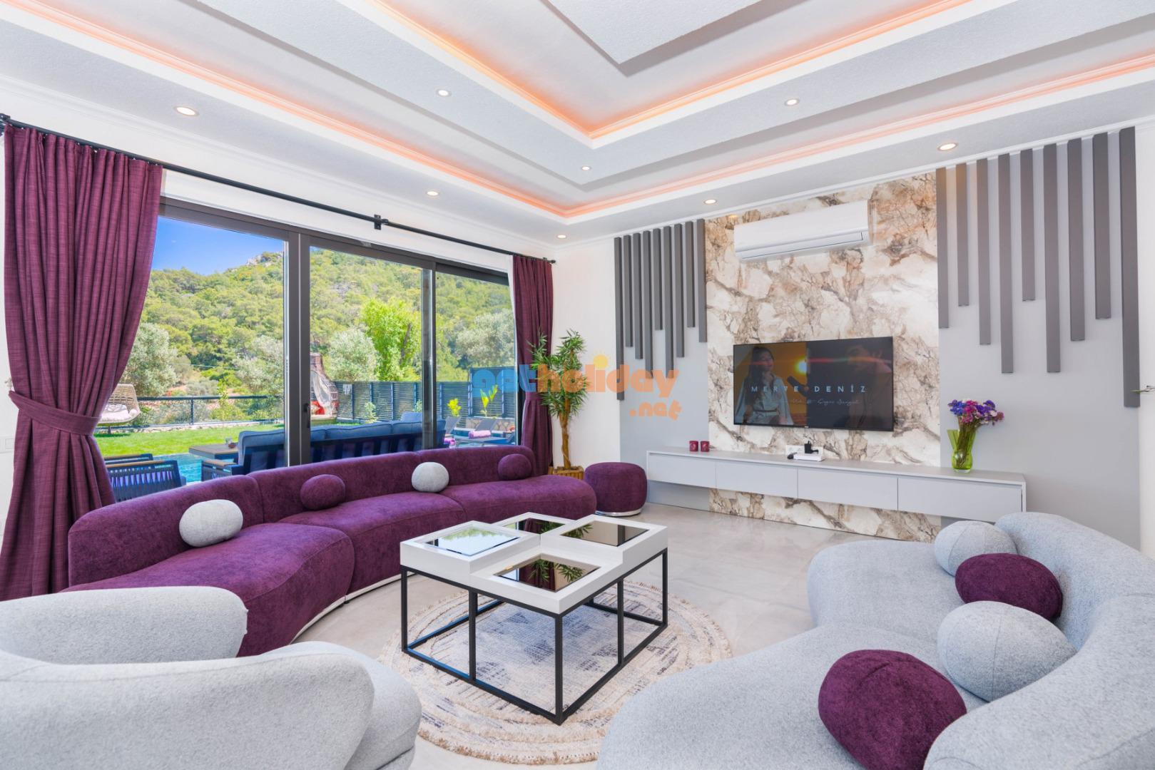 Salon : Modern ve lüks dizayna sahip salon içerisinde konforlu oturma grubu, TV, DVD oynatıcı, klima ve internet yer almaktadır. Salondan havuz terasına geçiş vardır.