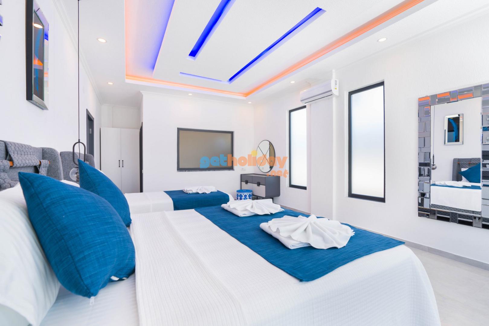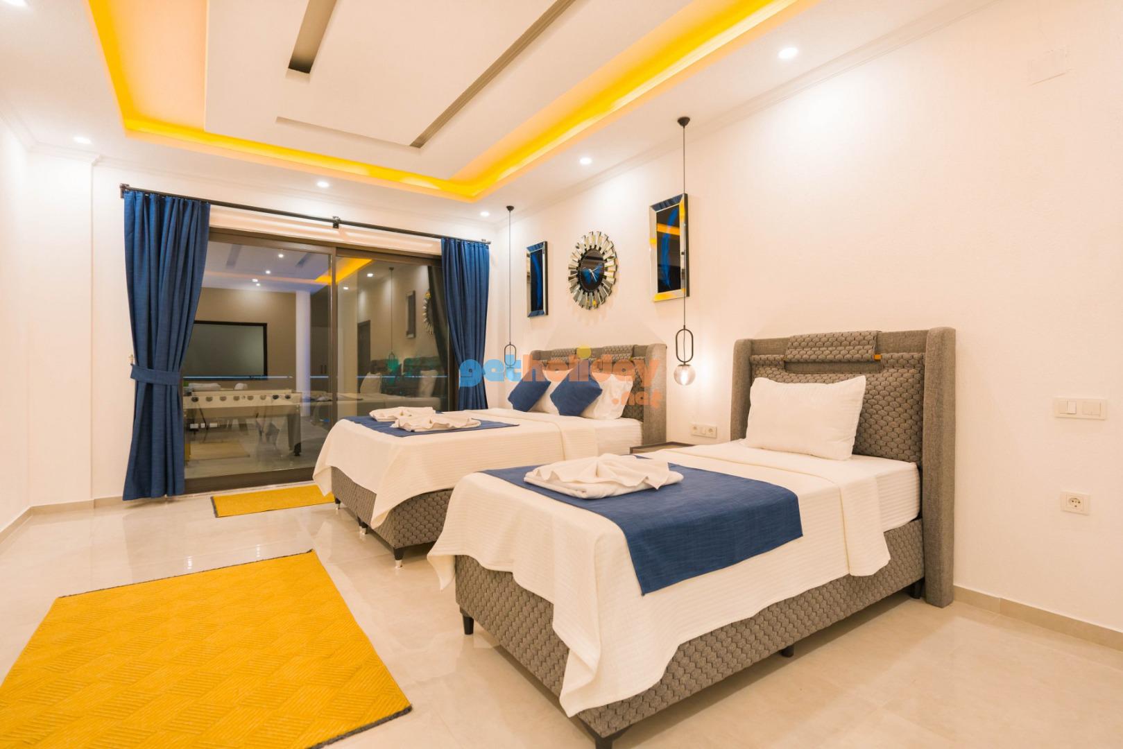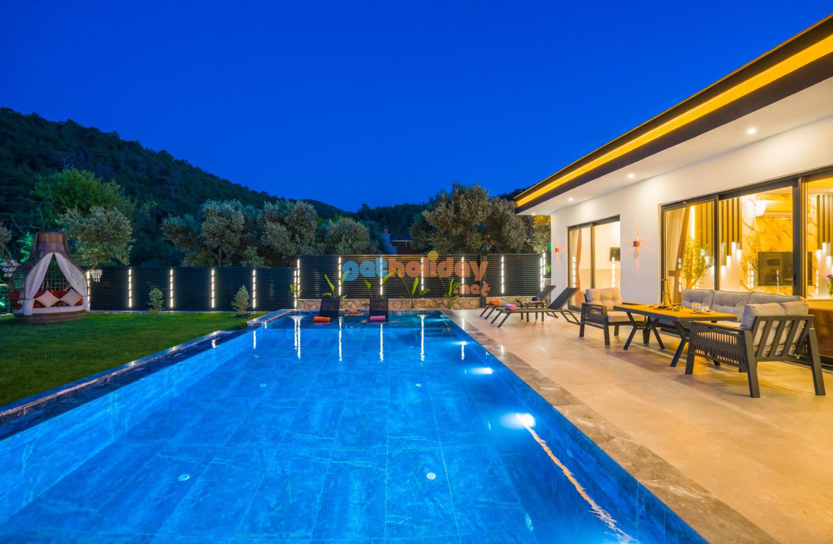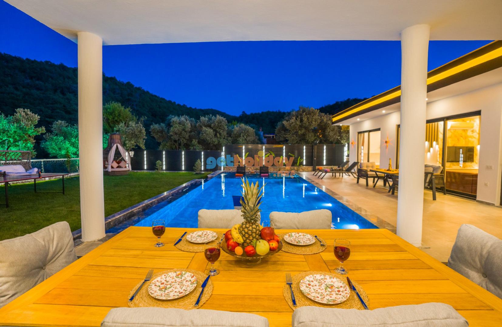 Salon : Modern ve lüks dizayna sahip salon içerisinde konforlu oturma grubu, TV, DVD oynatıcı, klima ve internet yer almaktadır. Salondan havuz terasına geçiş vardır.