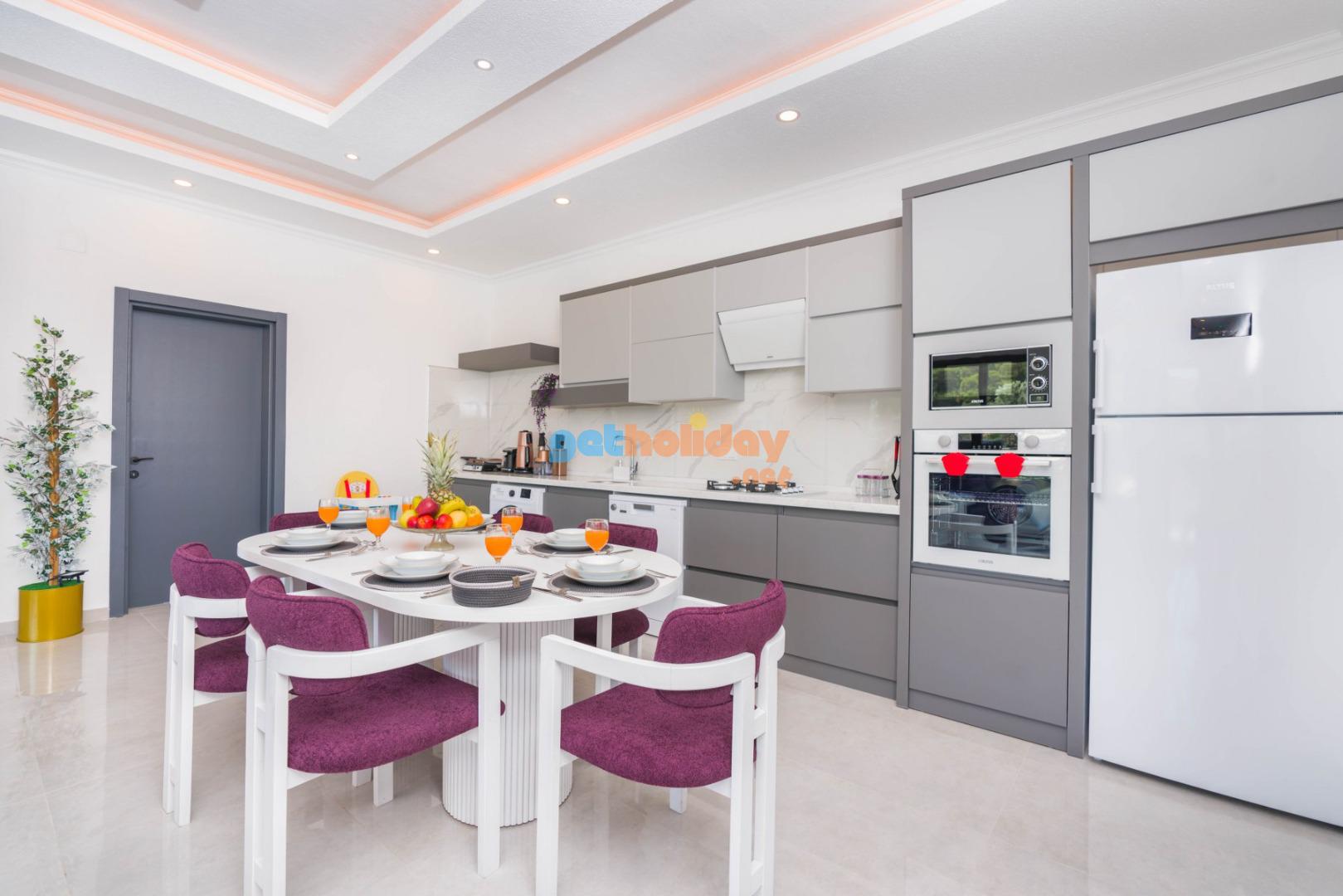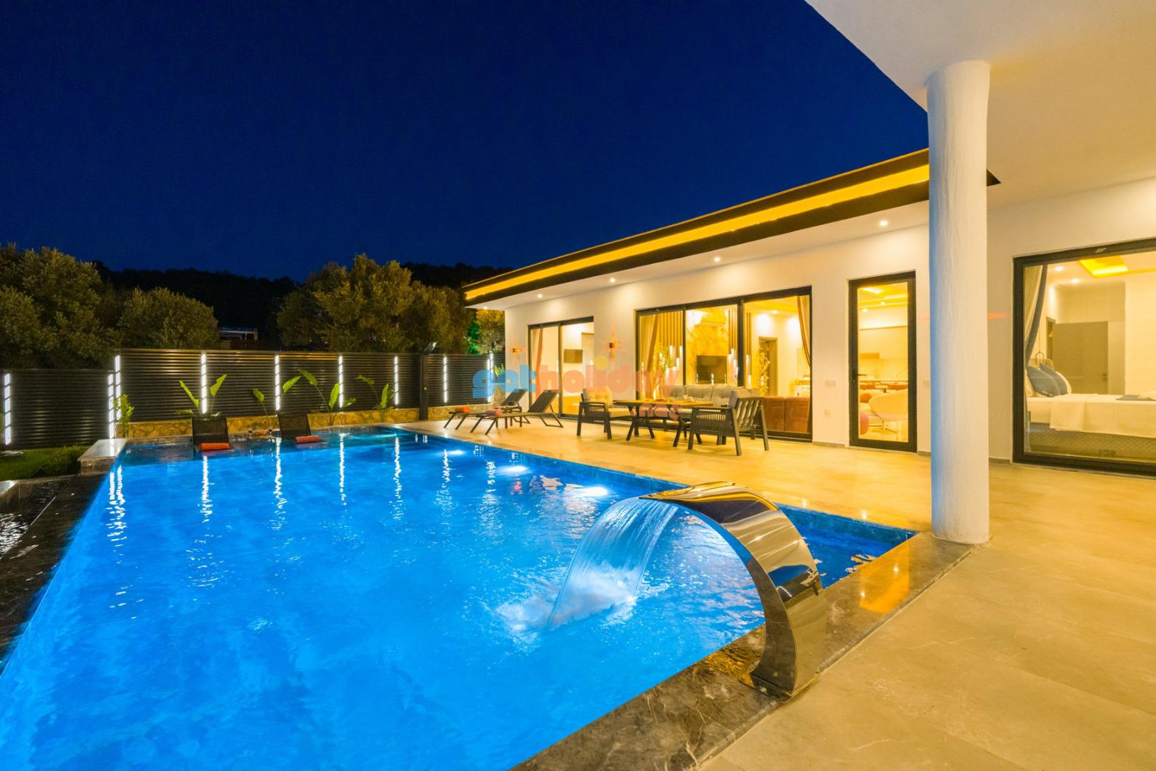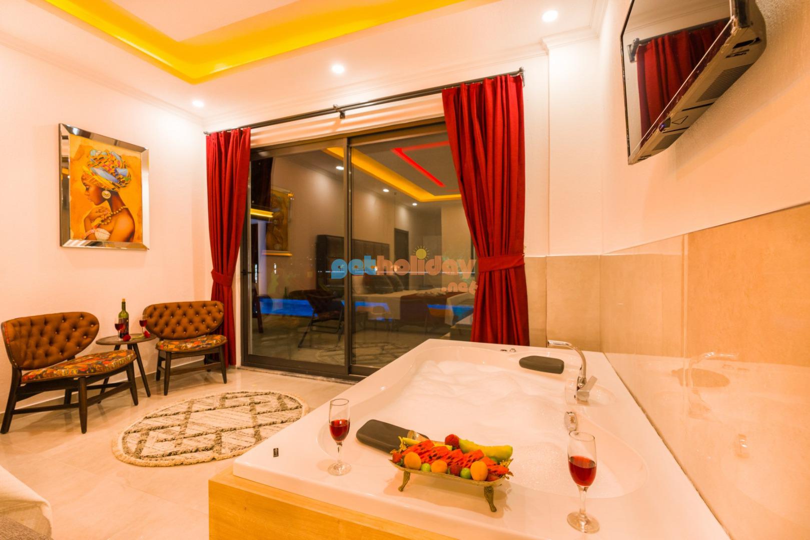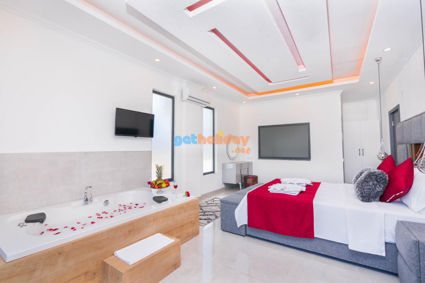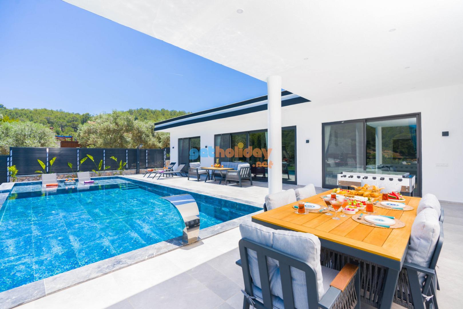 Salon : Modern ve lüks dizayna sahip salon içerisinde konforlu oturma grubu, TV, DVD oynatıcı, klima ve internet yer almaktadır. Salondan havuz terasına geçiş vardır.
