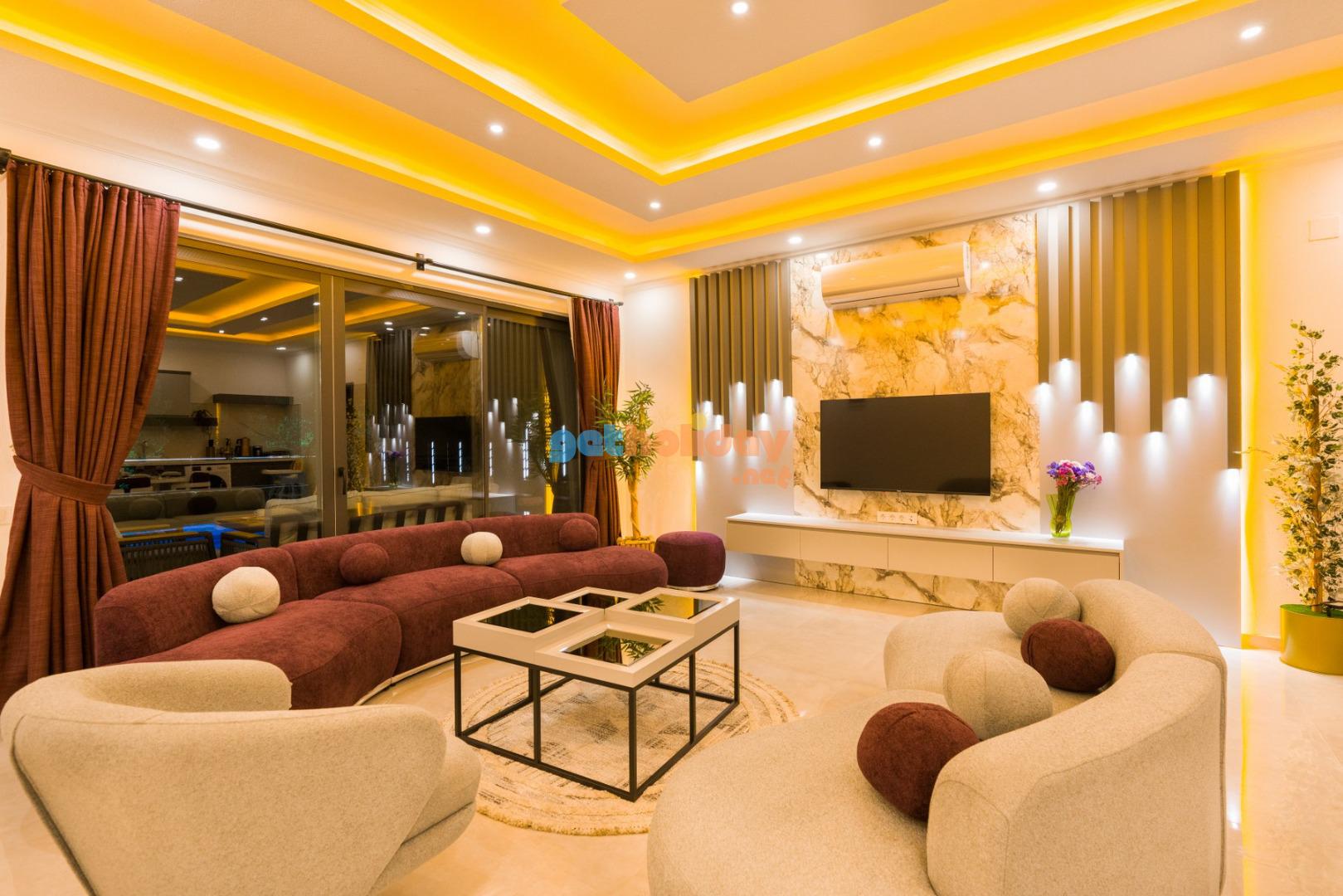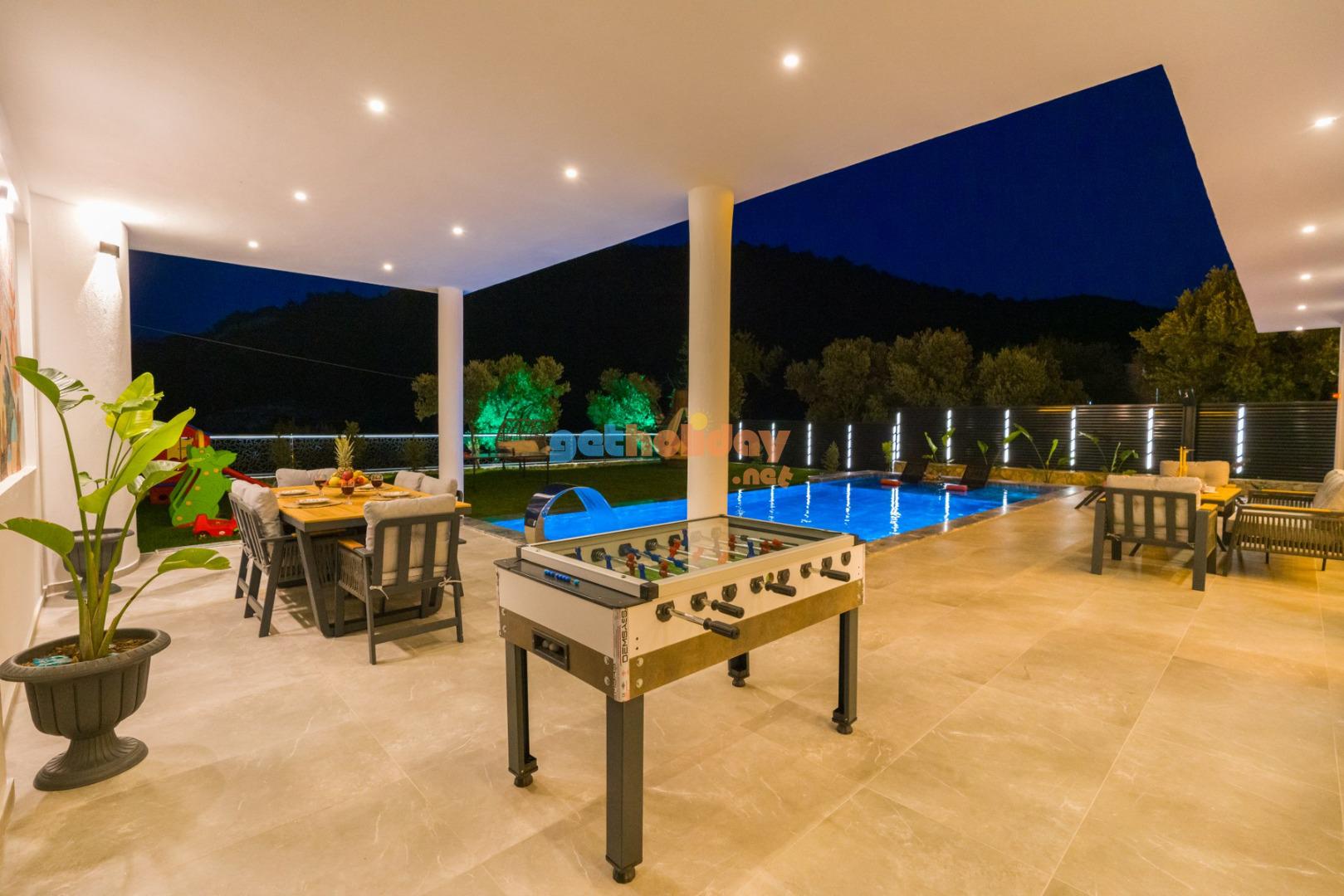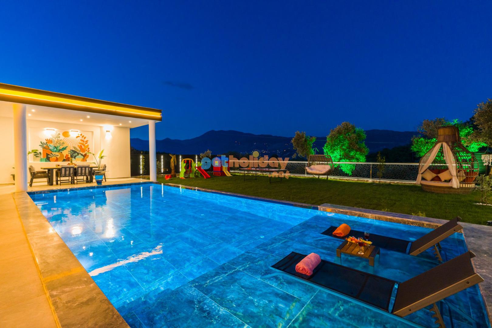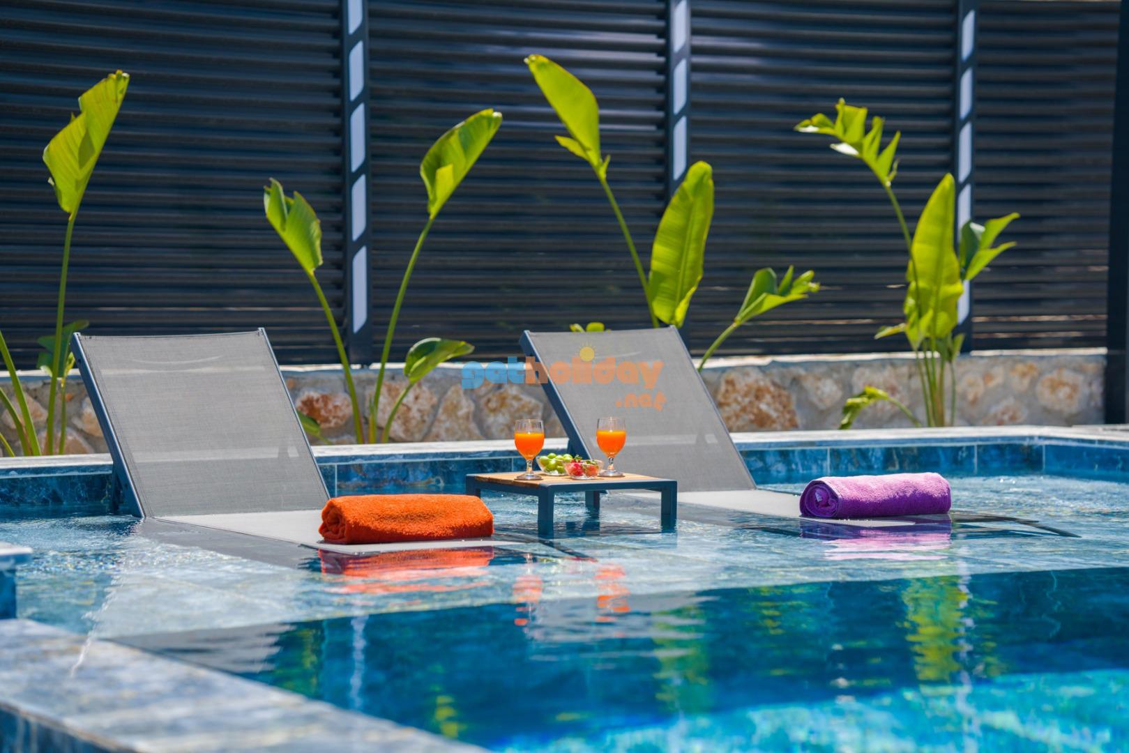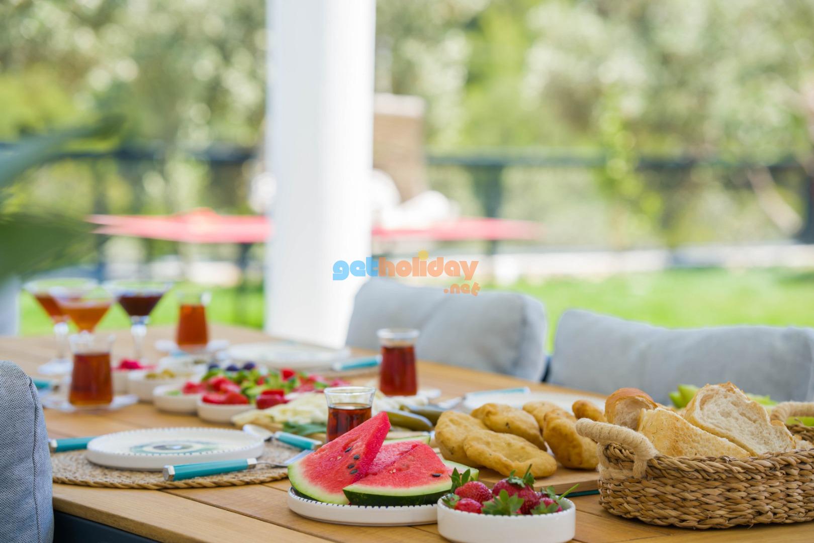 Salon : Modern ve lüks dizayna sahip salon içerisinde konforlu oturma grubu, TV, DVD oynatıcı, klima ve internet yer almaktadır. Salondan havuz terasına geçiş vardır.