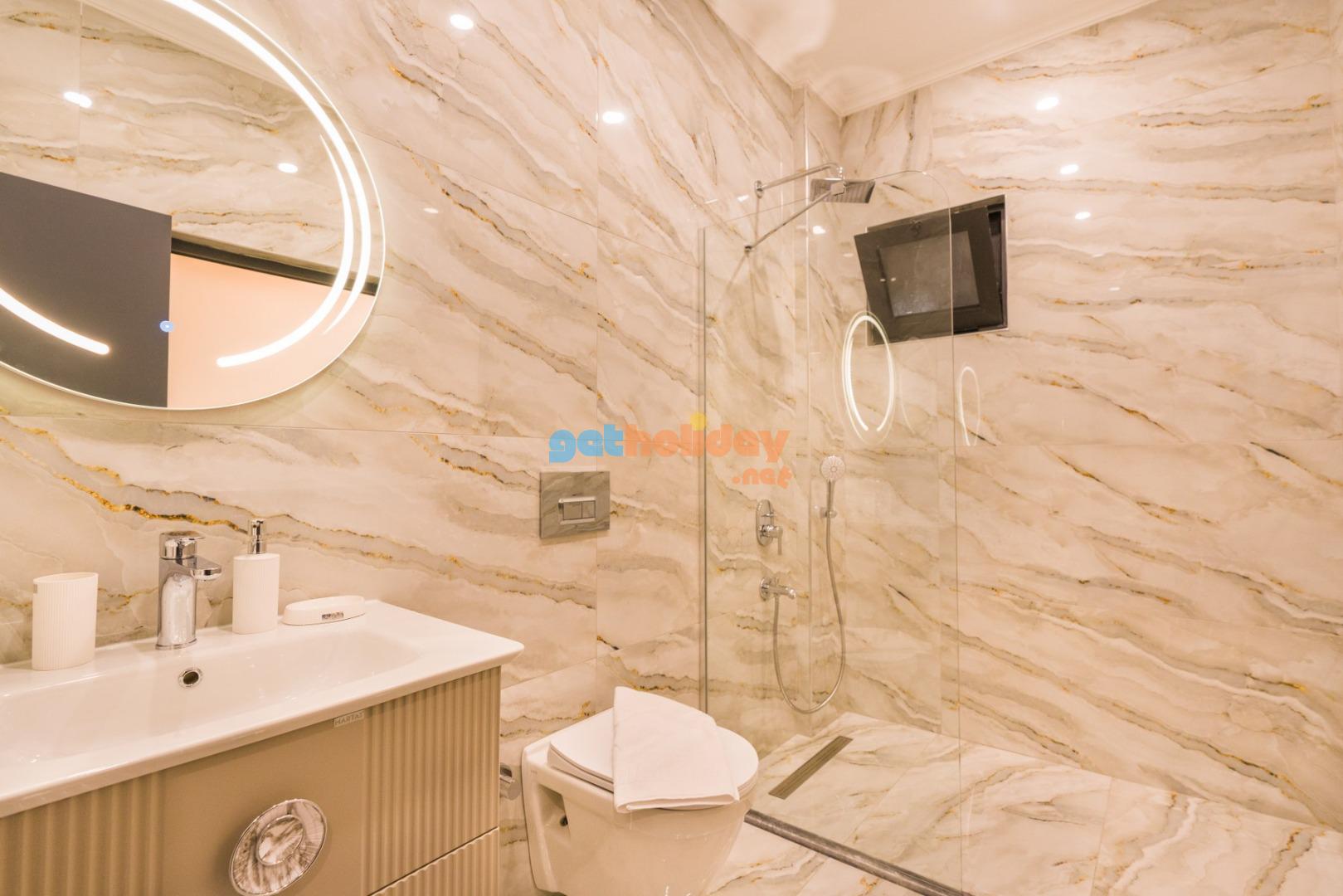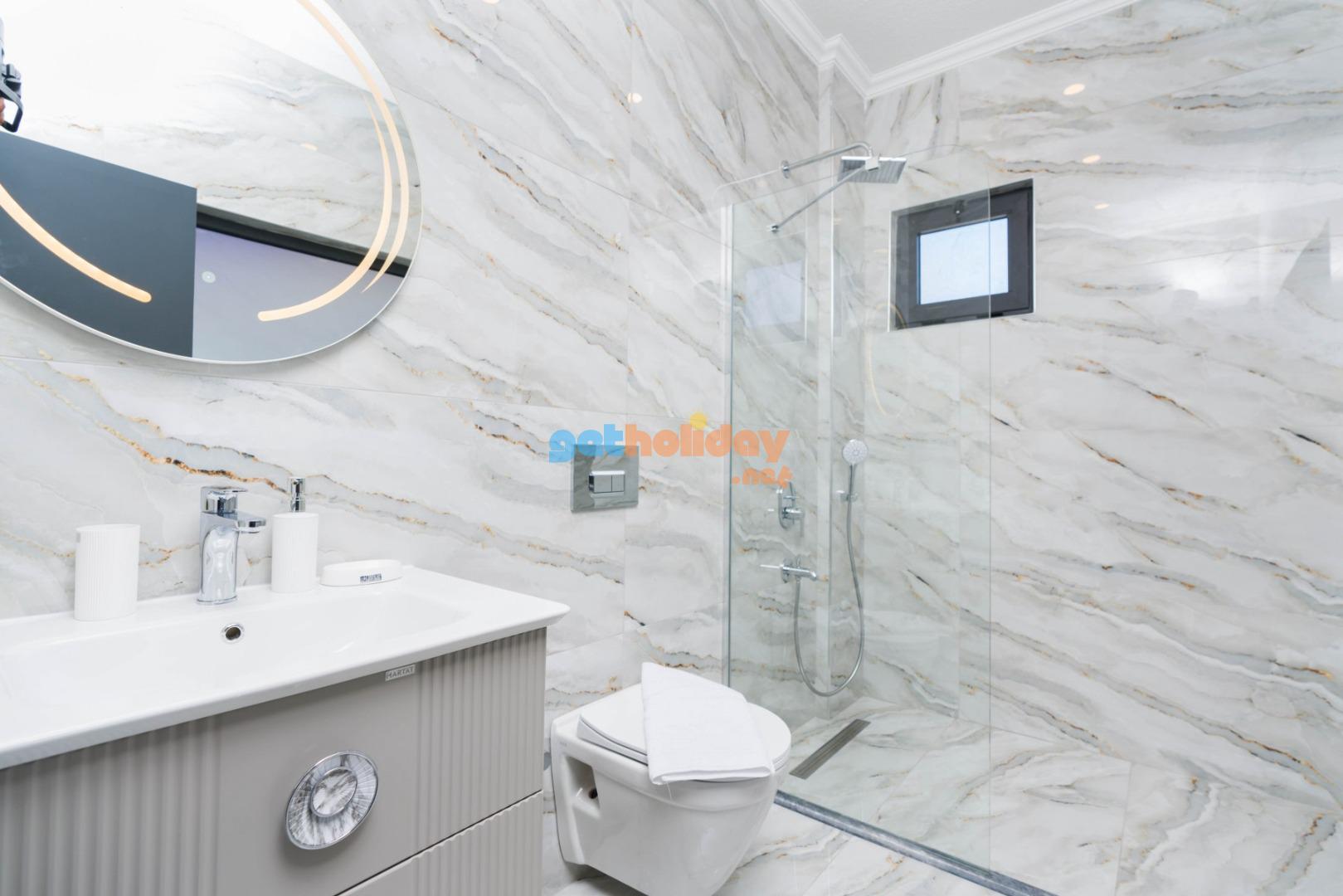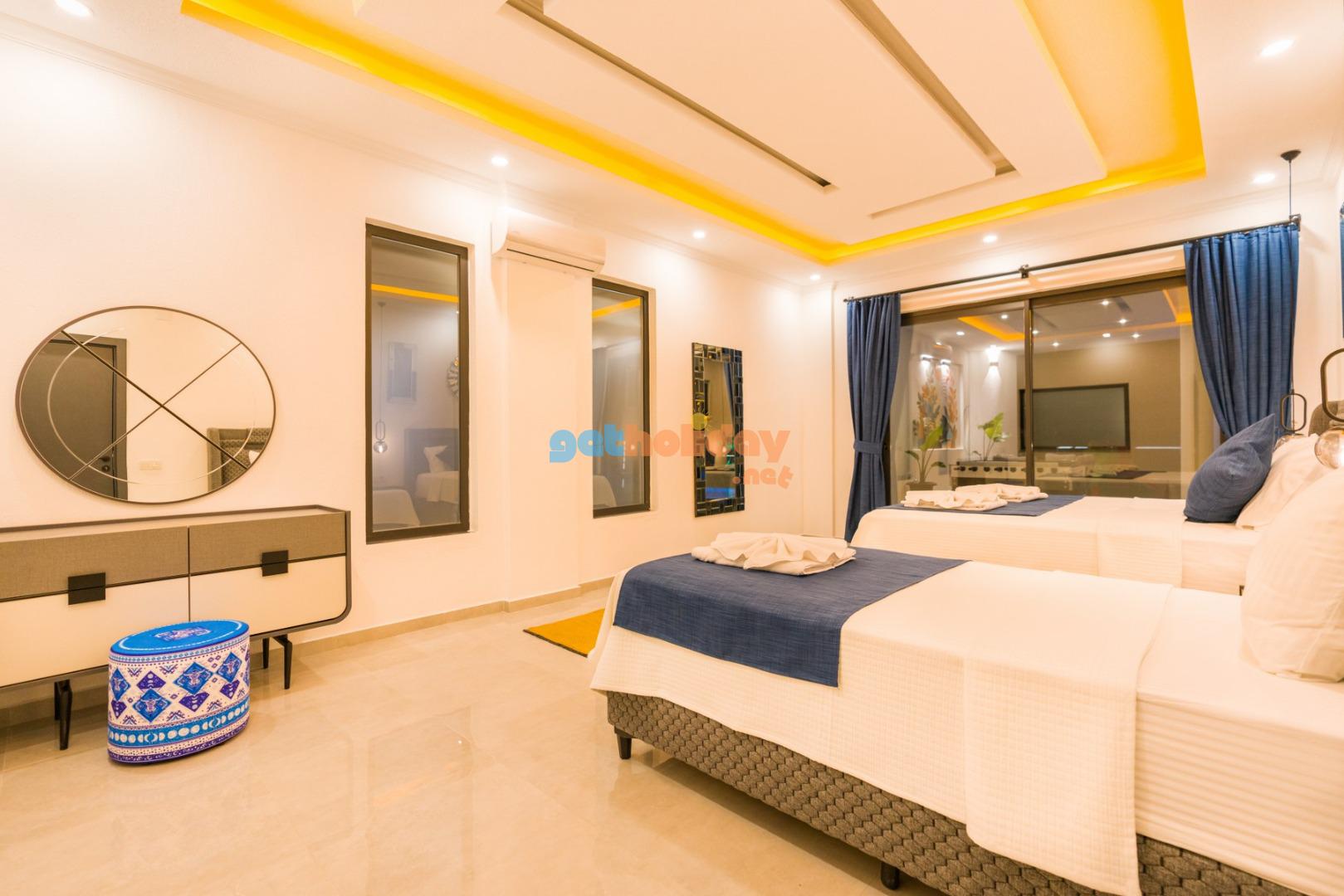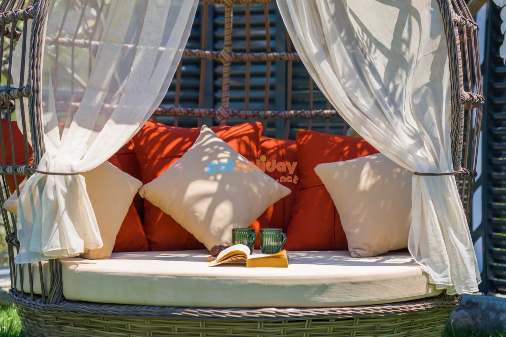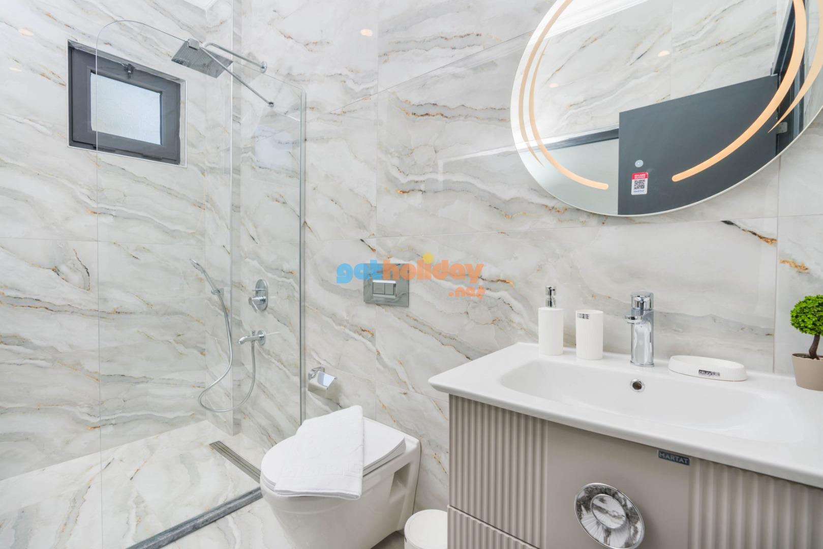 Salon : Modern ve lüks dizayna sahip salon içerisinde konforlu oturma grubu, TV, DVD oynatıcı, klima ve internet yer almaktadır. Salondan havuz terasına geçiş vardır.