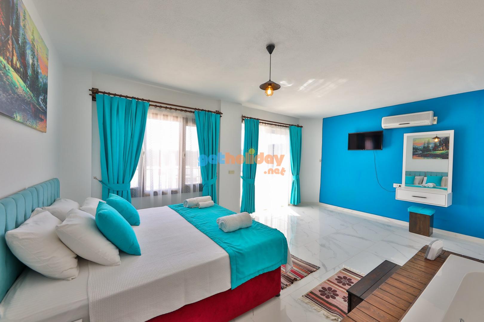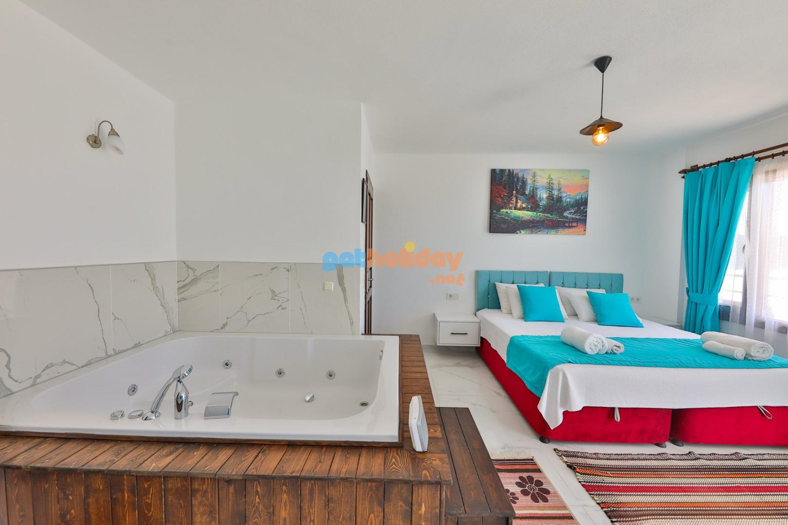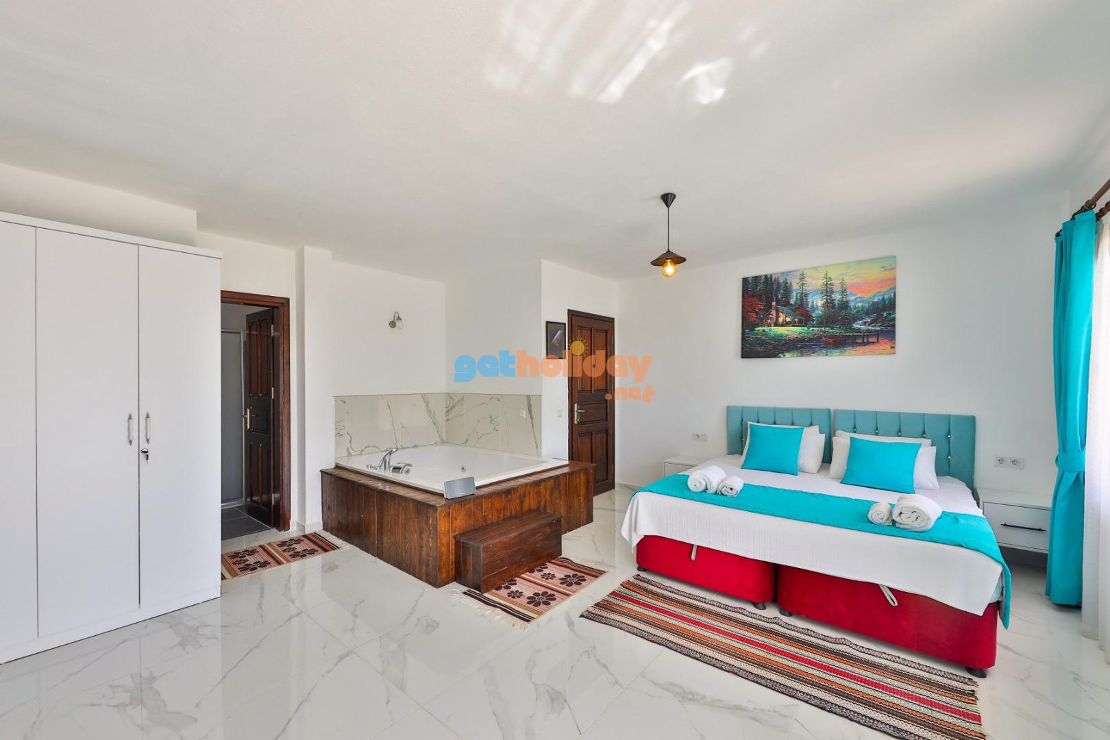 1 – Yatak Odası :Suit yatak odasıdır. 1 adet çift kişilik yatak,klima,elbise dolabı,komidin,makyaj masası,jakuzi ve banyo&wc yer almaktadır.