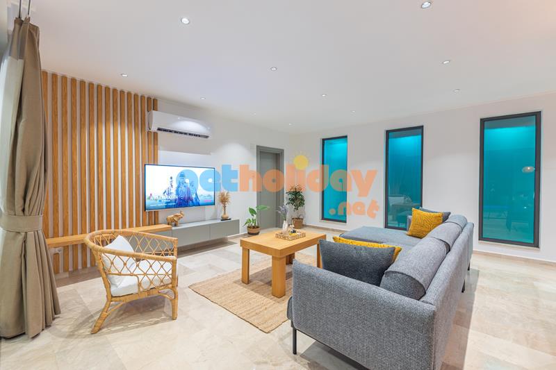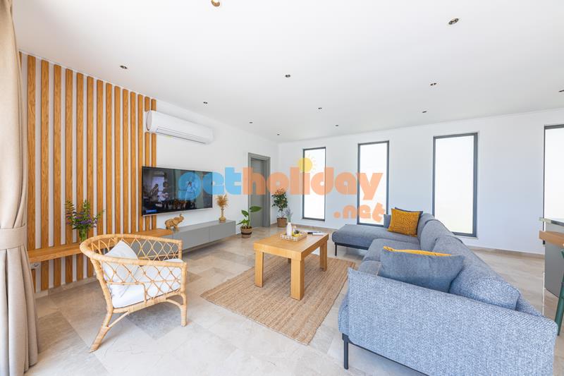 Salon : Doğa manzaralı ve modern eşyalarla tasarlanmış salonda oturma grubu, sehpa, televizyon, uydu alıcı, internet bulunmaktadır. Havuz terasına çıkış yapılabilmektedir.