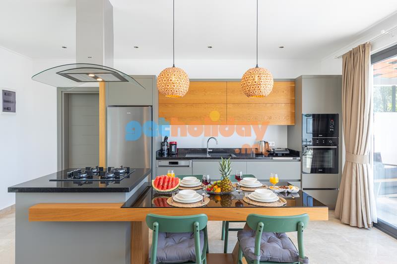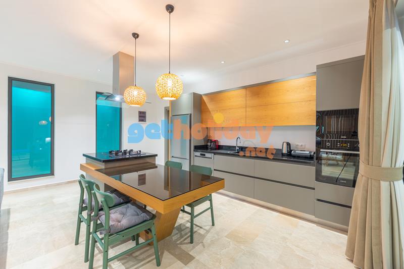 Mutfak : Beyaz dolapları ile modernliği yakalayan Amerikan mutfak içerisinde buzdolabı, bulaşık makinesi, ocak, fırın, su ısıtıcısı, tost makinesi, 4 kişilik yemek masası, yemek takımı ve yemek pişirme araç gereçleri yer almaktadır.