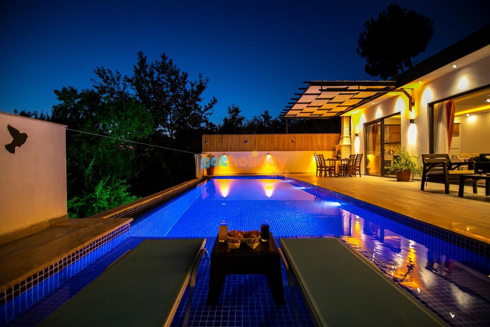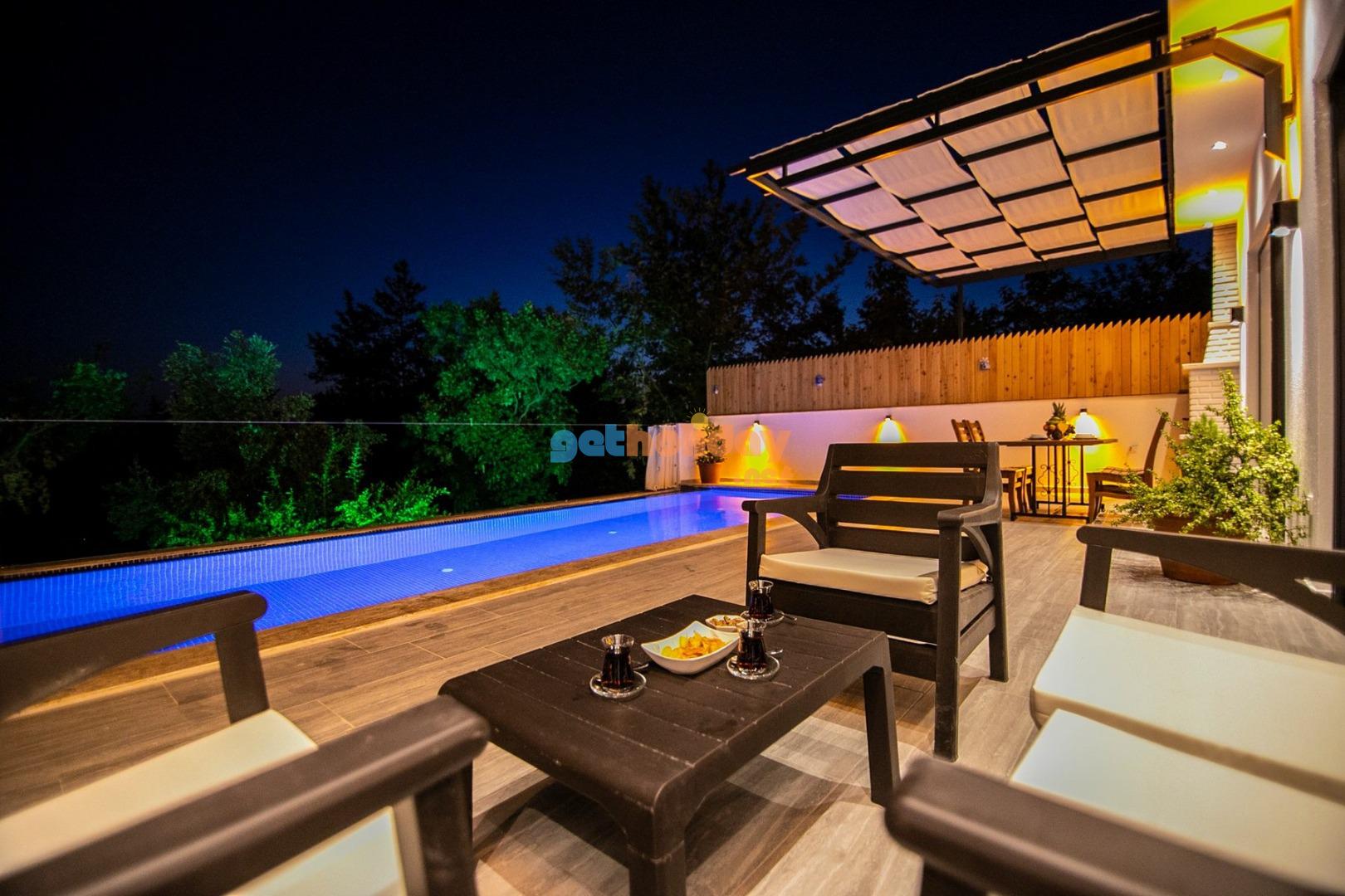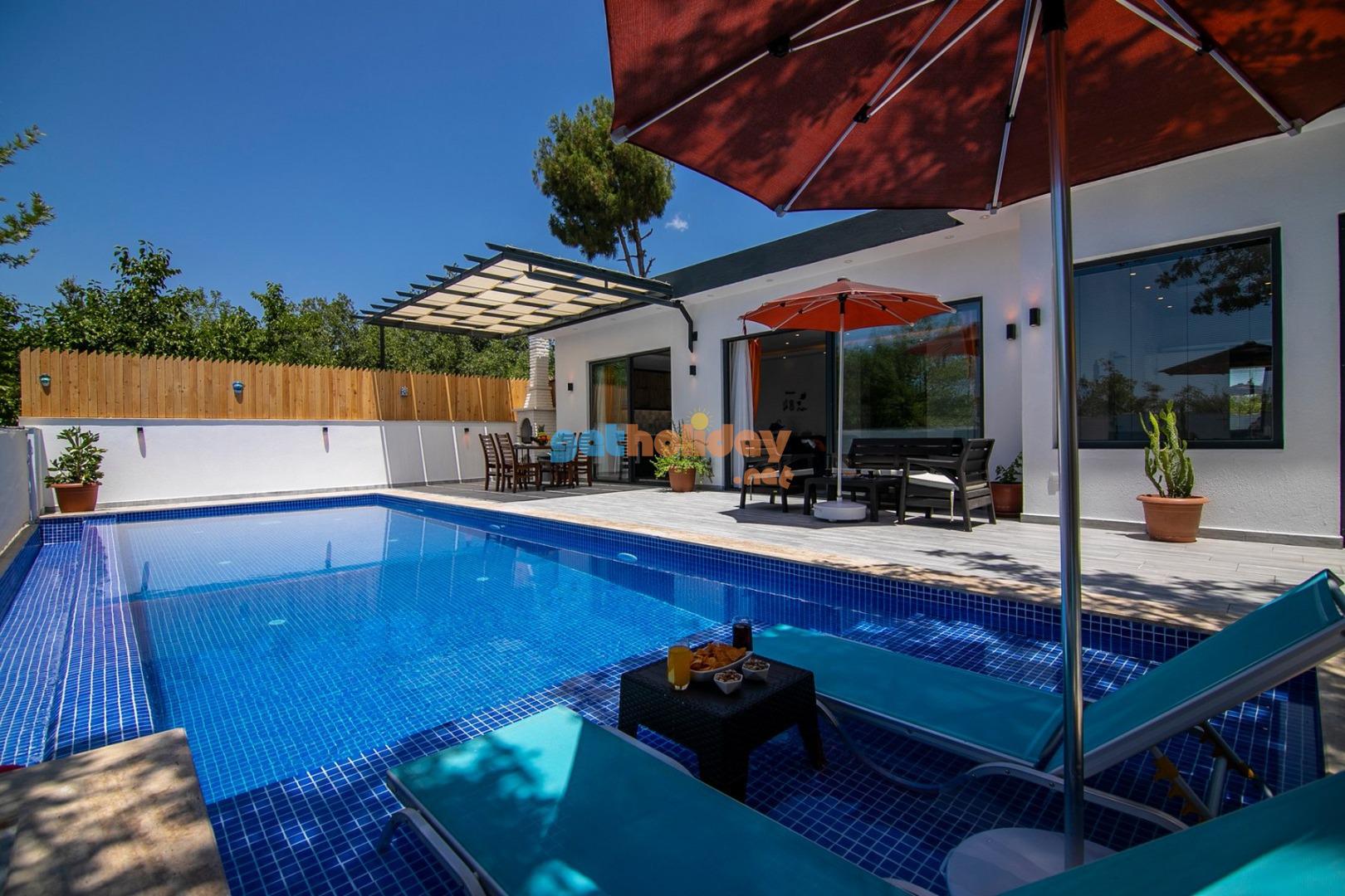 Bahçe : Villamızın bahçesinde özel yüzme havuzu, güneşlenmeniz için 2 adet şezlong, güneşlenme terası, 4 kişilik masa, oturma grubu, mangal keyfiniz için barbekü, güneş şemsiyesi bulunmaktadır.