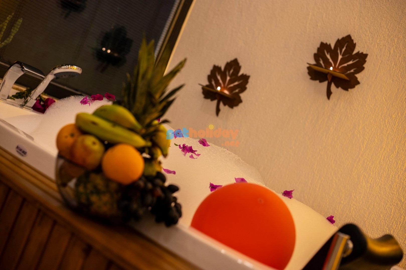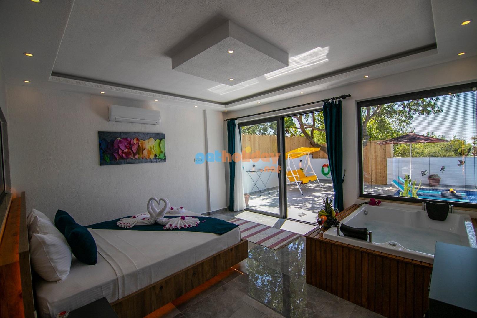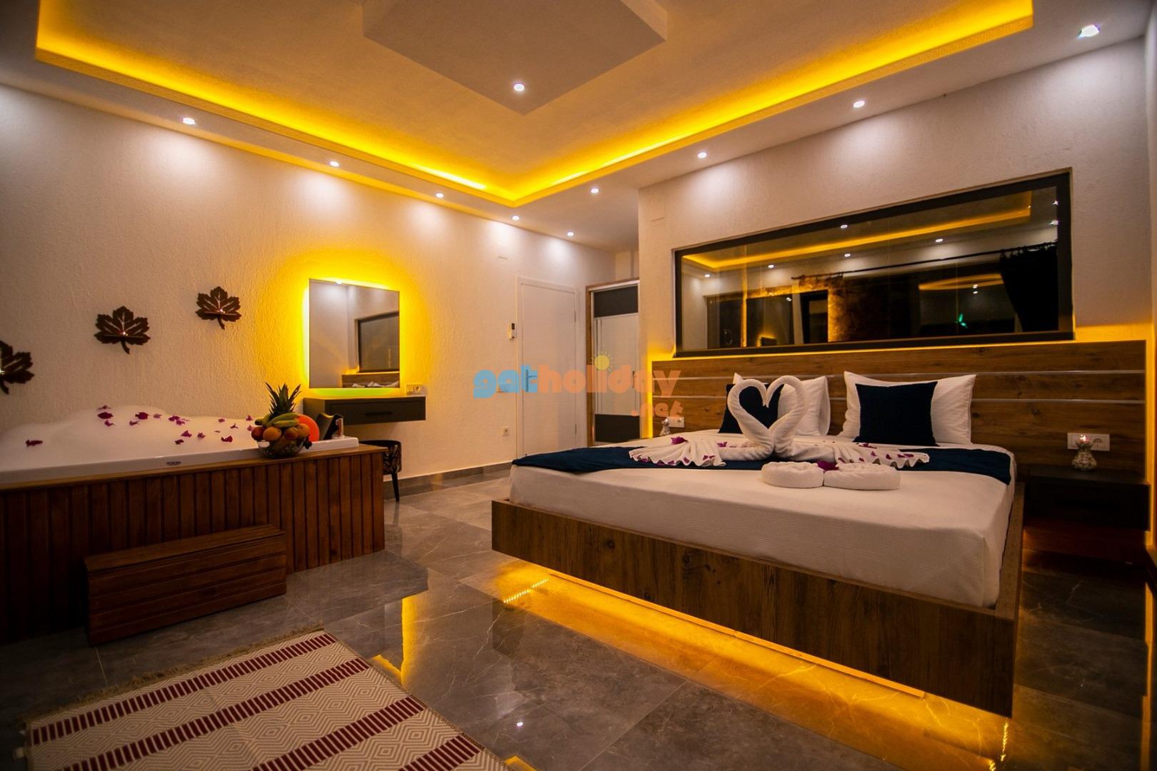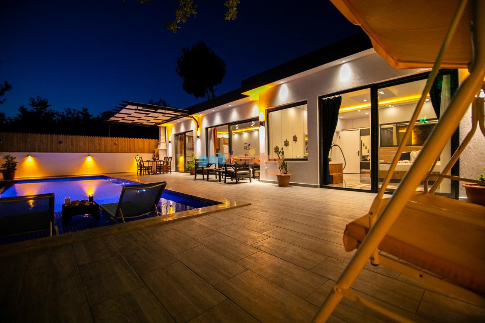 Son derece itinayla tasarlanmış muhafazakar villamız 1 yatak odalı, çiftlerimizin tercih edeceği jakuzili balayı villasıdır. Havuz ve havuz terası dışarıdan korunaklıdır, bu sayede rahat rahat tatilinizi geçirebilirsiniz. Doğa ile iç içe olan villamız sessiz sakin bir konumdadır. Balayı çifti iseniz düğün yorgunluğunu ve stresini villamızda atabilirsiniz.