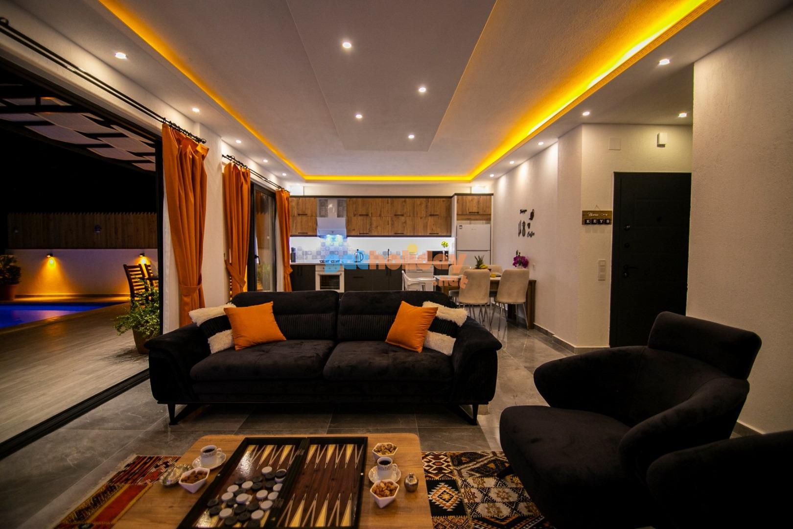 Salon : Şık bir oturma grubu ile klima, televizyon, internet, uydu, koltuk, sehpa ile ferah bir salon bekliyor olacaktır. Havuz terasına çıkış yapılmaktadır.