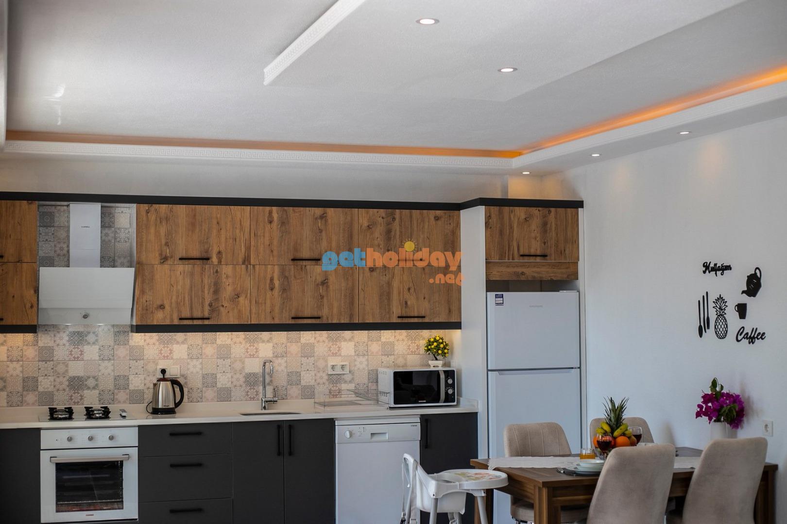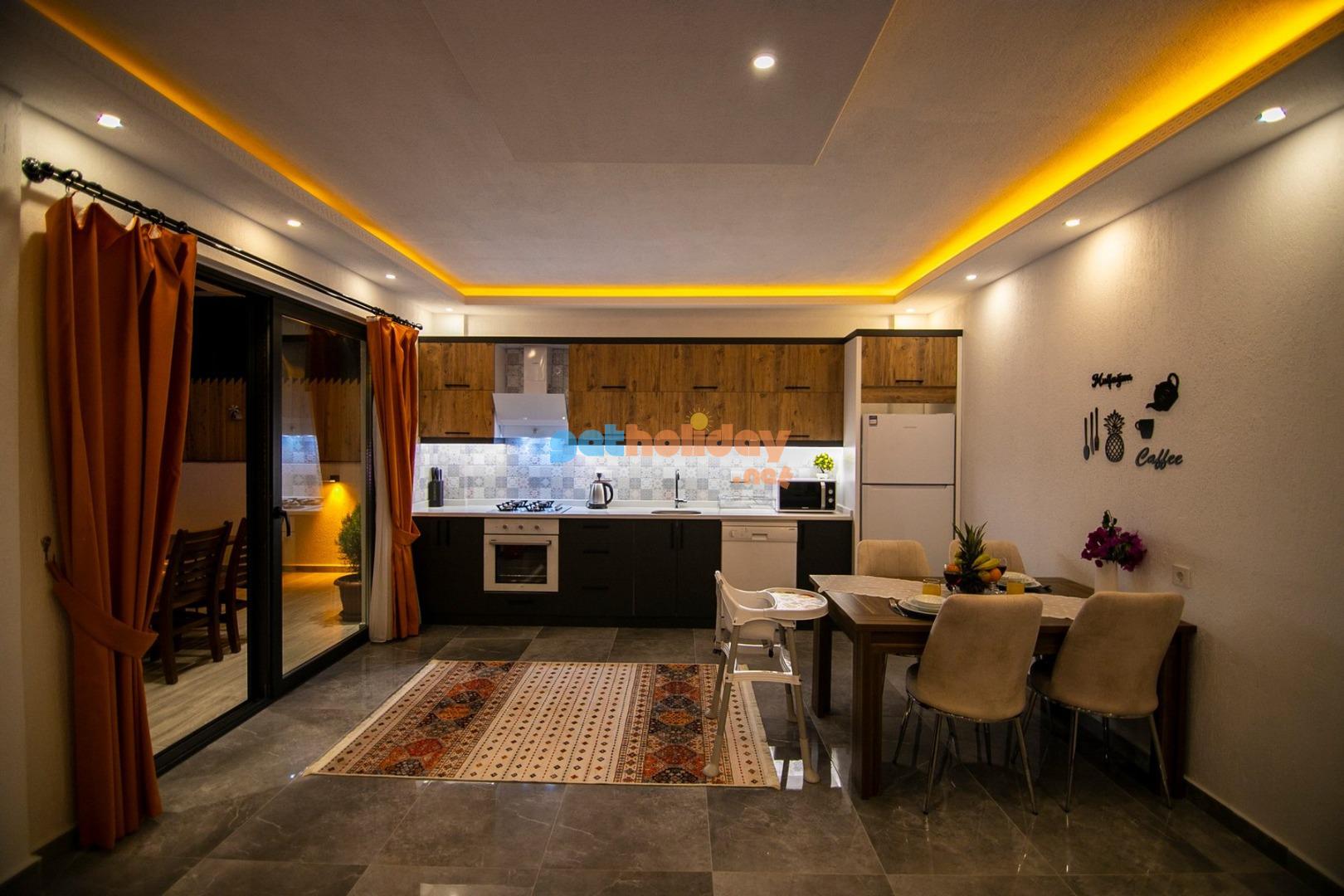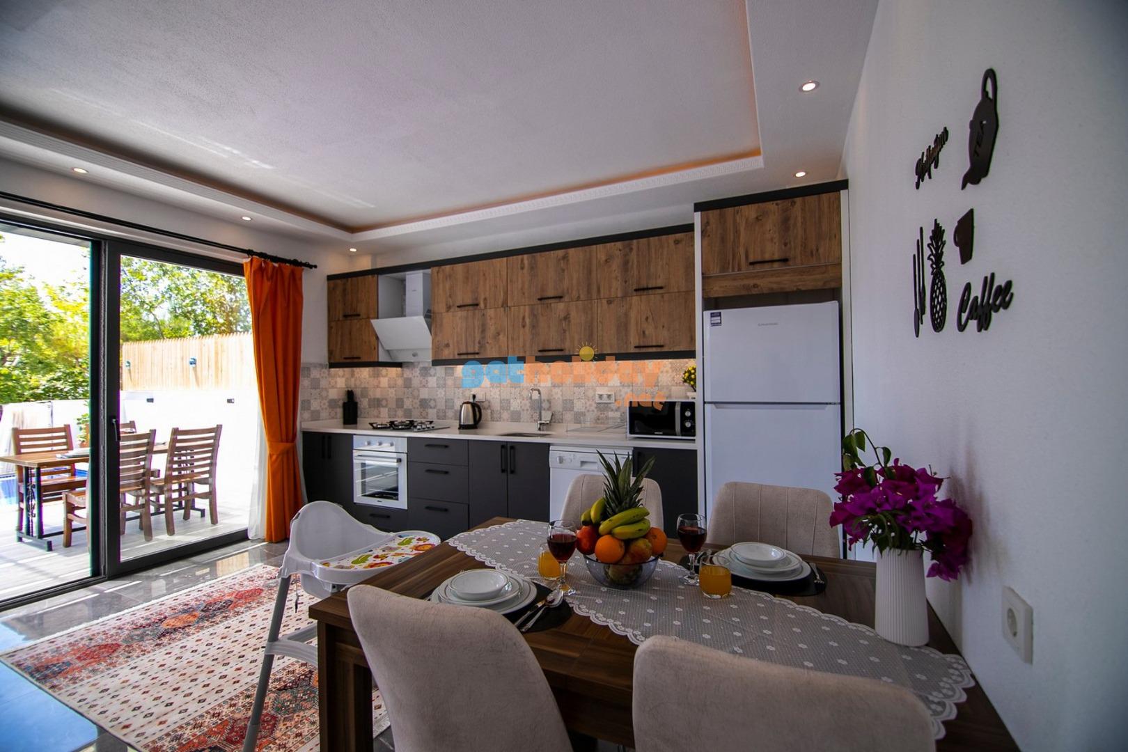 Mutfak : Villamızın geniş Amerikan mutfağı ile sizlere kendi evinizin mutfağı gibi hissettirecek. Ayrıca mutfakta klima, bulaşık makinası, buzdolabı, çamaşır makinası, su ısıtıcısı, fırın, 4`lü ocak seti ve tava tencere vb. mutfak araç gereçlerini kullanma fırsatını sizlere sunuyoruz.