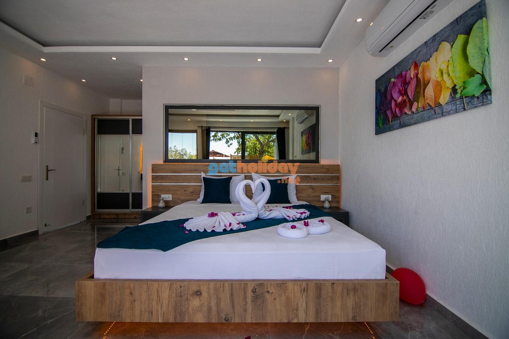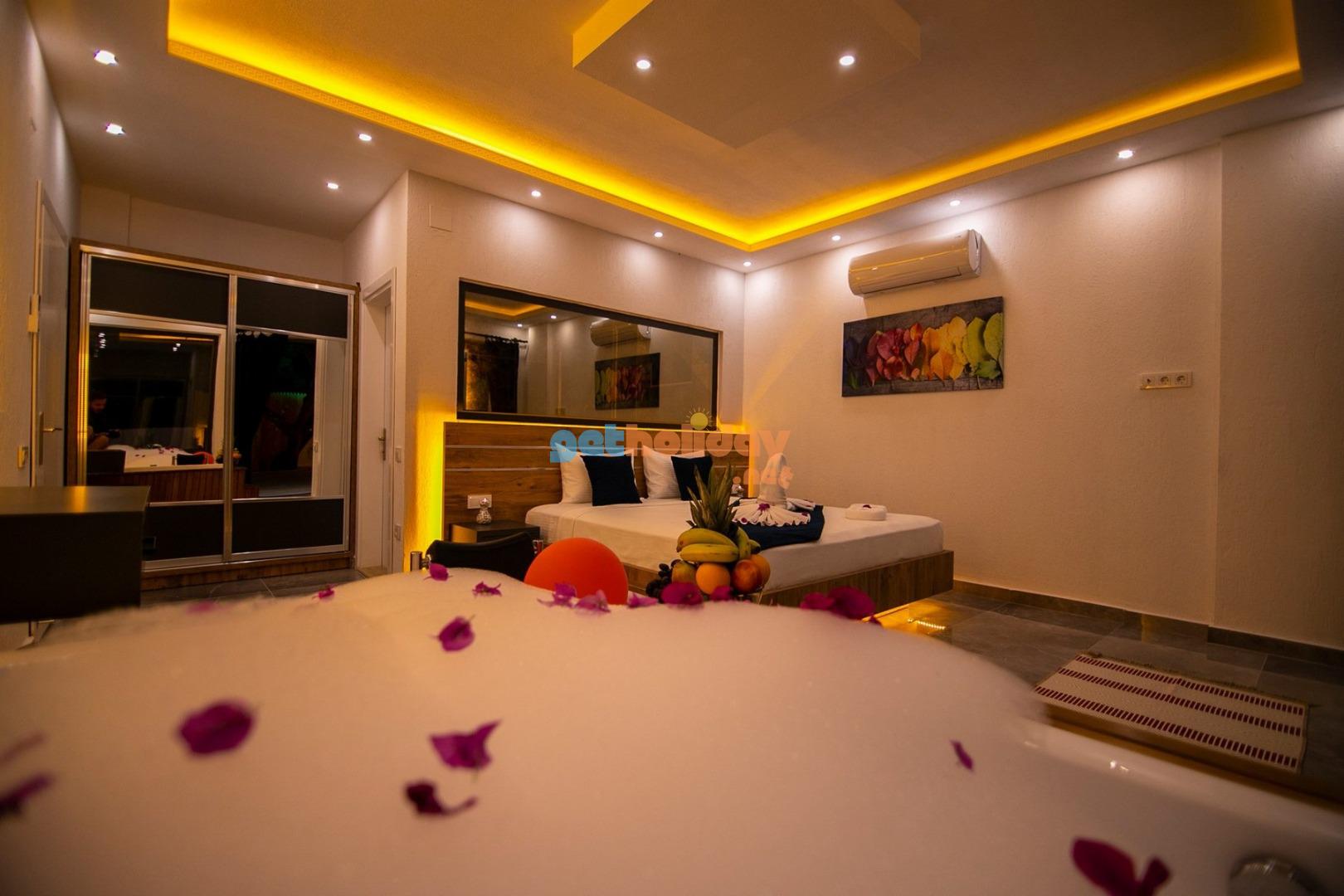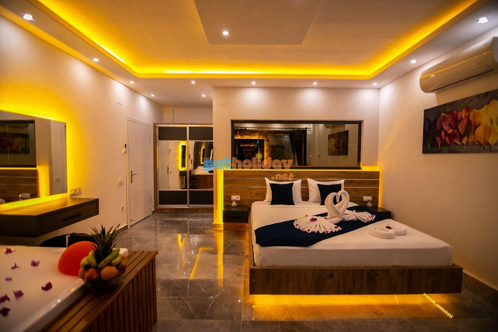 1. Yatak Odası : 1 adet çift kişilik yatak, klima, jakuzi, komodin, elbise dolabı, makyaj masası, banyo ve lavabo bulunmaktadır.