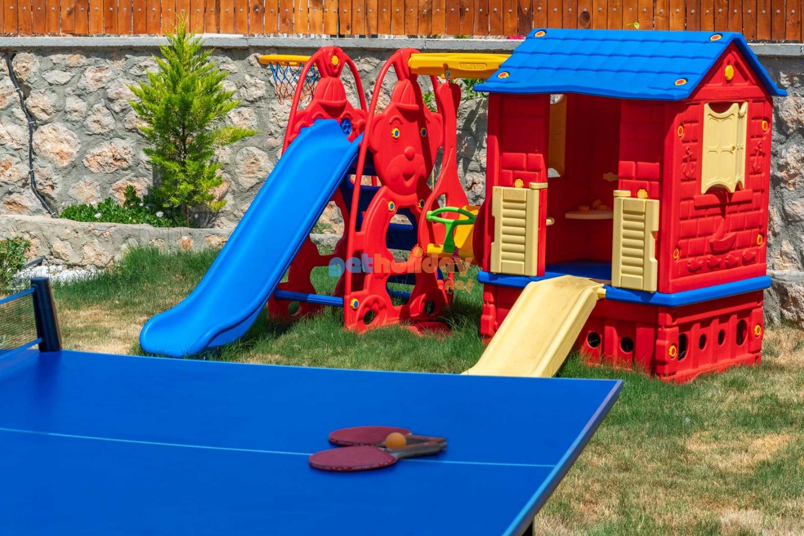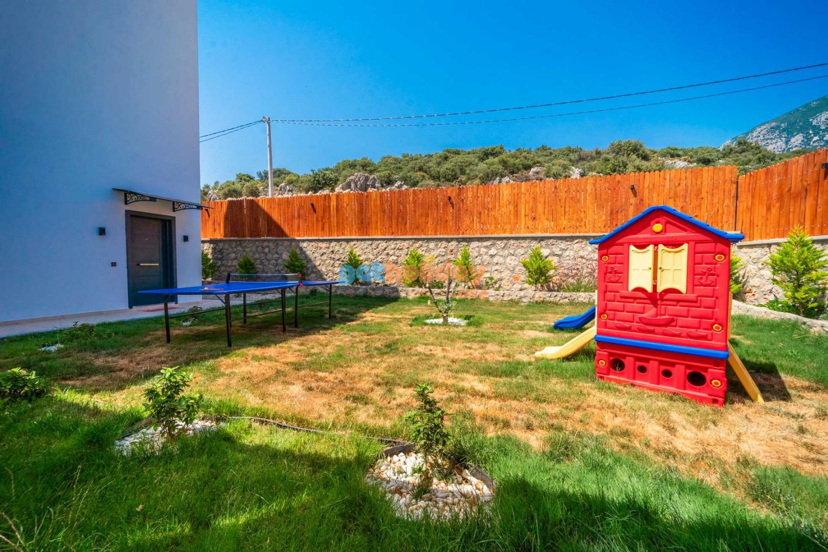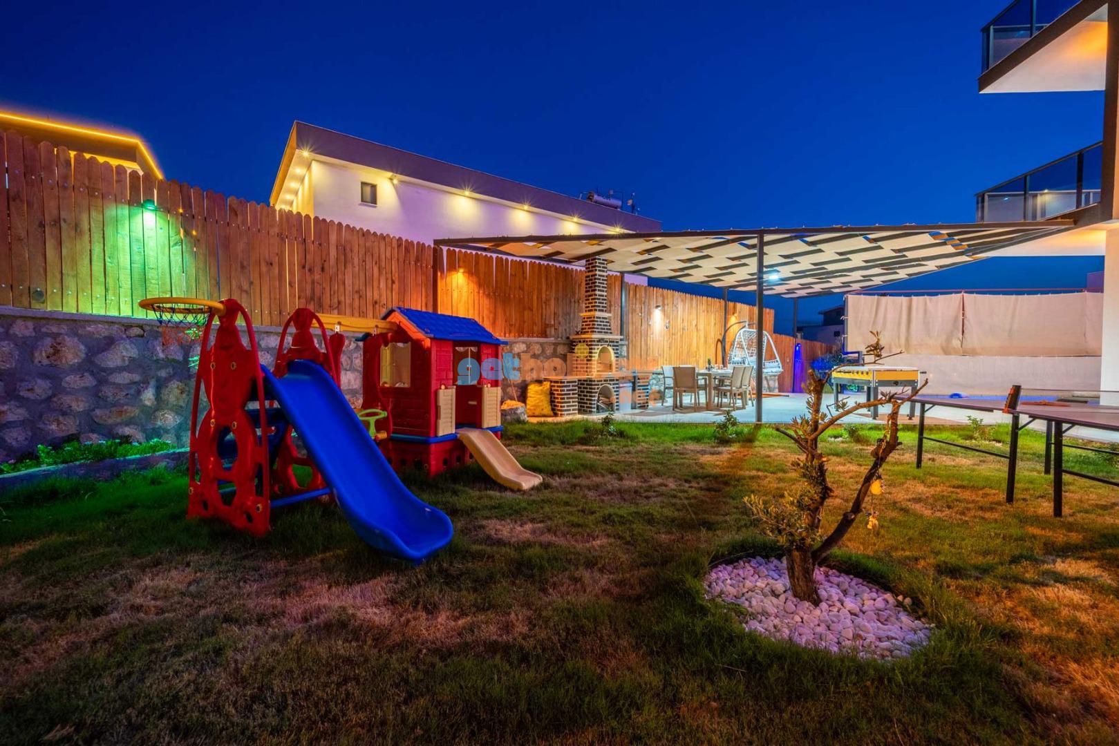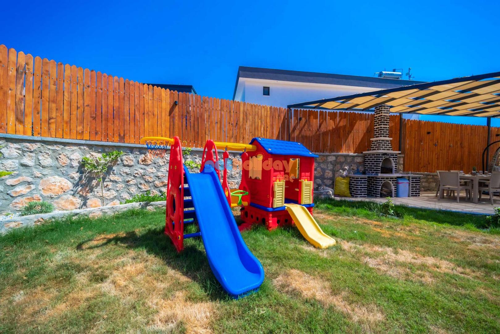 Özellikle çocuklu aileler için ideal olan villamızın bahçesinde, çocuklarınızın güvenle oynayabileceği bir mini oyun parkı bulunmaktadır. Bu özellik sayesinde tatiliniz hem sizin için hem de çocuklarınız için keyifli ve eğlenceli bir tatil deneyimi yaşayabilirsiniz.