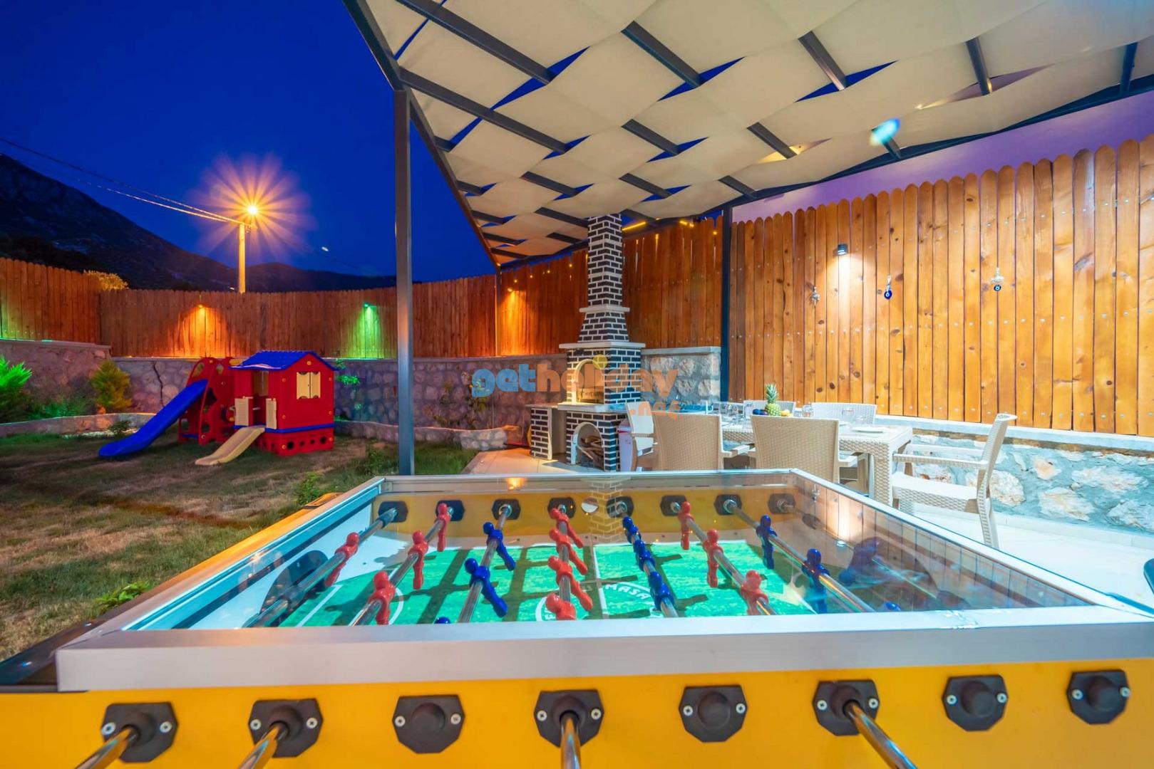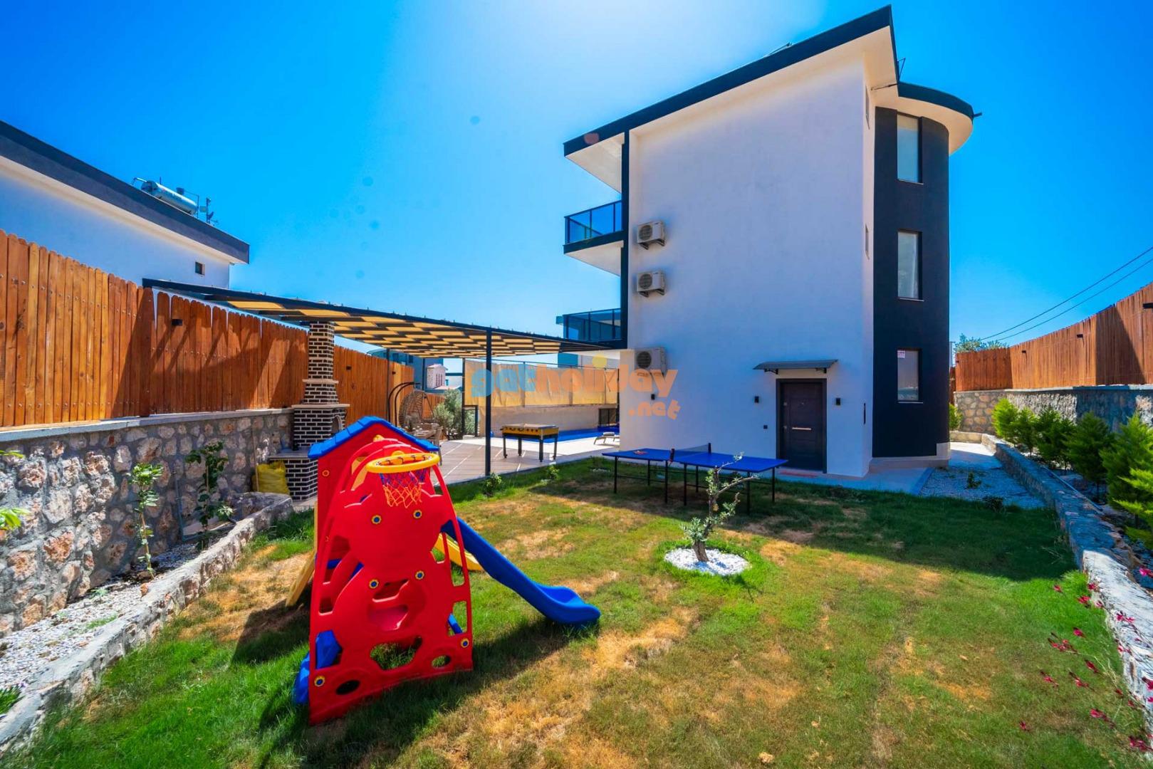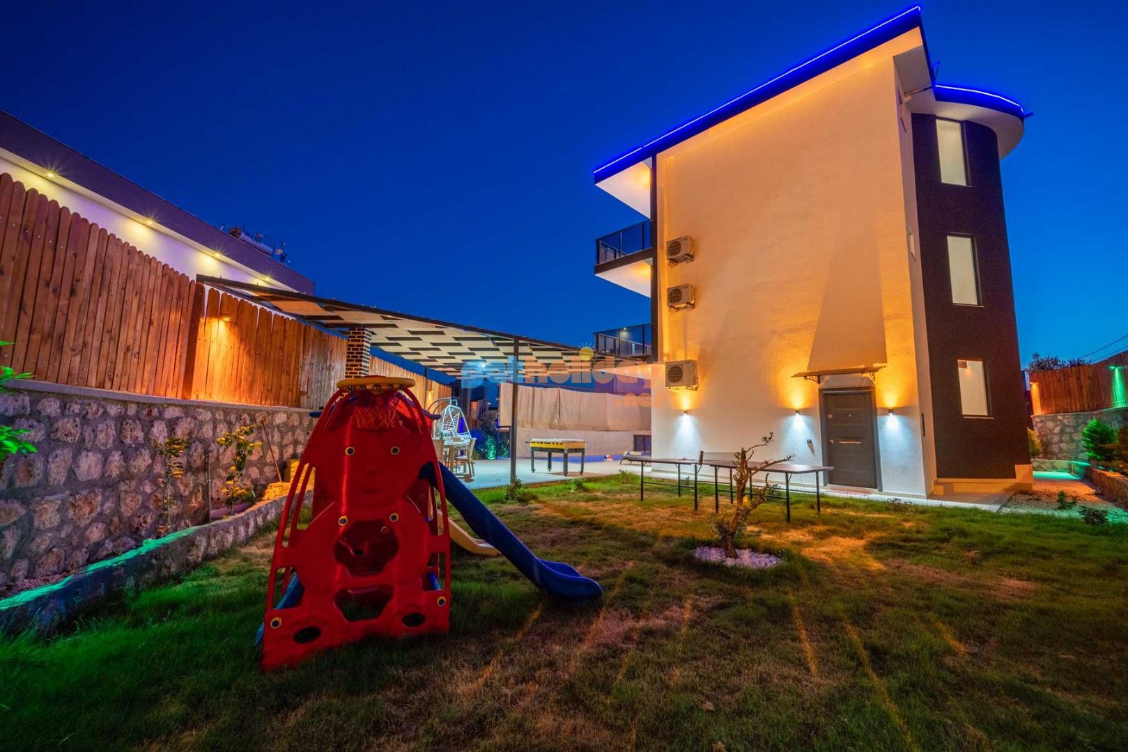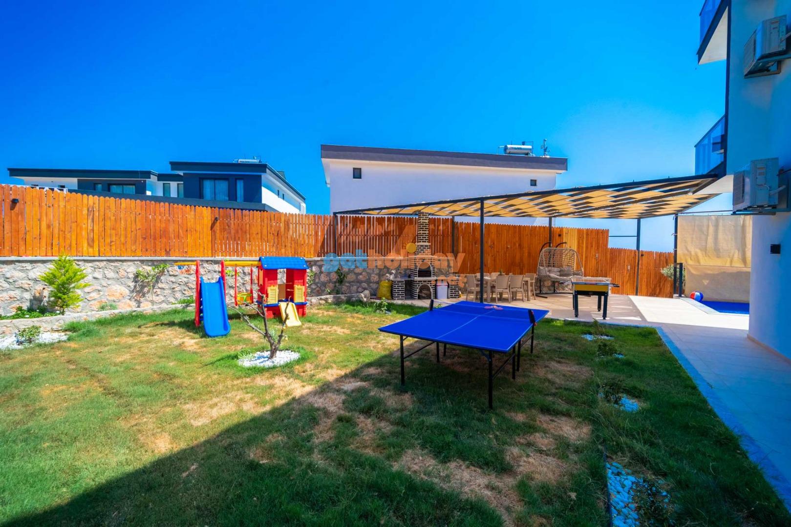 Özellikle çocuklu aileler için ideal olan villamızın bahçesinde, çocuklarınızın güvenle oynayabileceği bir mini oyun parkı bulunmaktadır. Bu özellik sayesinde tatiliniz hem sizin için hem de çocuklarınız için keyifli ve eğlenceli bir tatil deneyimi yaşayabilirsiniz.