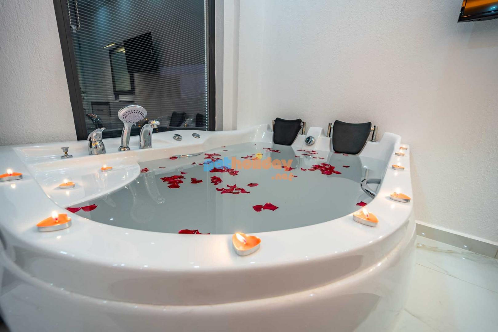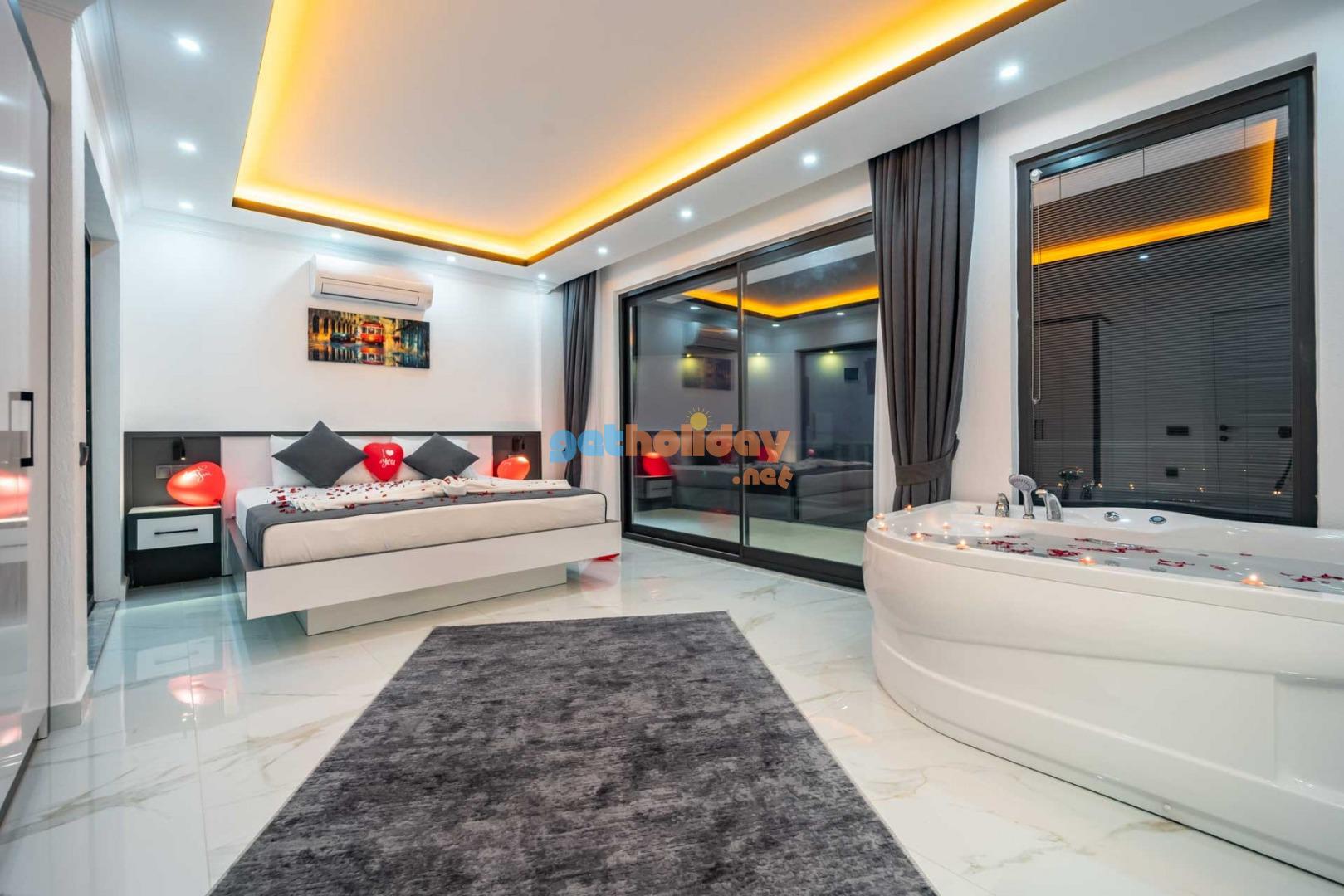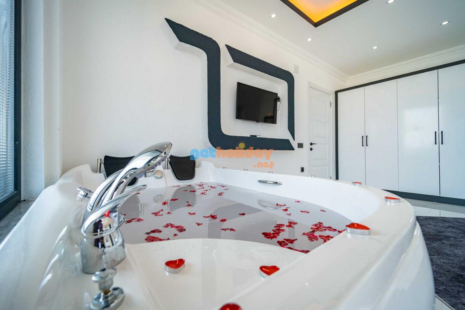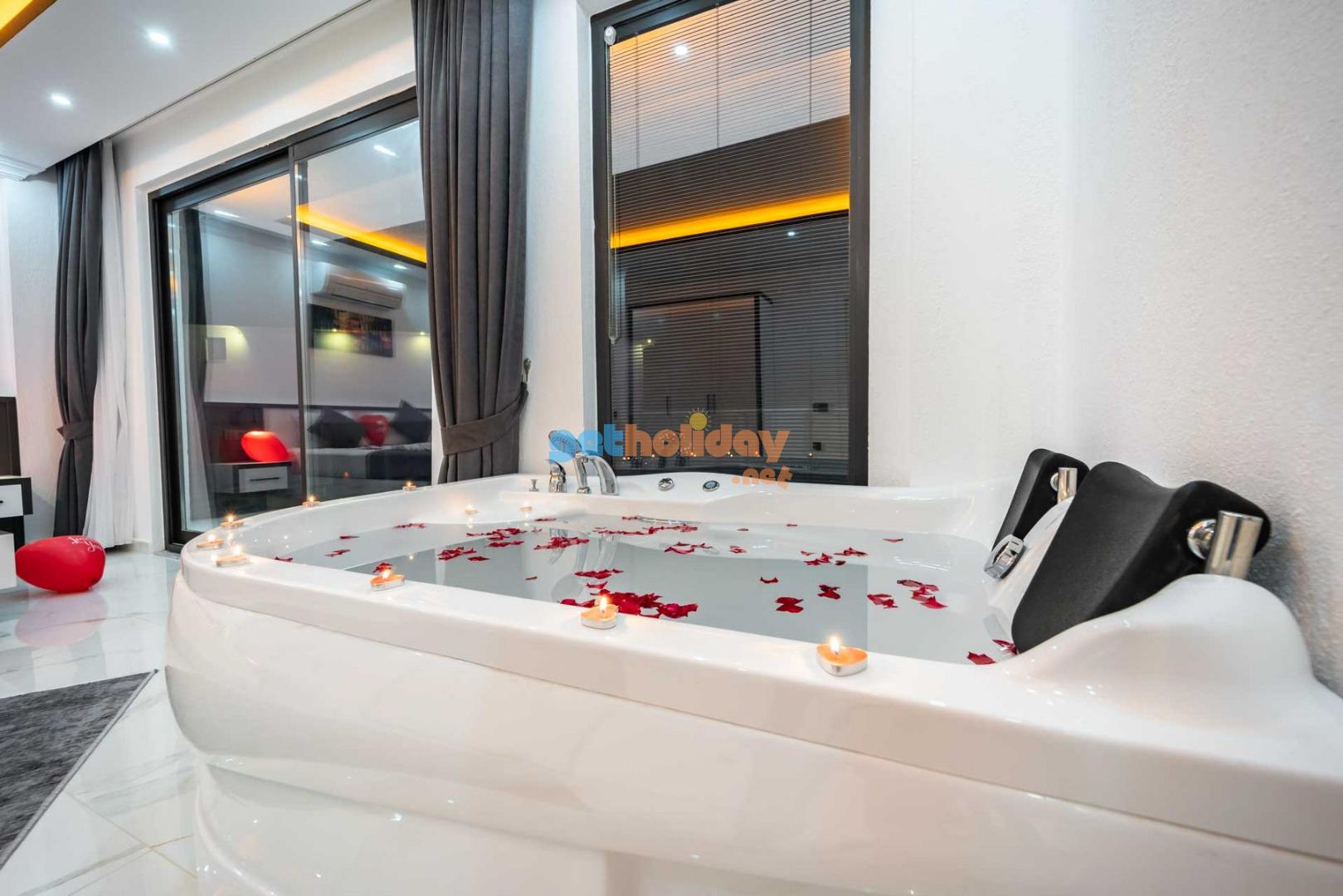 Çift jakuzili villamız, tatilinize Lüks ve konfor katar. Hem iç mekanlar hem de geniş bahçemiz rahatlamanız ve huzur bulmanız için mükemmel bir seçenektir