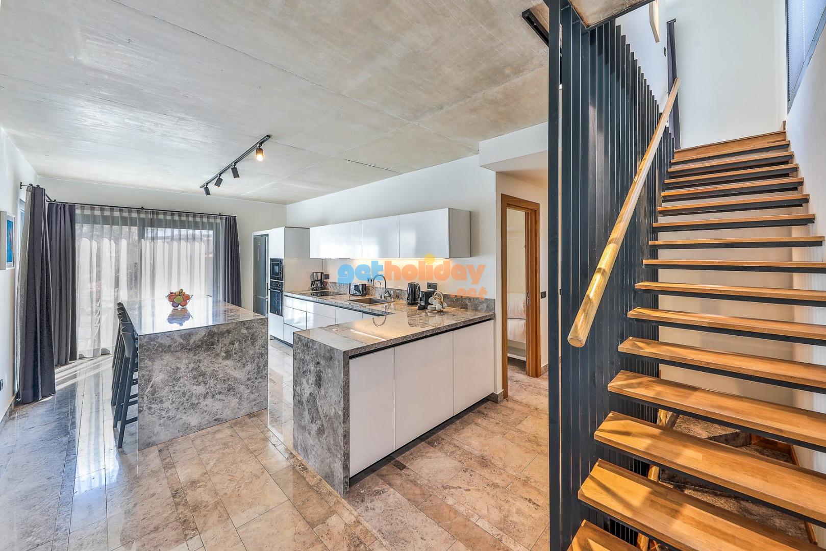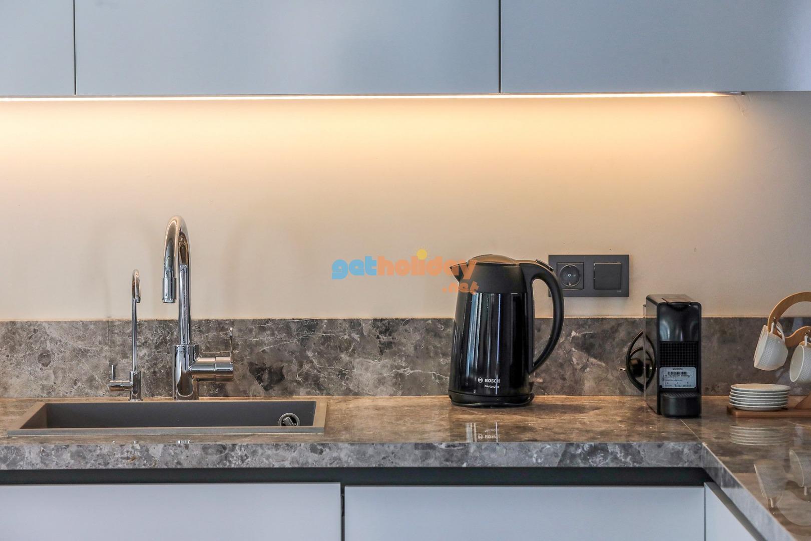 Mutfak: Tam donanımlı modern Amerikan mutfak içesinde No frost buzdolabı, ankastre set ( Bulaşık Makinası, davlumbaz, fırın, mikrodalga ve ocak) Su arıtma cihazı, Filtre Kahve makinası., ekmek kızartma makinası., rondo, çay makinesi Yemek masası ,yemek takımı ,tencere ve tava takımı ile ihtiyacınız olan tüm malzemeler bulunmaktadır.