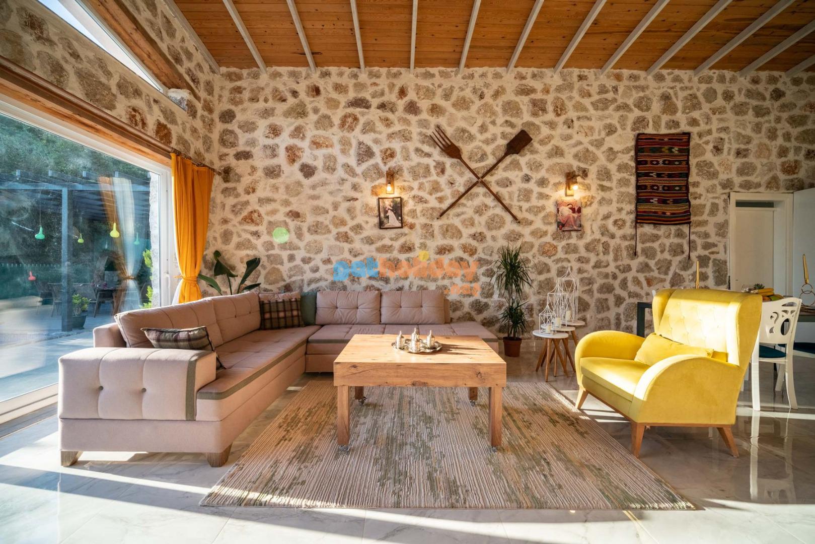 Salon : Modern ve şık dokunuşlar ile dekore edilmiş salon içerisinde rahat oturma grubu, TV, DVD oynatıcı, uydu alıcısı, Langırt, klima yer almaktadır. Salondan havuz terasına geçiş vardır.