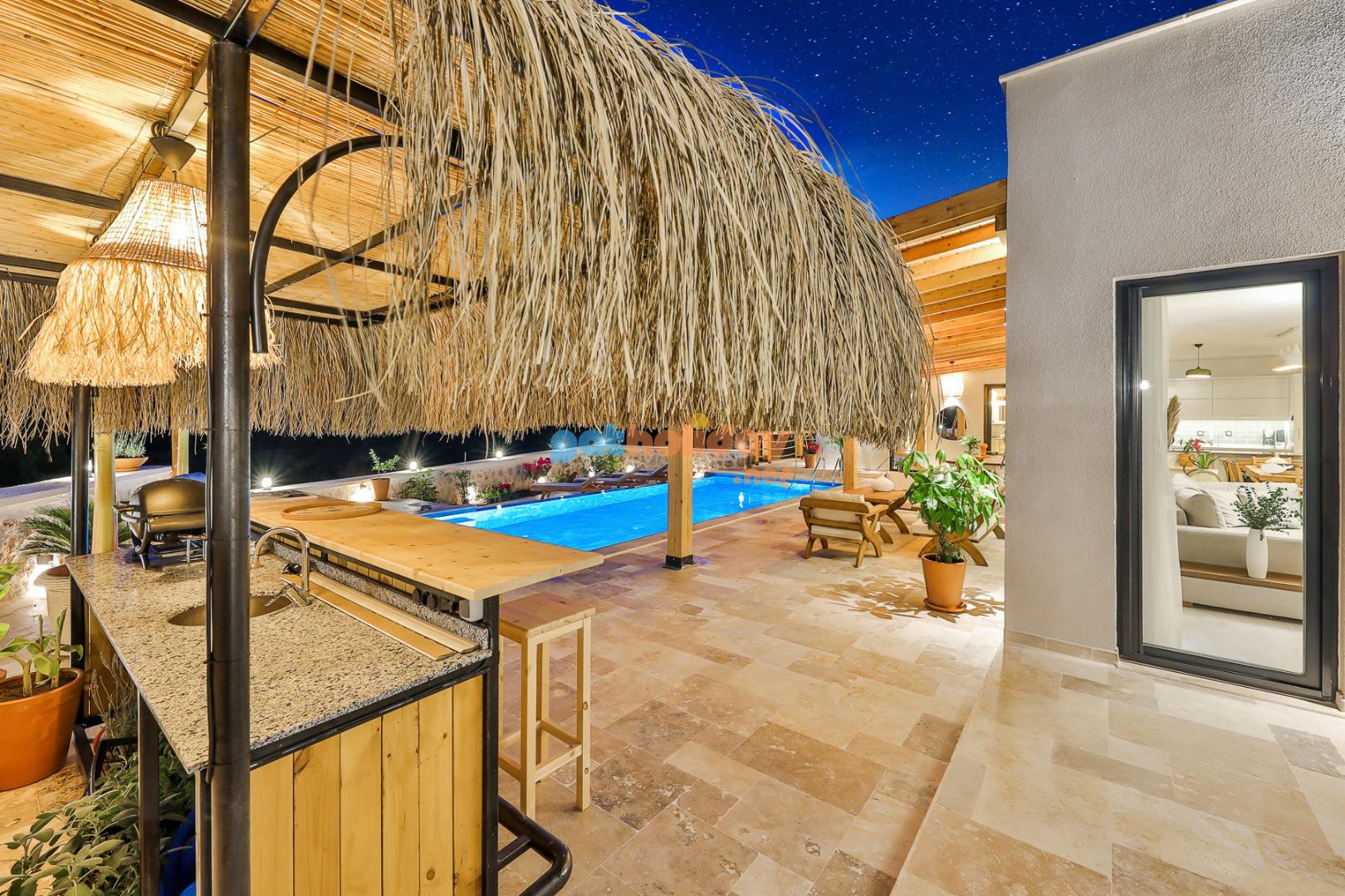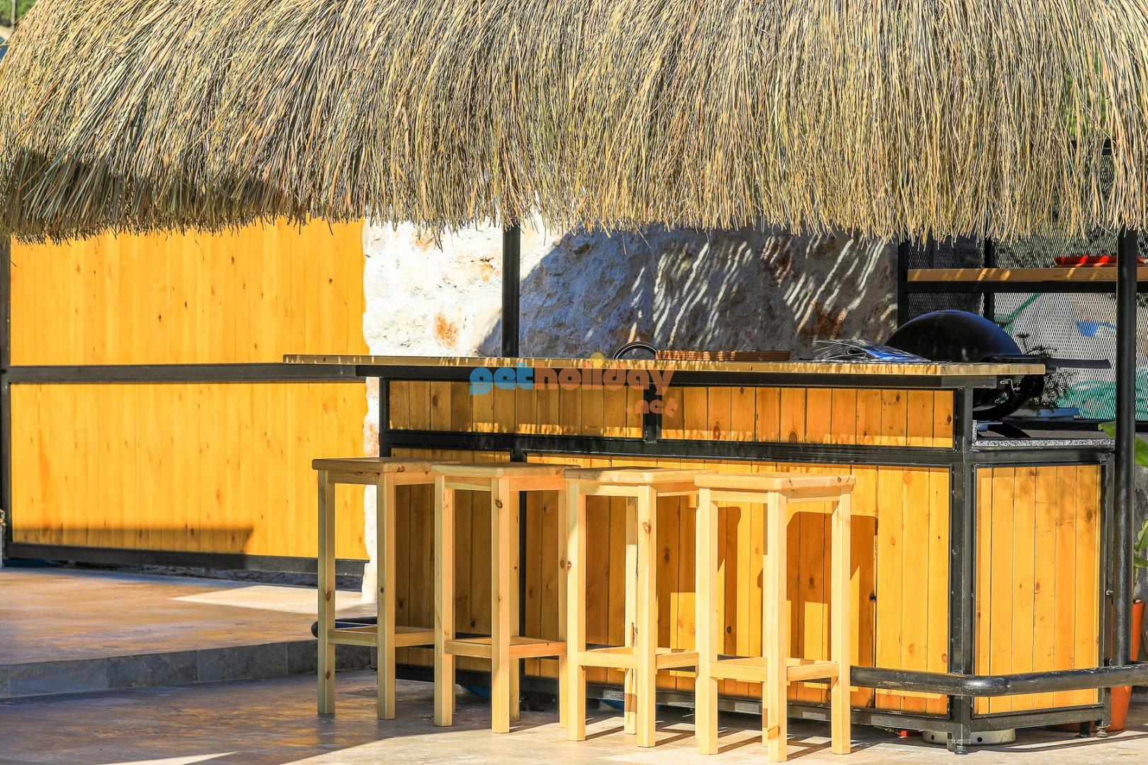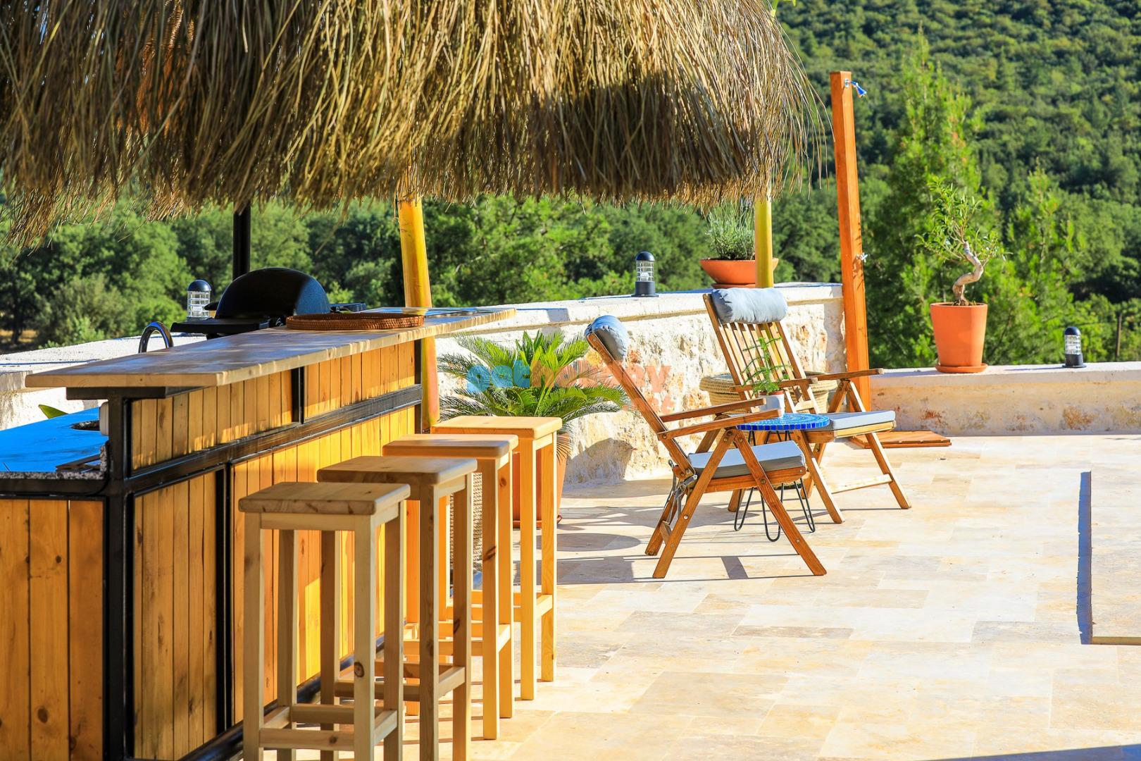 Teras: Geniş 400 metrekare teras. Veranda altı gölgede büyük yemek masası, dış alan oturma gurubu, havuz başı 4 adet güneşlenme şezlong ve 2 adet keyif sandalyesi. Bar alanı 4 adet bar sandalyesi ve barbekü ve bar malzemeleri mevcuttur.
