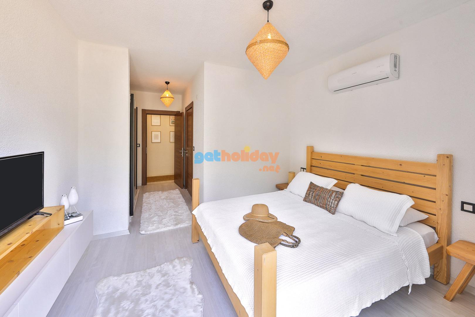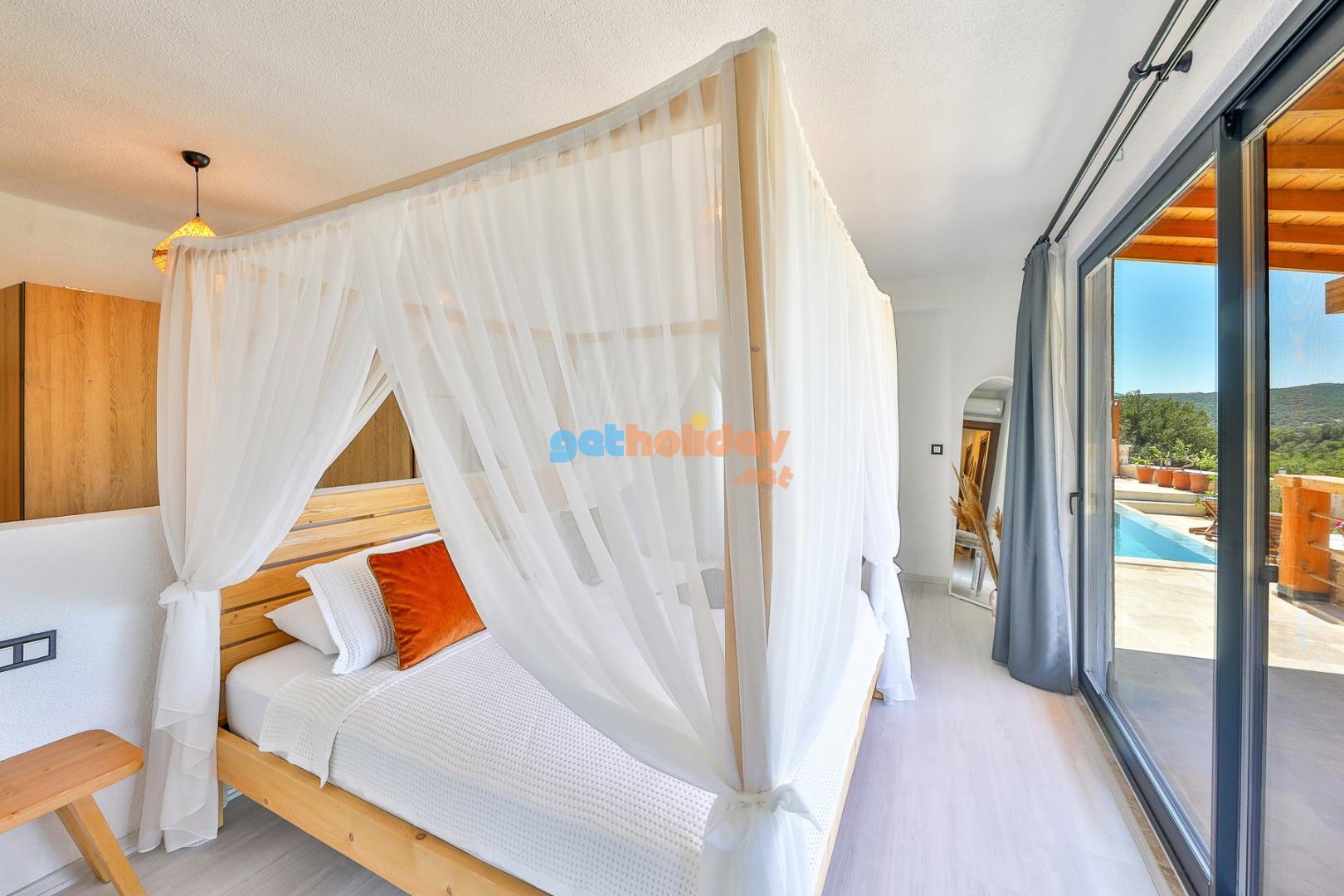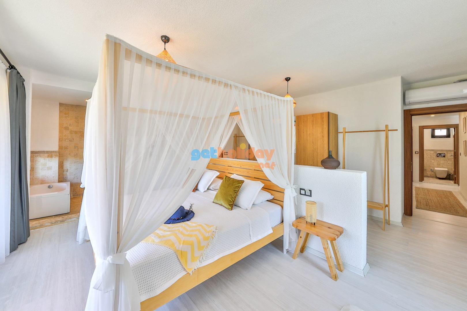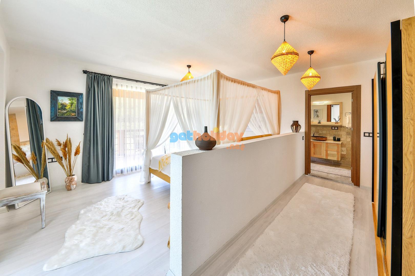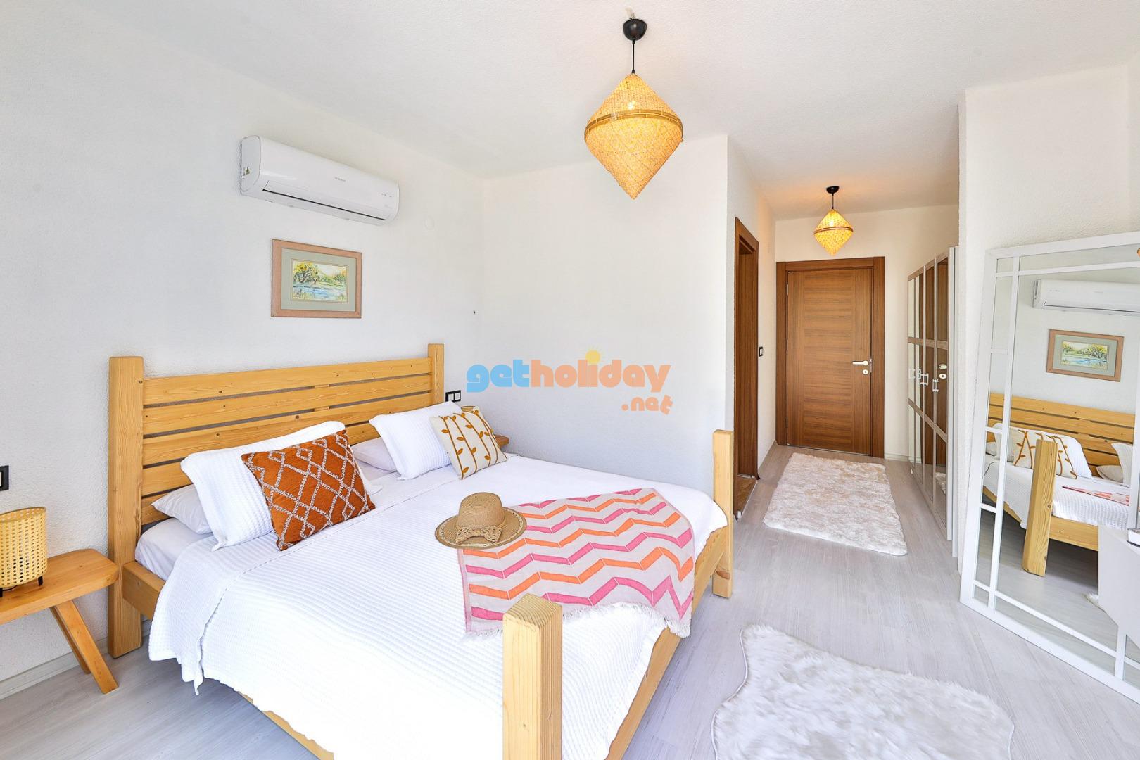 Yatak Odası 1: Doğa  manzaralı çift kişilik yatak, yağmur duş, tuvalet ve küvet , boy  aynası , giysi dolabı, komidin, saç kurutma makinası, klima.