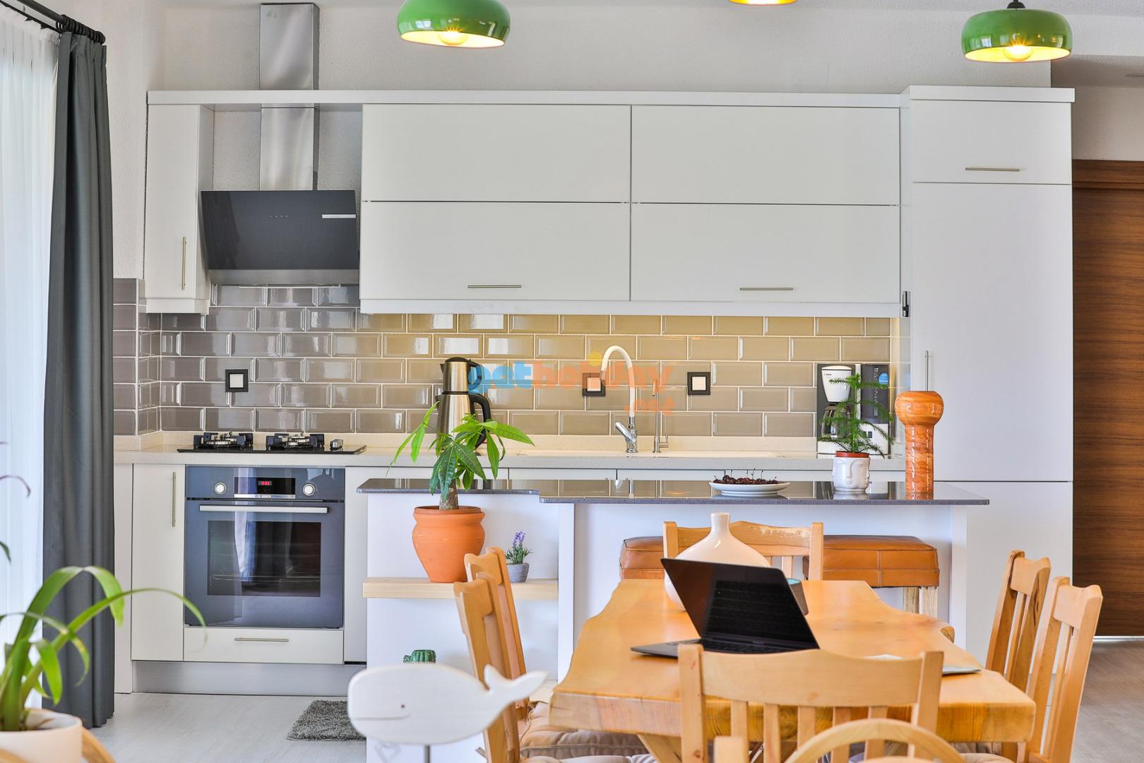 Tam donanımlı modern amerikan mutfak içesinde No frost buzdolabı, ankastre set ( Bulaşık Mak, davlumbaz, fırın, mikrodalga ve ocak) Su arıtma cihazı, Filtre Kahve mak., ekmek kızartma mak., rondo, çay makinesi Yemek masası ,yemek takımı ,tencere ve tava takımı ile ihtiyacınız olan tüm malzemeler bulunmaktadır.