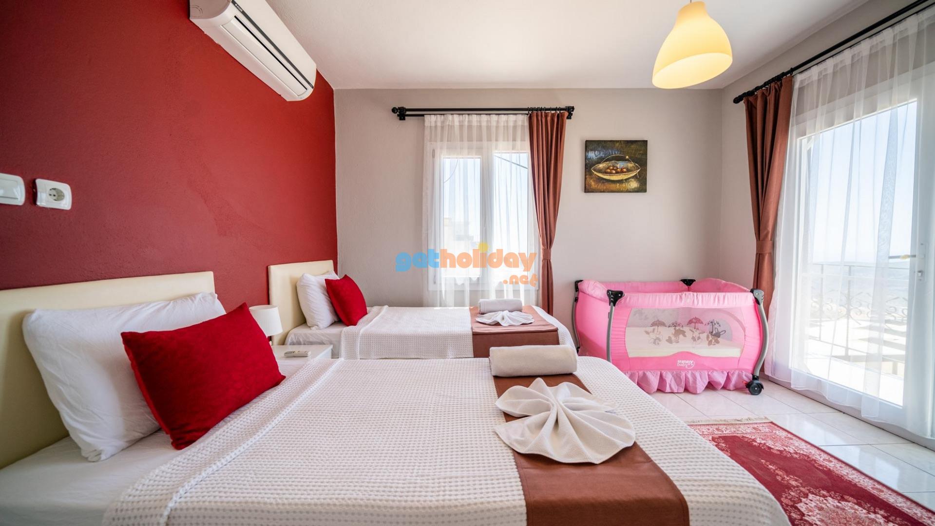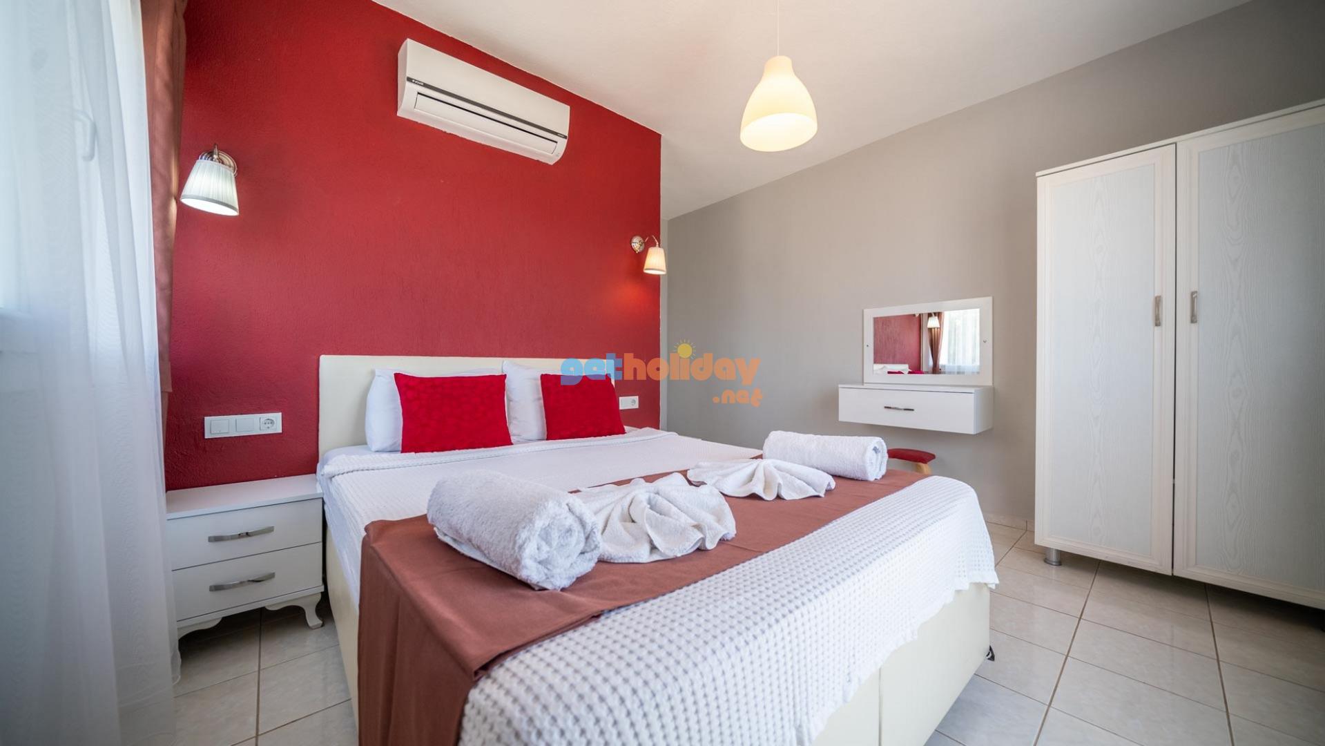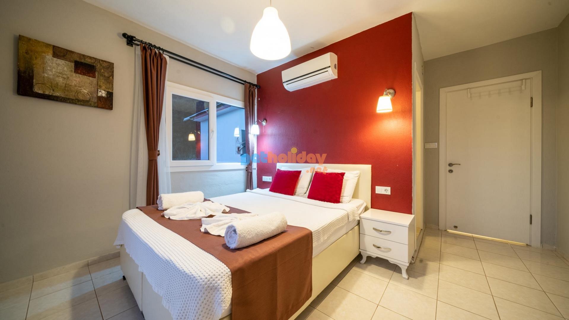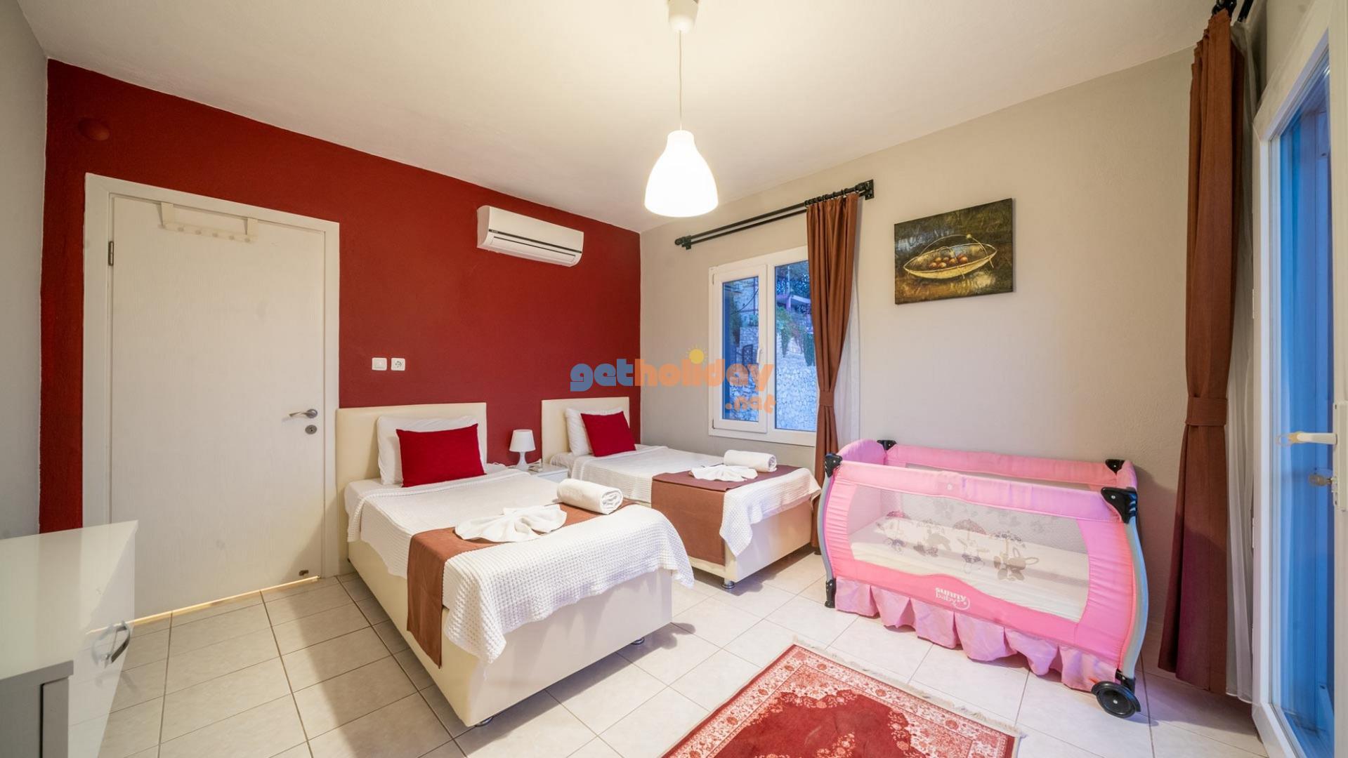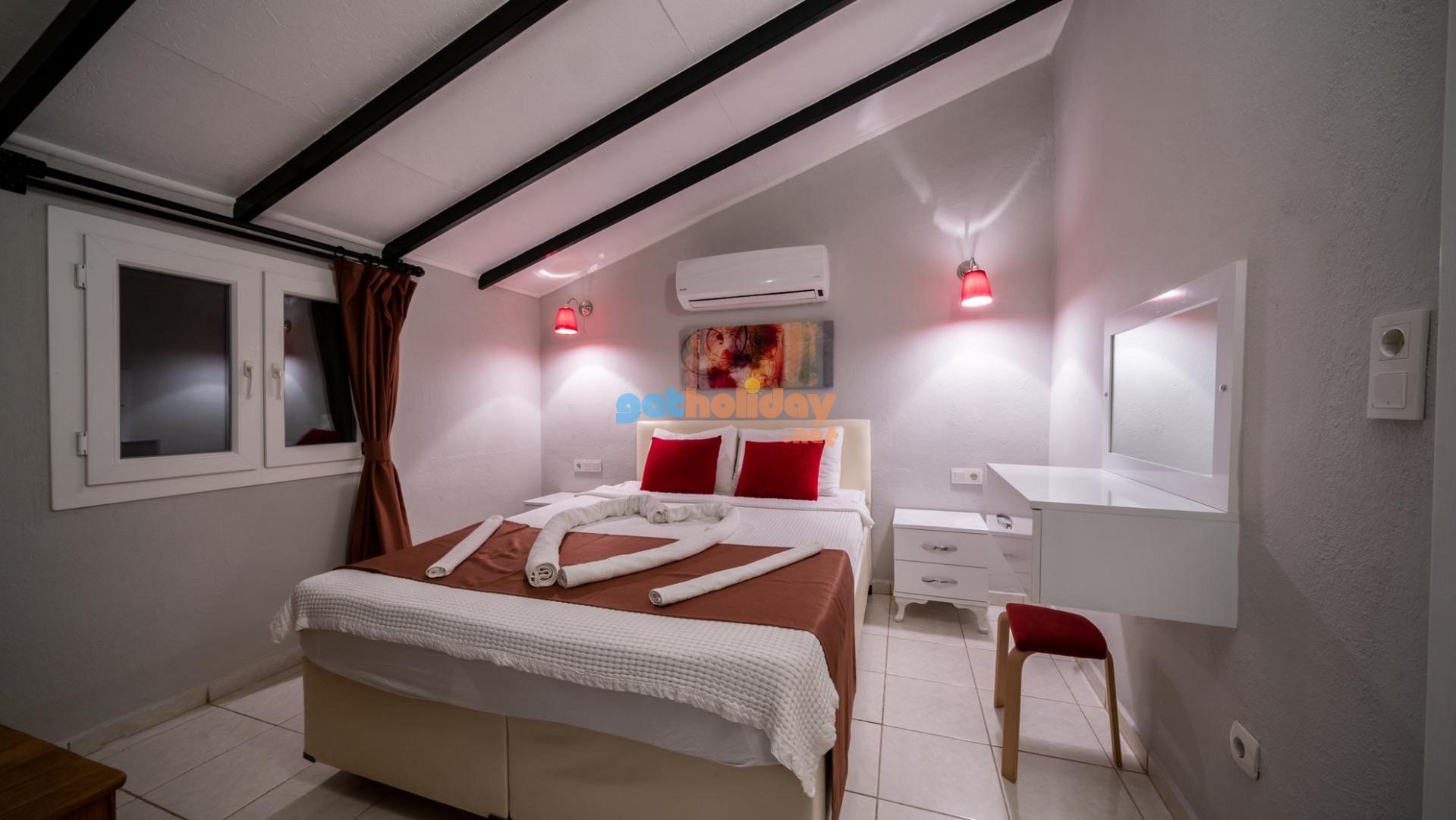 Villamızın içerisinde üç adet yatak odası ve üç adet banyo bulunmaktadır. Birinci yatak odası içerisinde çift kişilik yatak, klima ve banyo bulunmaktadır. İkinci yatak odası içerisinde iki adet tek kişilik yatak ve klima bulunmaktadır. Üçüncü yatak odası suit oda tipinde olup, içerisinde çift kişilik yatak, klima, jakuzi ve küçük bir mutfağı bulunmaktadır. Üç katlı villamızın her katında bir adet ortak banyo bulunmaktadır. Tüm odalarımız orta kat ve üst katta yer almaktadır. Ayrıca terastan güzel bir manzara izleyebilirsiniz.