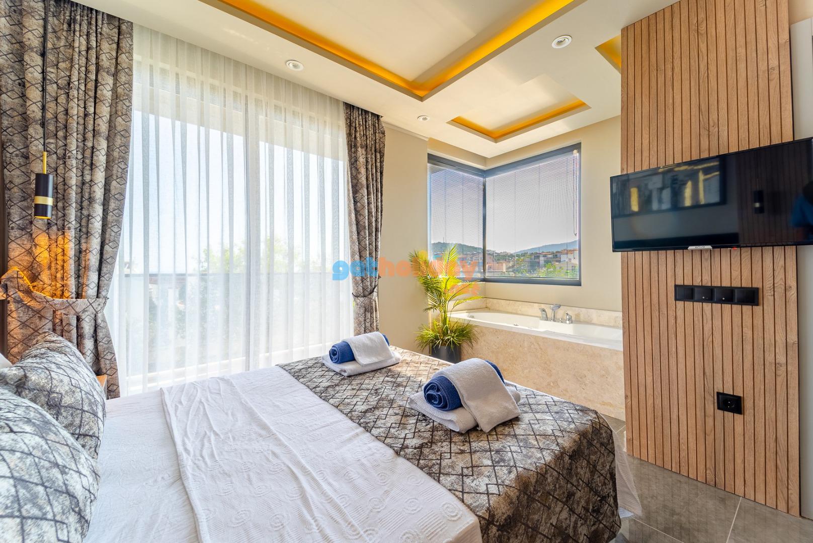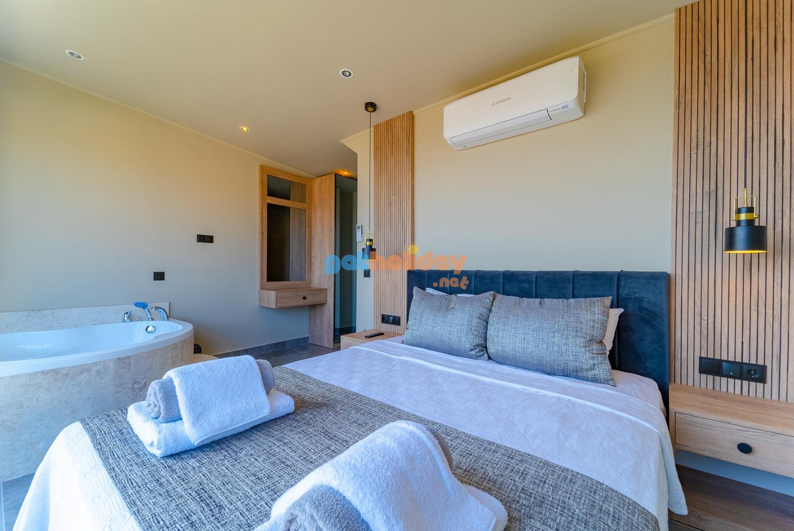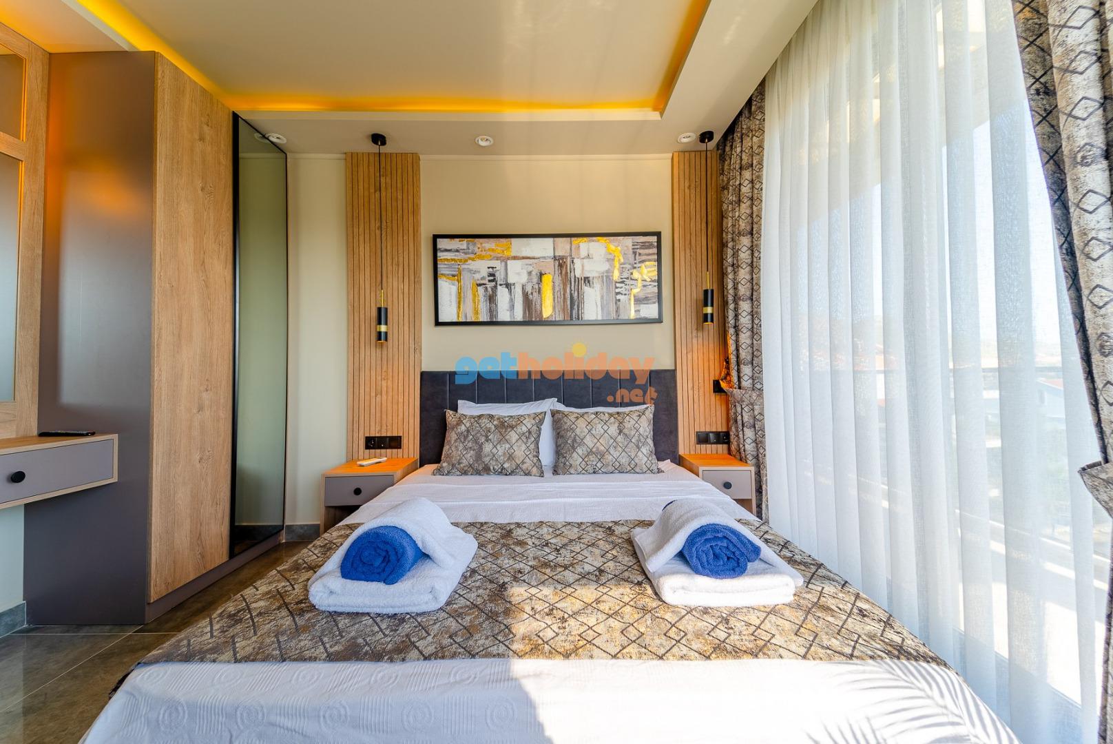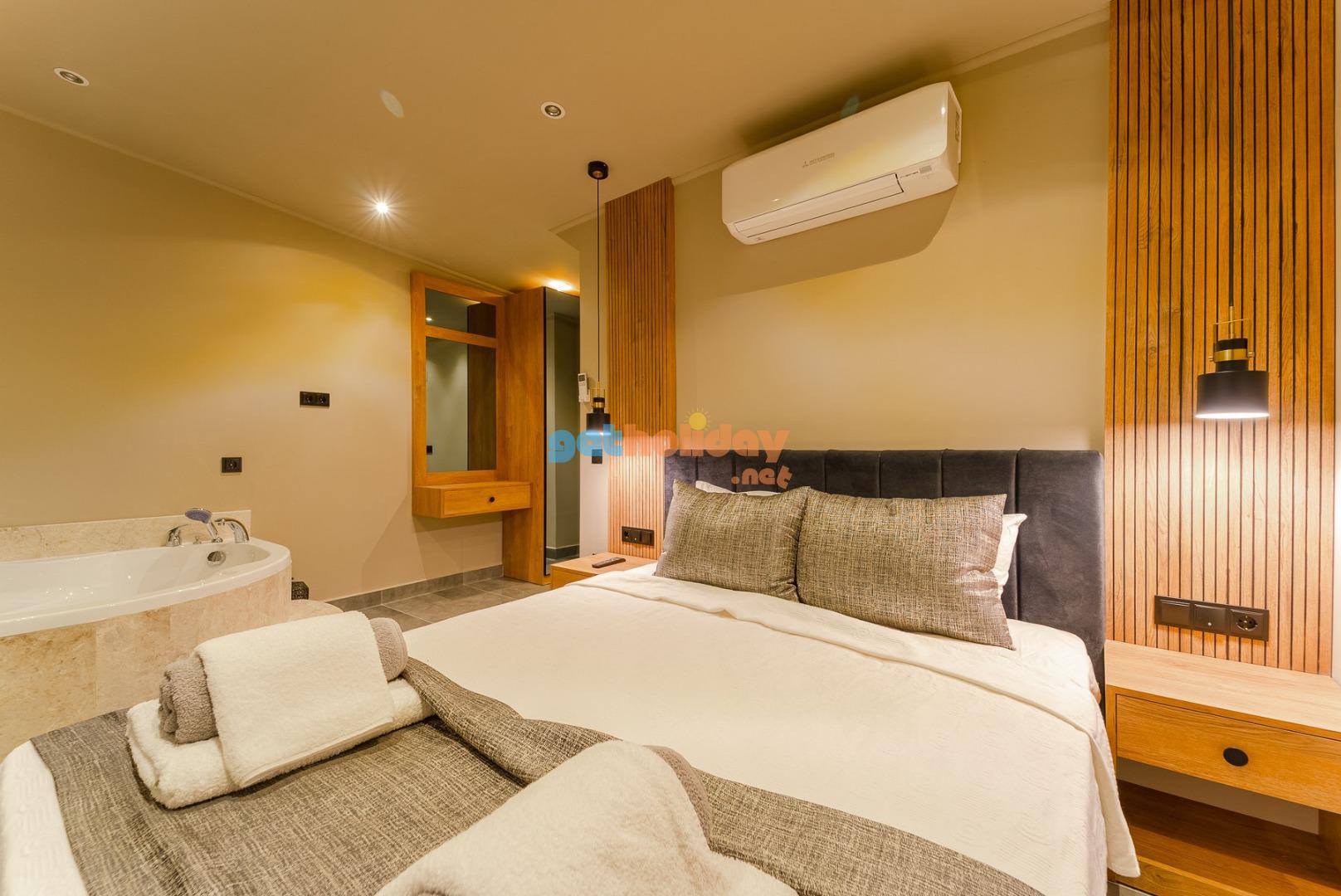 1. Yatak Odası : Suit aile yatak odasında 1 adet çift kişilik yatak, komodin, elbise dolabı, TV, makyaj masası,klima jakuzi ve banyo/WC bulunmaktadır.