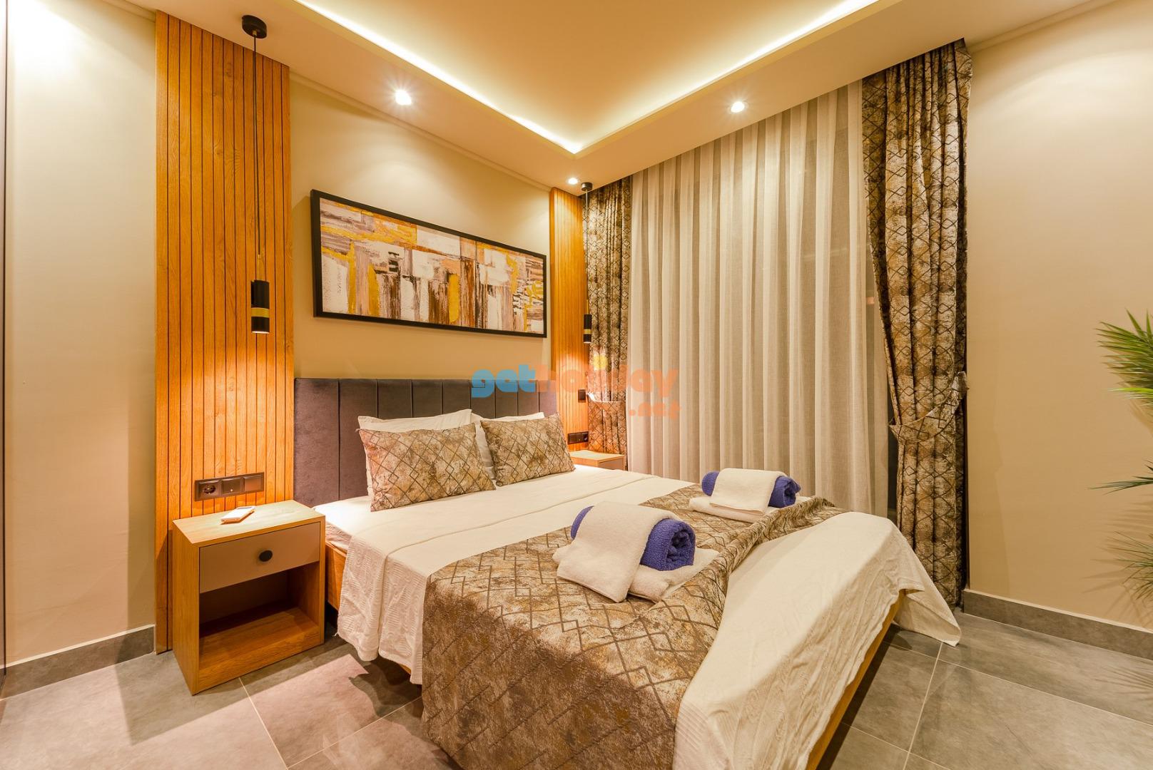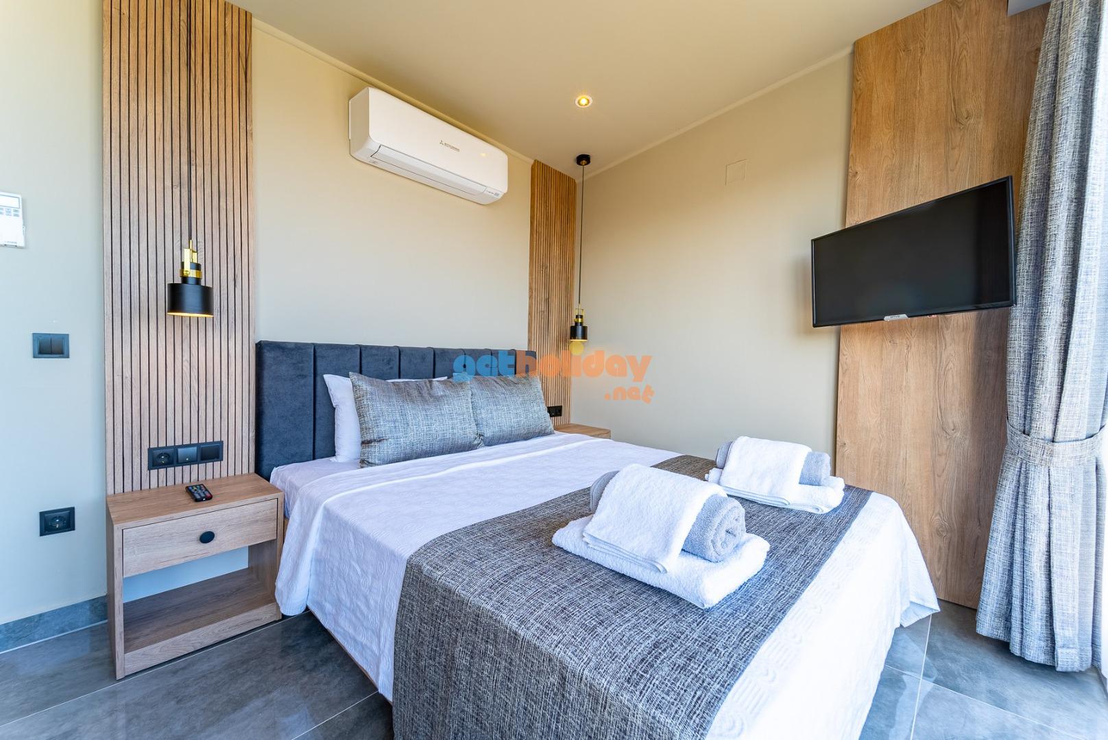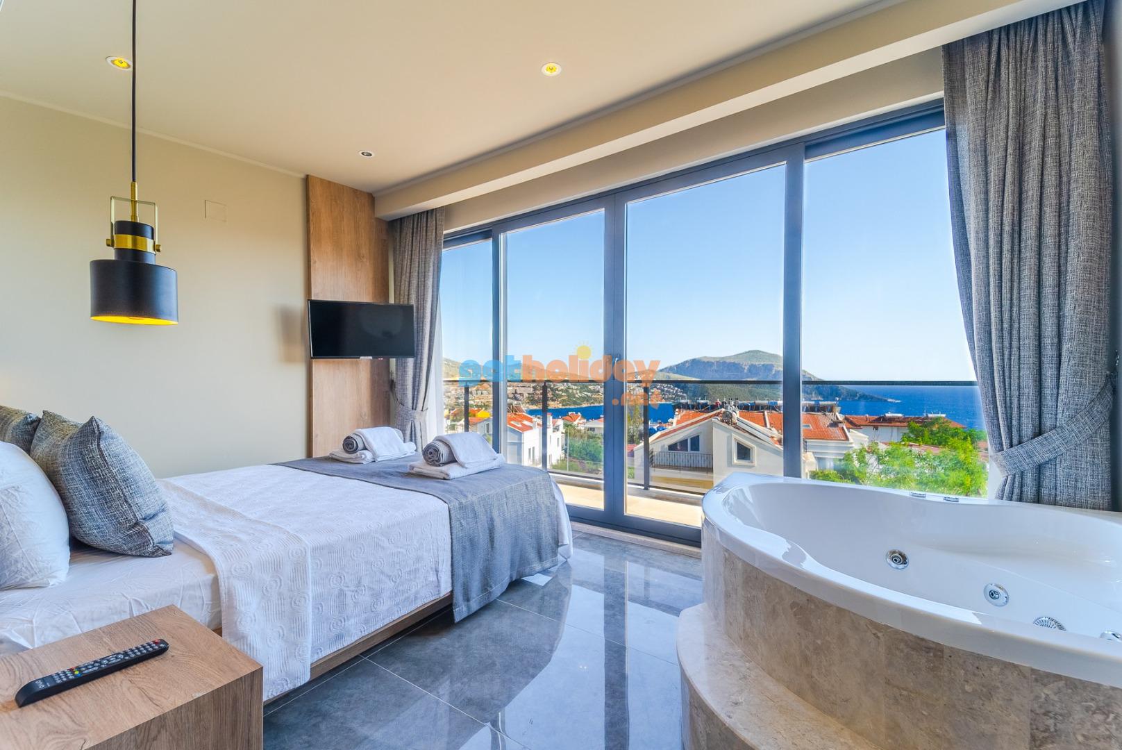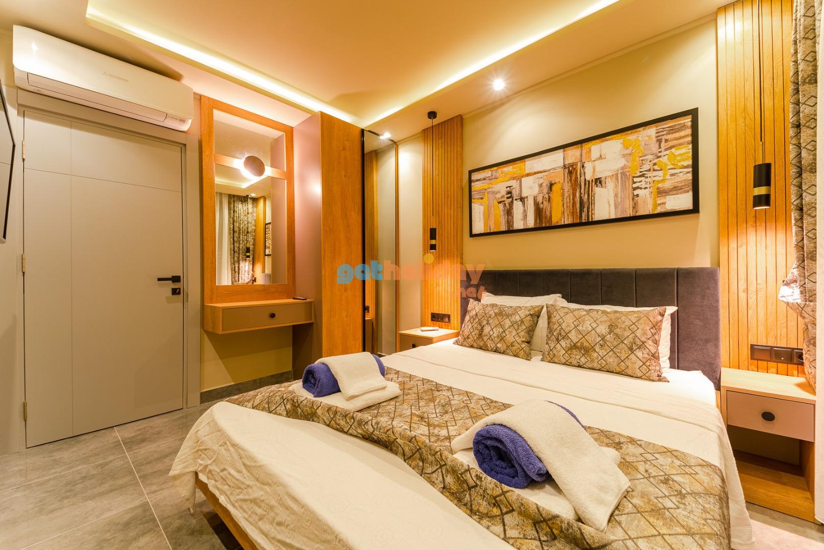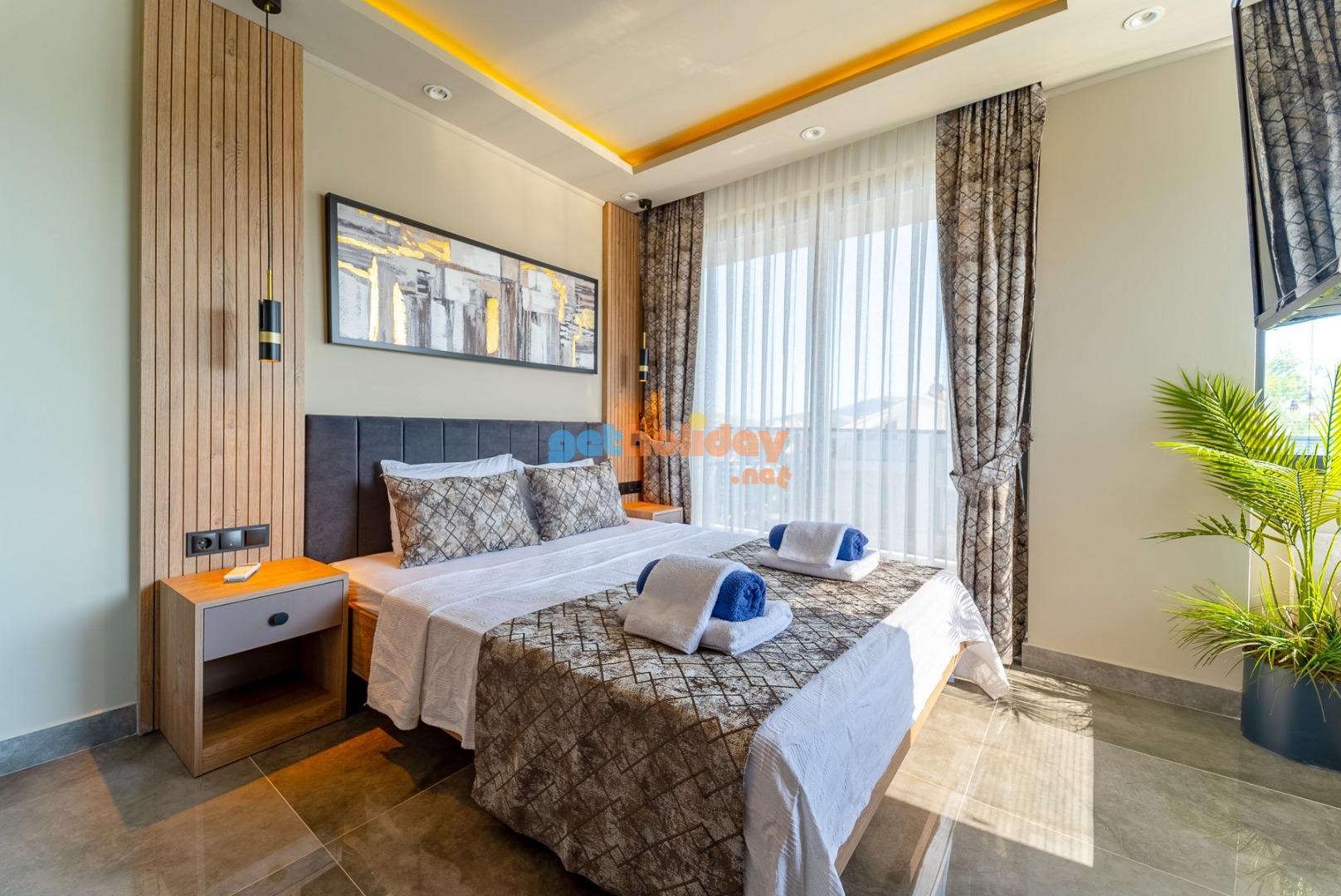 1. Yatak Odası : Suit aile yatak odasında 1 adet çift kişilik yatak, komodin, elbise dolabı, TV, makyaj masası,klima jakuzi ve banyo/WC bulunmaktadır.