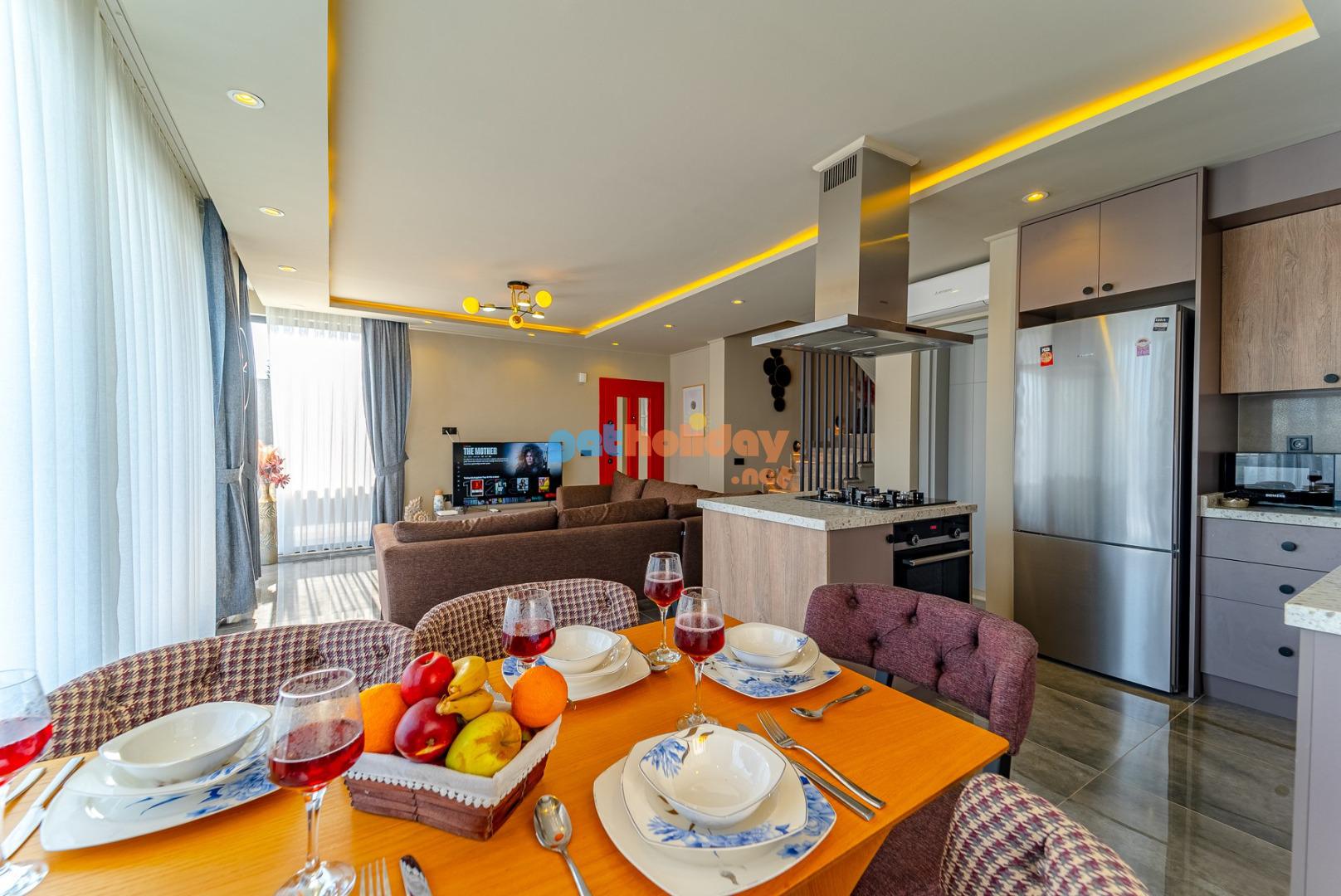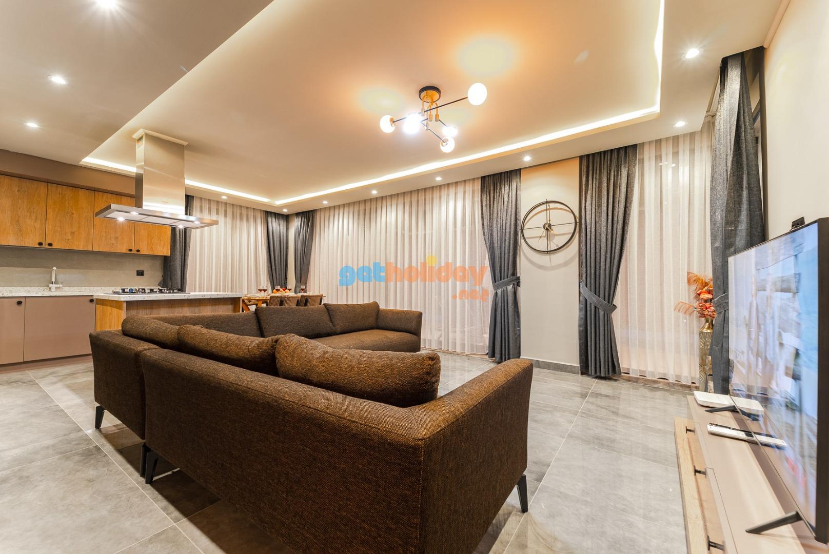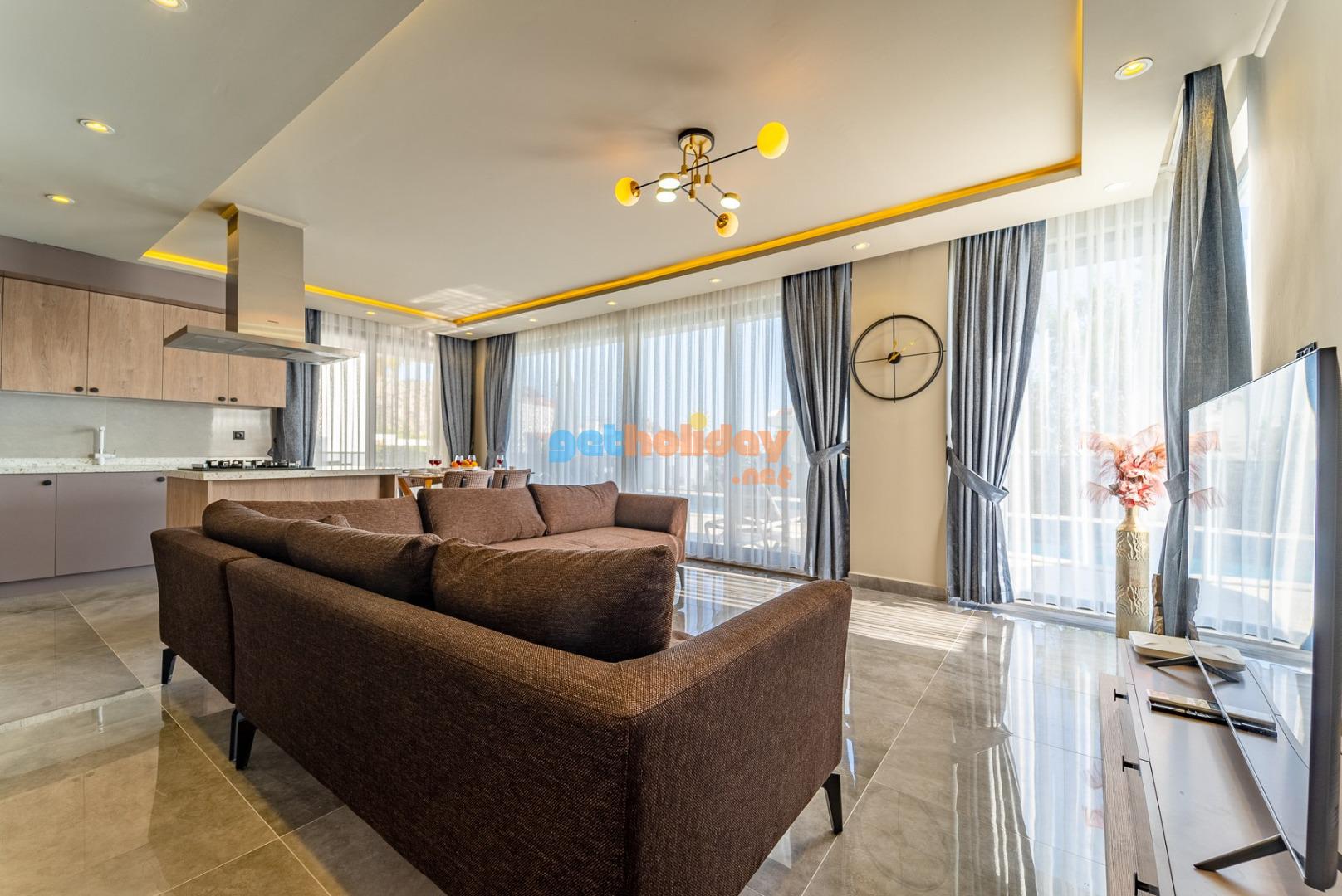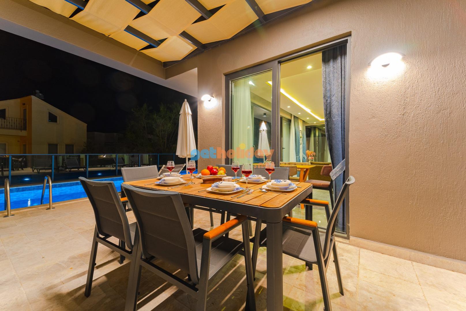 Salon : Havuz ve doğa manzaralı salonumuzda sizlerin rahatlığı için düşünülmüş konforlu oturma gurubu, 6 kişilik yemek masası, TV,klima bulunmaktadır.