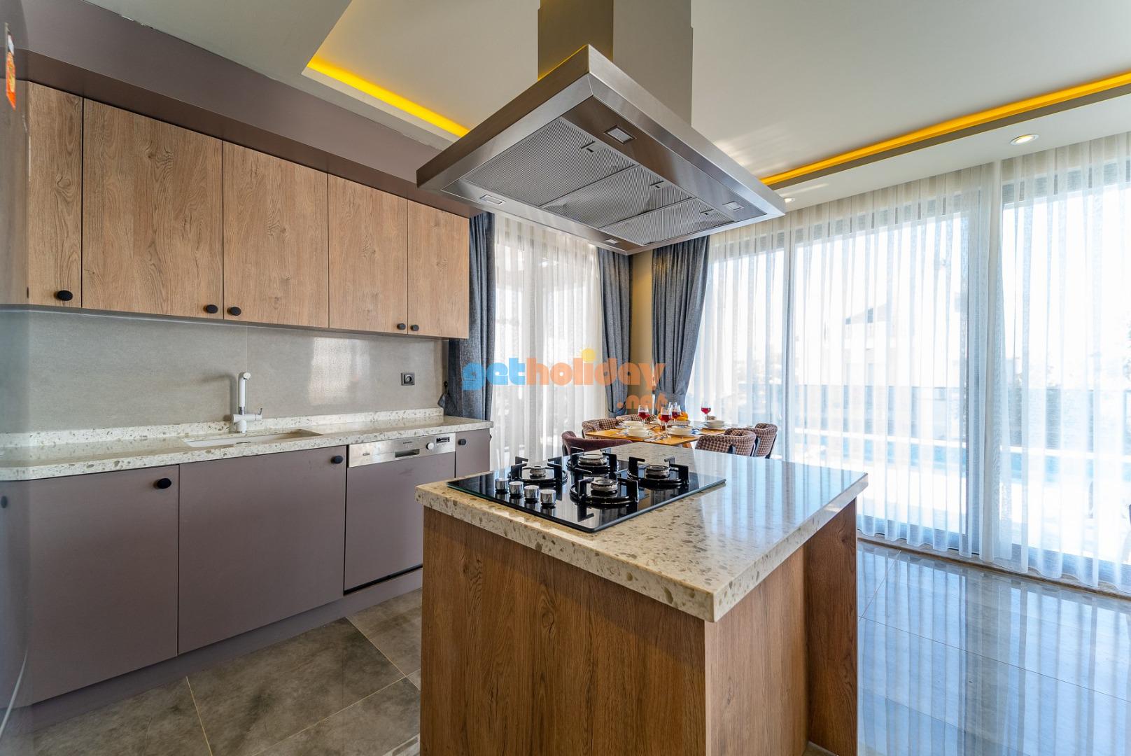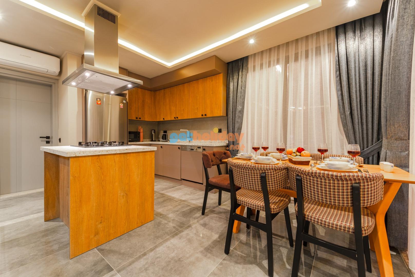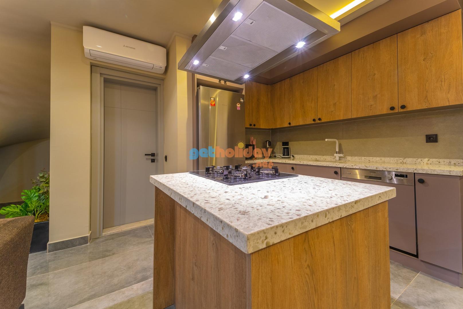 Mutfak :Villamızda amerikan mutfak bulunmaktadır. Mutfak içerisinde mikrodalga fırın, buzdolabı, bulaşık makinesi, fırın, 4’lü ocak,türk kahve makinası, Çaycı, tencere ve tavalar, çatal bıçak takımı, yemek takımı, su ve çay bardakları yer almaktadır.