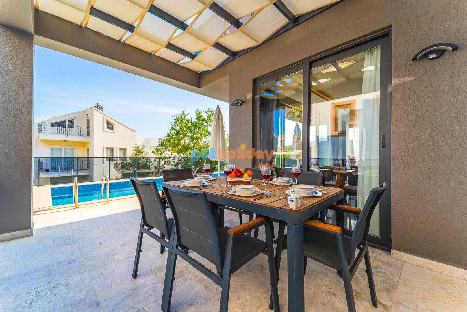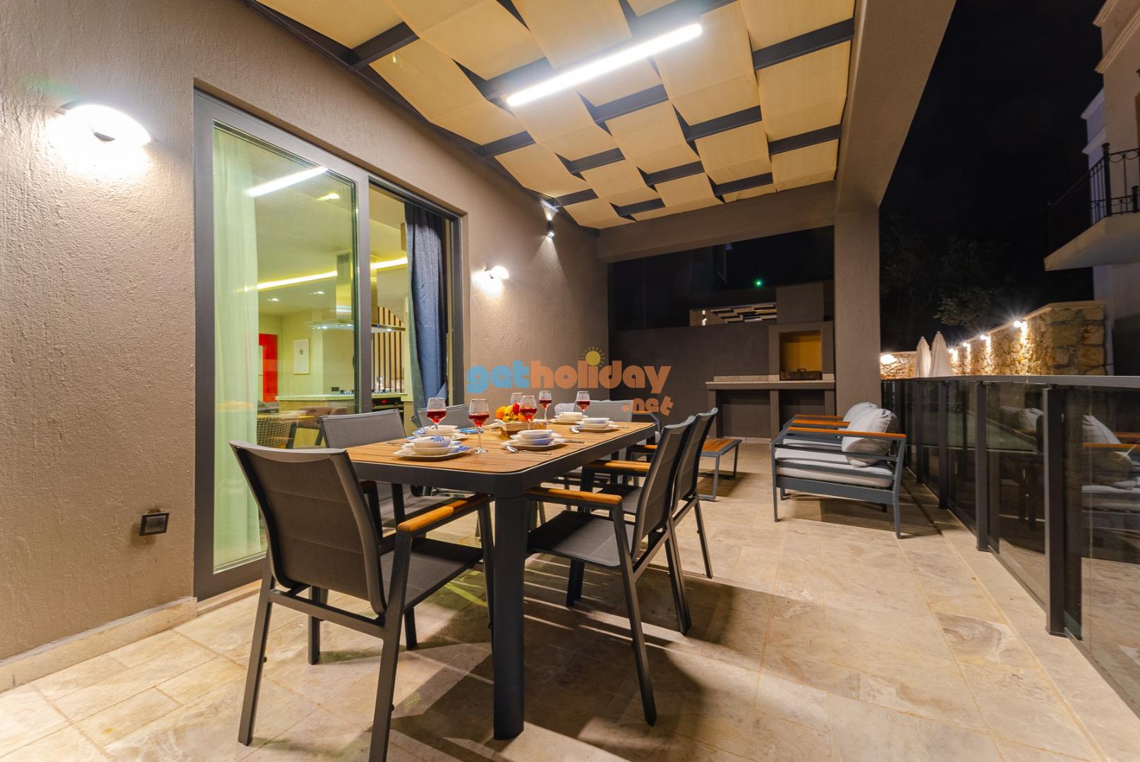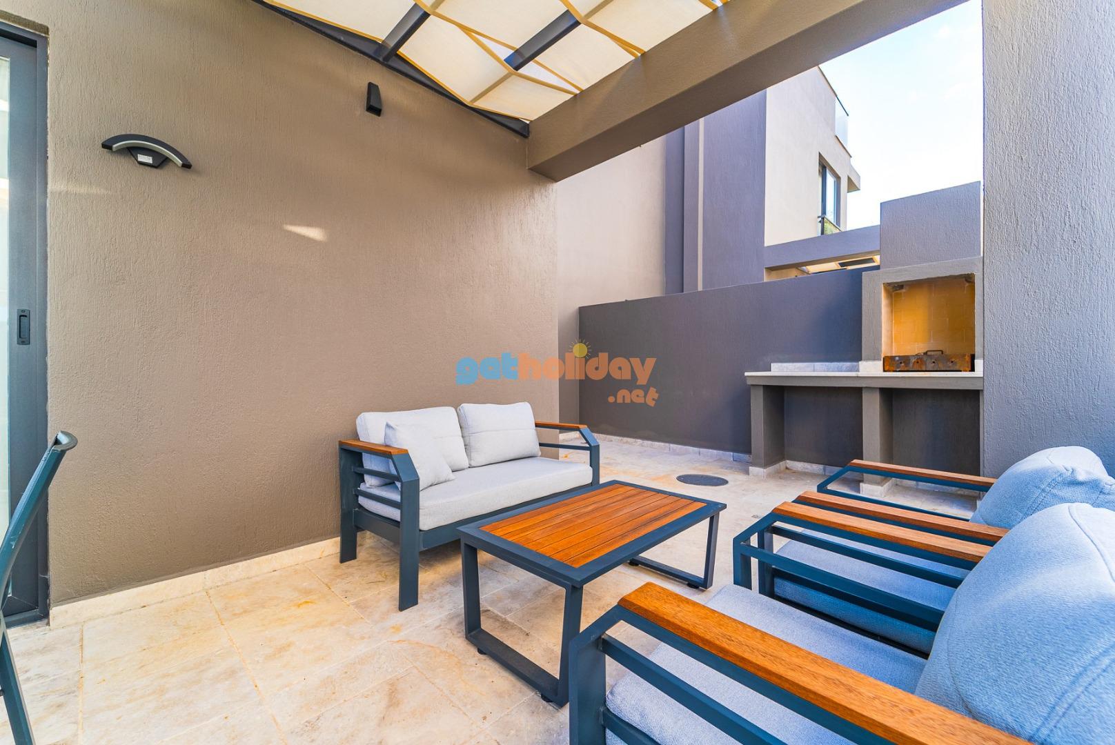 Özel Bahçe : Villamızın bahçesinde güneşlenme terası, 4 Adet şezlong,2 adet güneş şemsiyesi, 6 kişilik bahçe yemek masası, bahçede keyifli dakikalar geçirebilmeniz için bahçe oturma gurubu, BBQ alanı bulunmaktadır
