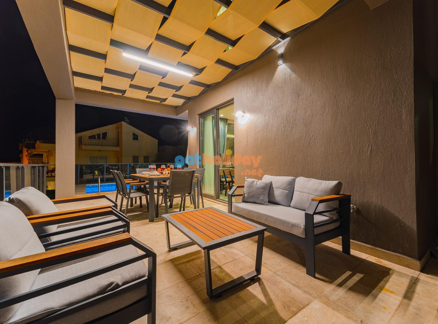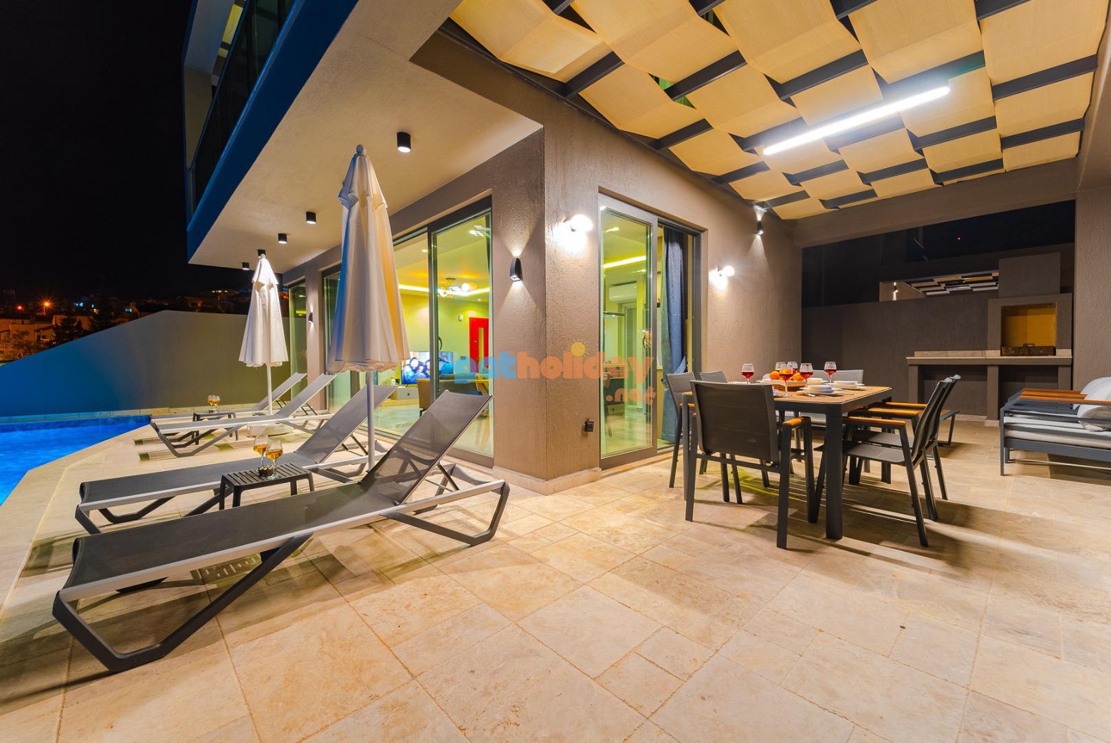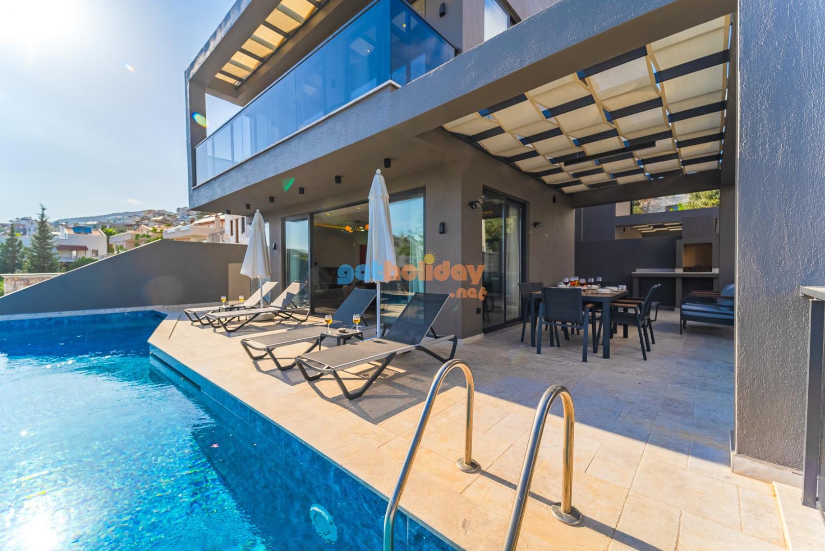 Özel Bahçe : Villamızın bahçesinde güneşlenme terası, 4 Adet şezlong,2 adet güneş şemsiyesi, 6 kişilik bahçe yemek masası, bahçede keyifli dakikalar geçirebilmeniz için bahçe oturma gurubu, BBQ alanı bulunmaktadır