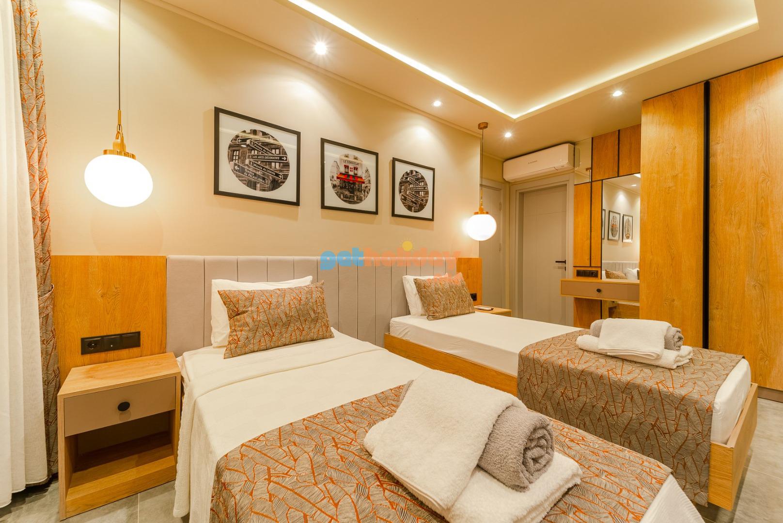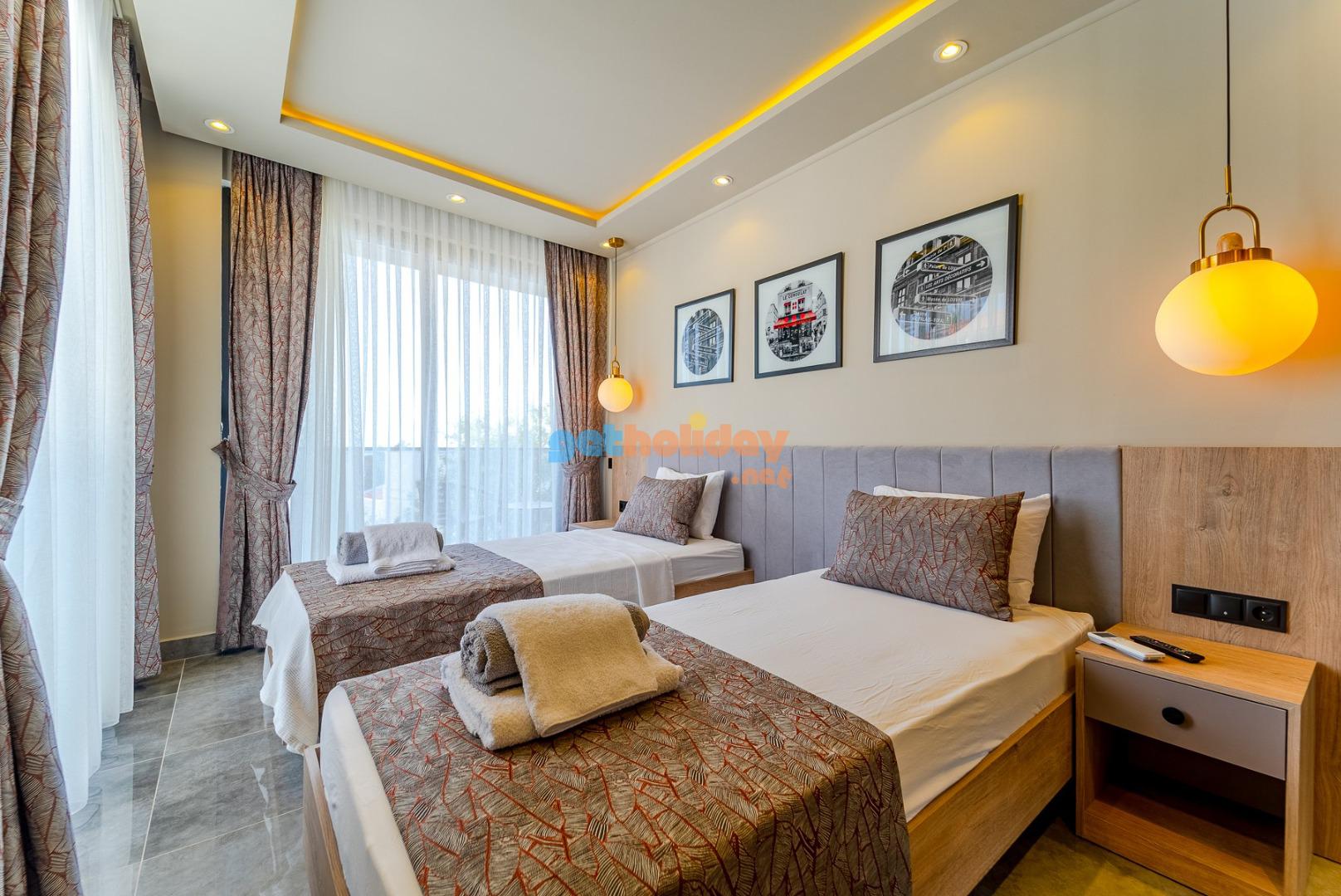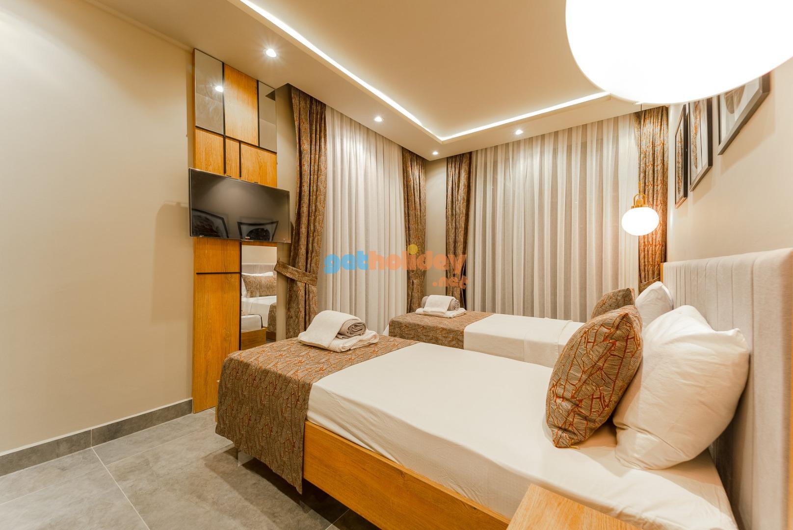 2. Yatak Odası: Genç suit odasında 2 adet tek çift kişilik yatak, komodin , TV, makyaj masası, elbise dolabı,klima, banyo /WC bulunmaktadır.