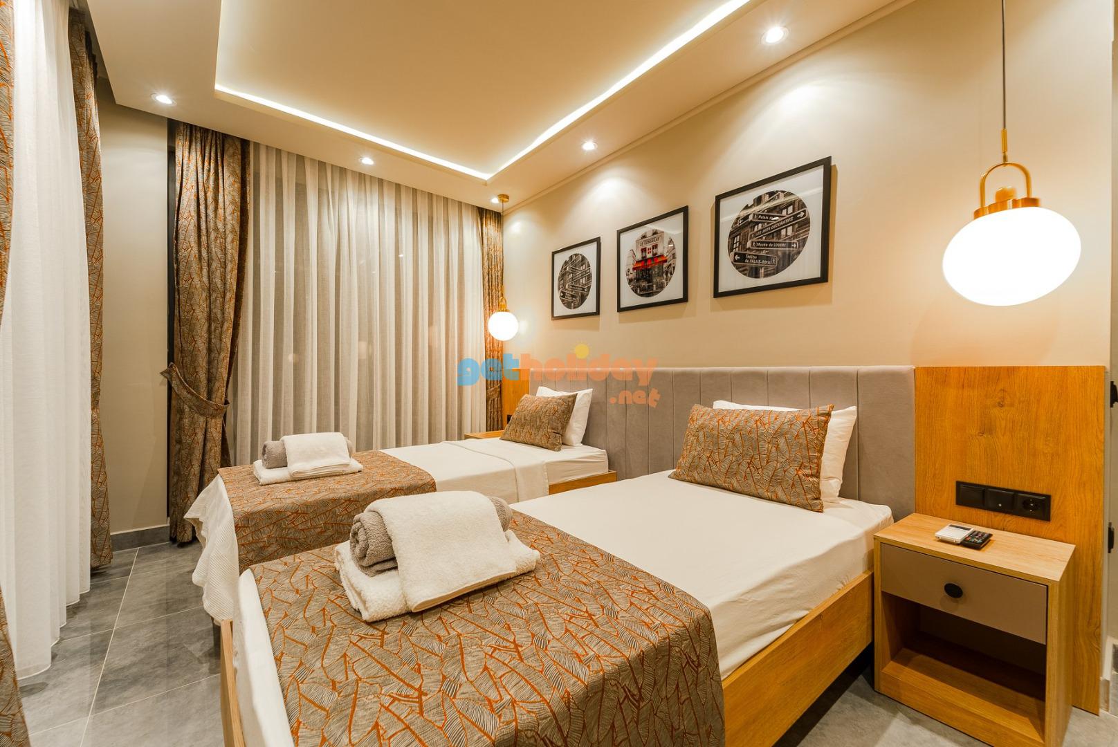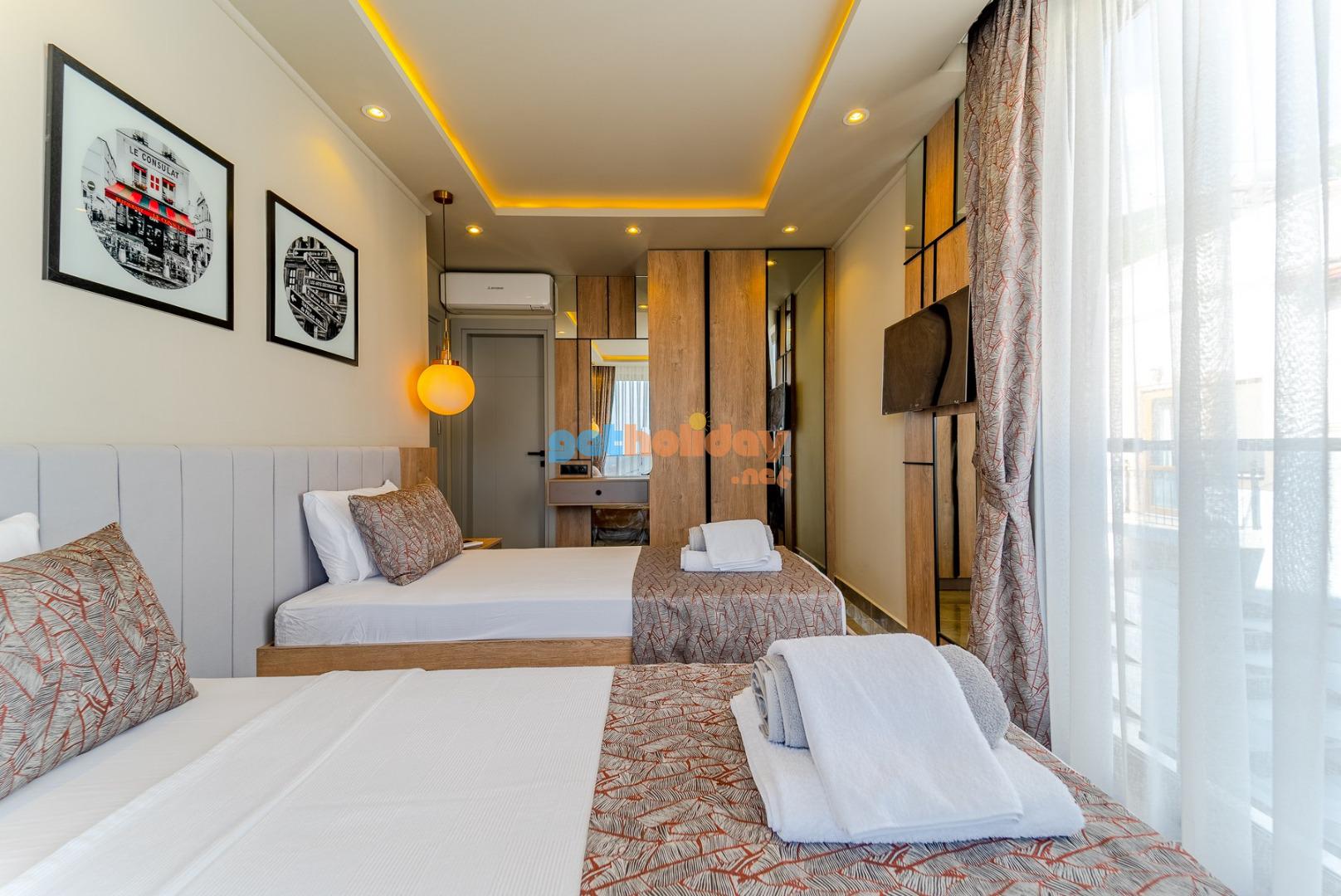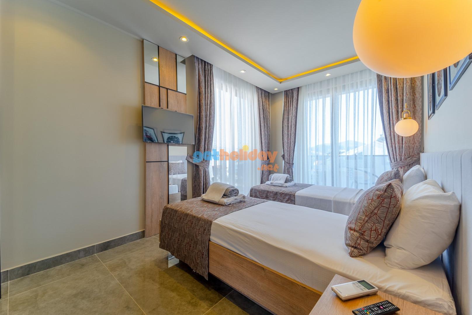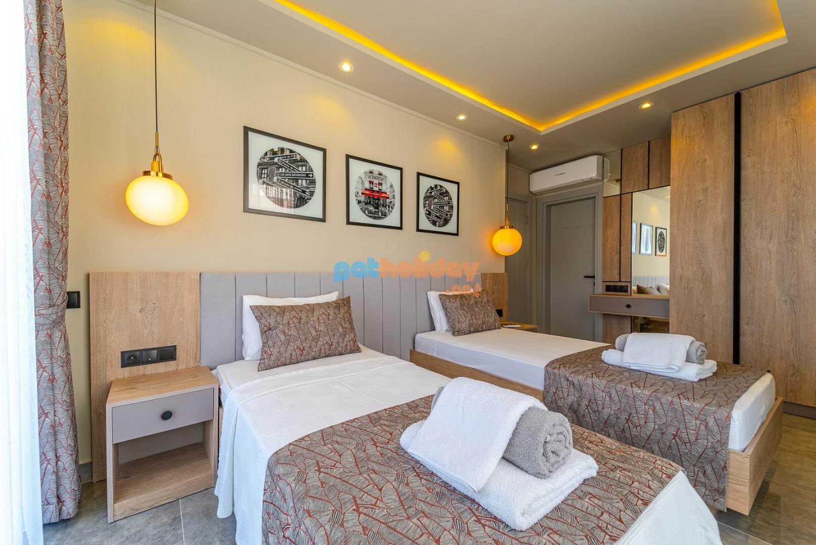 2. Yatak Odası: Genç suit odasında 2 adet tek çift kişilik yatak, komodin , TV, makyaj masası, elbise dolabı,klima, banyo /WC bulunmaktadır.