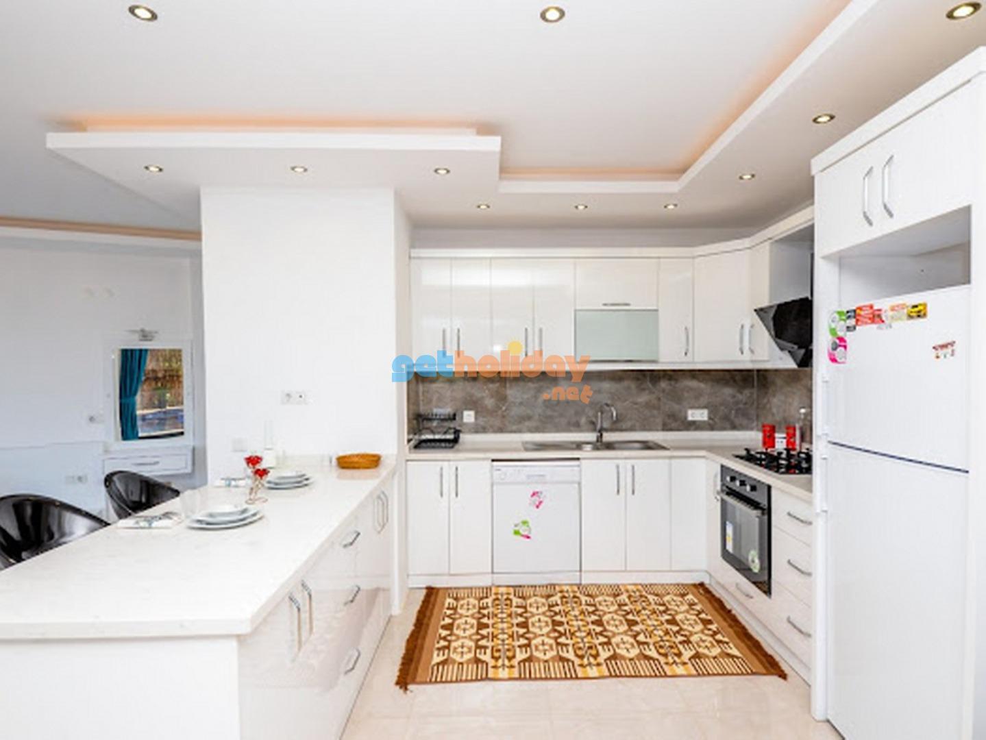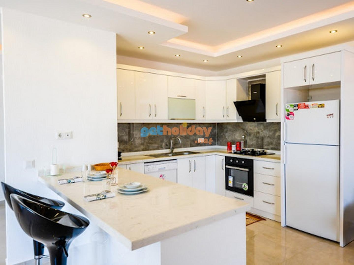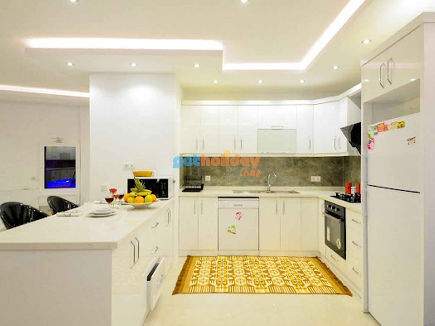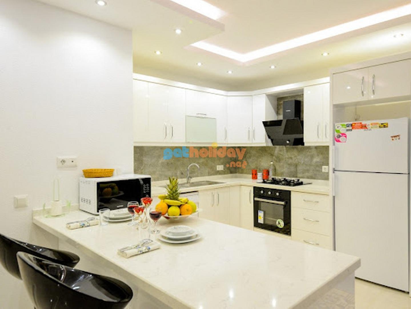 Modern Amerikan Mutfak, buzdolabi, çamasir makinasi, bulasik makinasi, ankastre firin, mikrodalga firin, 4'lü ocak, tost makinasi, elektrikli su isiticisi(kettle), yemek takimi, çatal biçak seti, tavalar, tencereler, bardaklar bulunmaktadir.