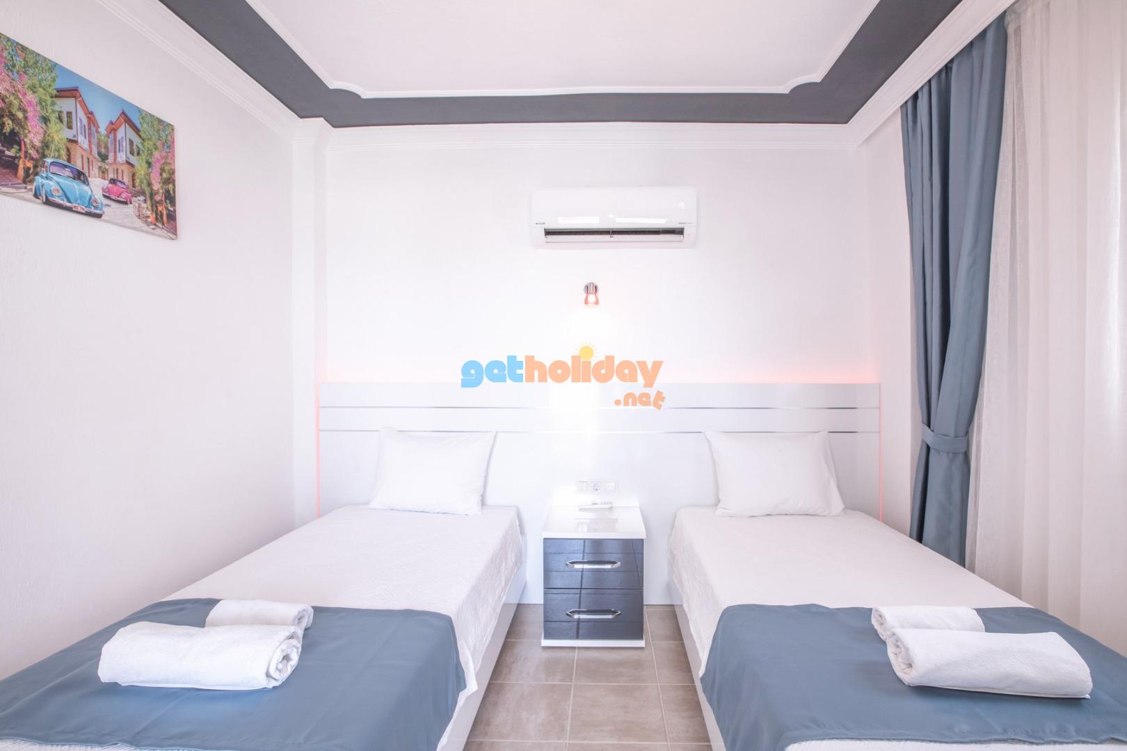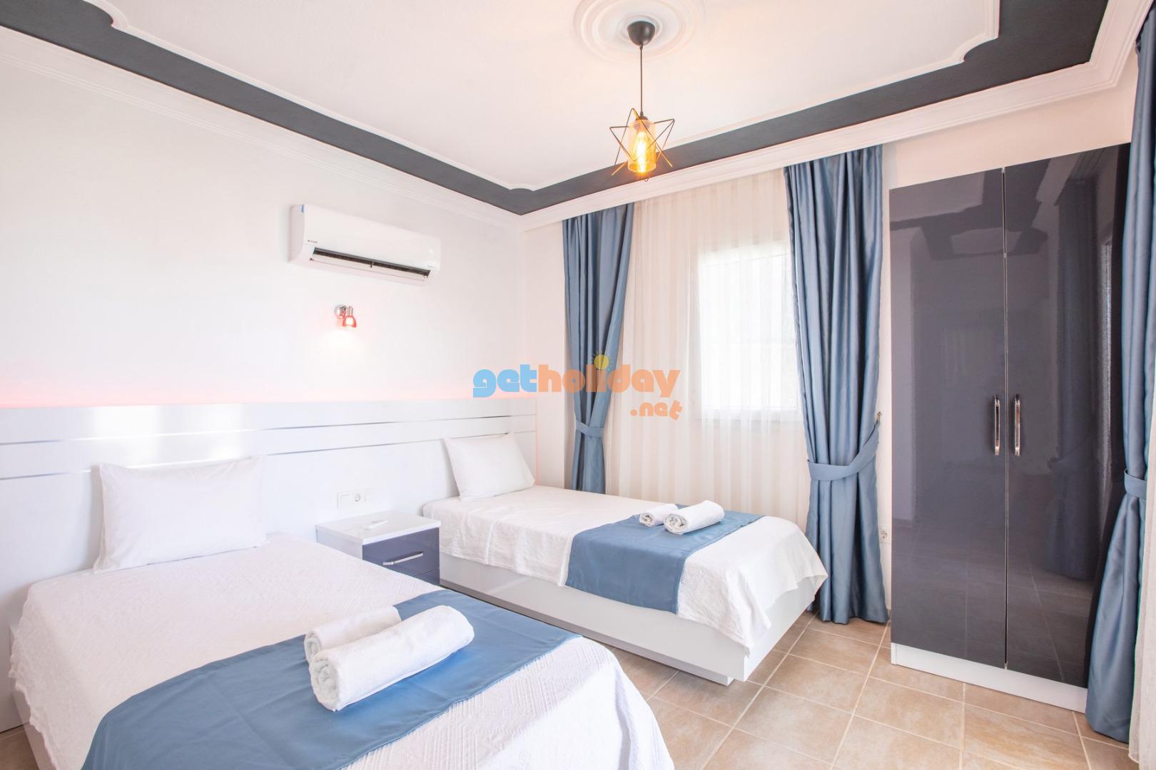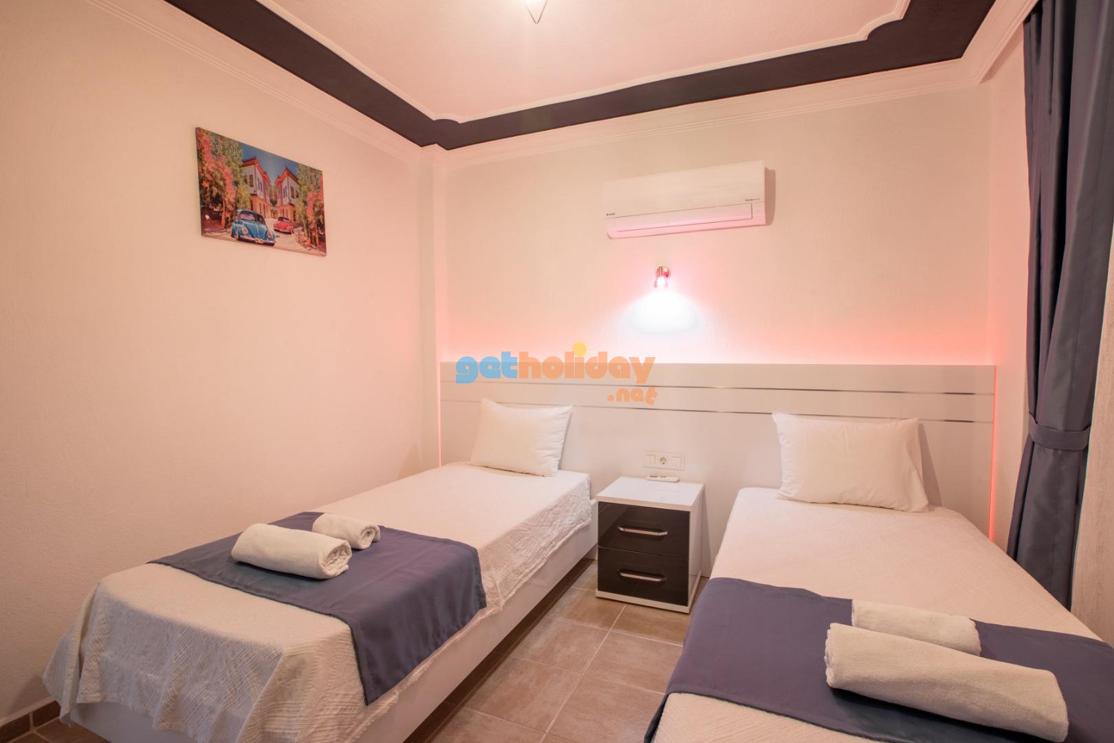 2. Yatak odası; Suit oda, 2 adet tek kişilik yatak, elbise dolabı, makyaj masası, komodin, klima, balkon, banyo ve tuvalet, havuz terasına bulunmaktadir. (Zemin Kat)