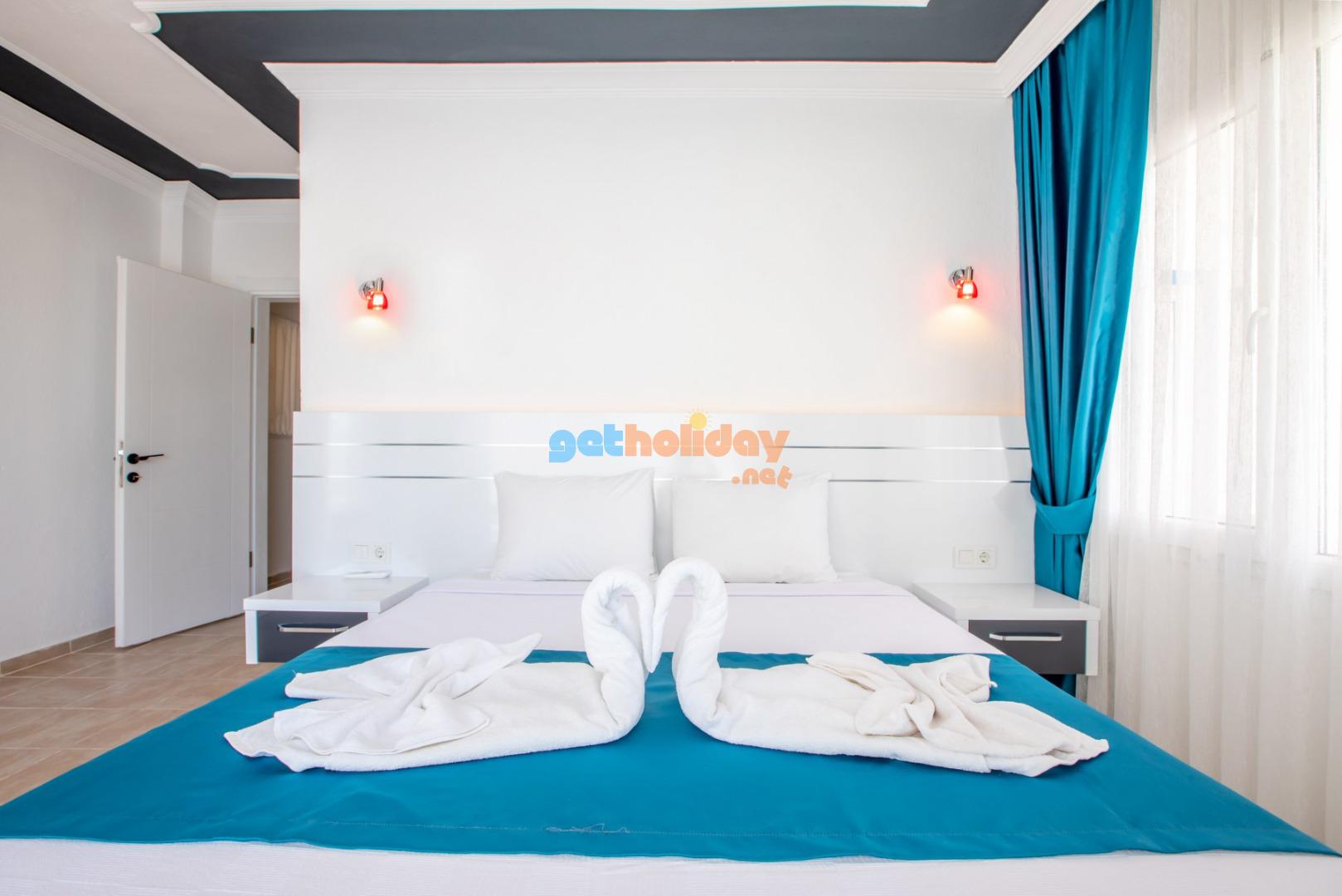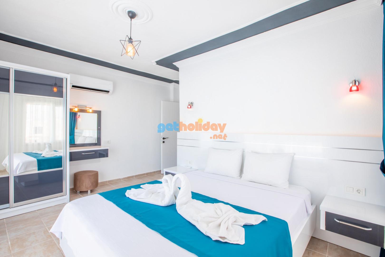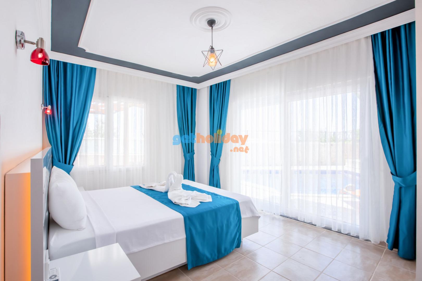 1.Yatak odası (Aile); Suit oda, 1 adet çift kişilik yatak, elbise dolabı makyaj masası, komodin, klima, banyo ve tuvalet, havuz terasına çıkış bulunmaktadir. (Zemin Kat)