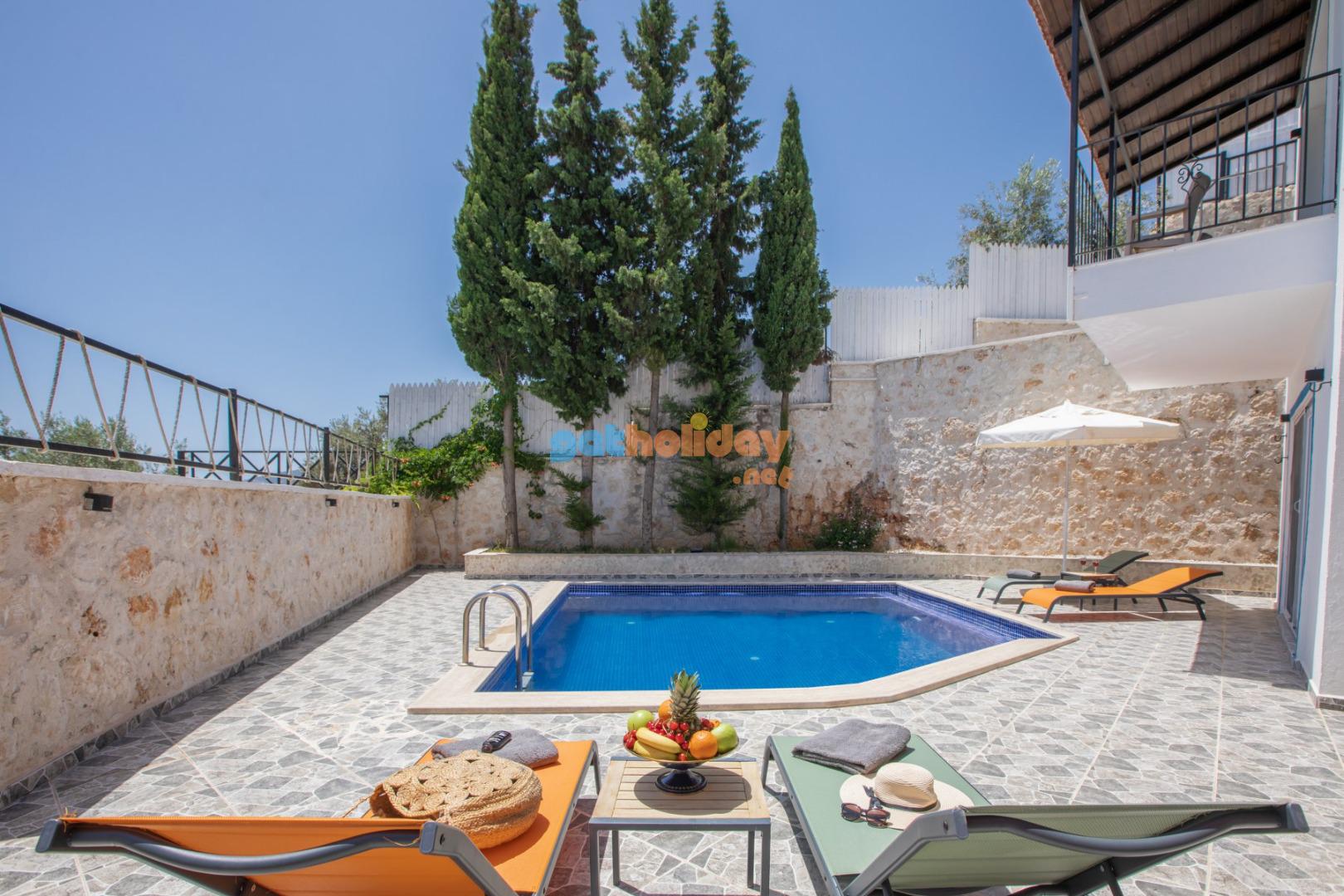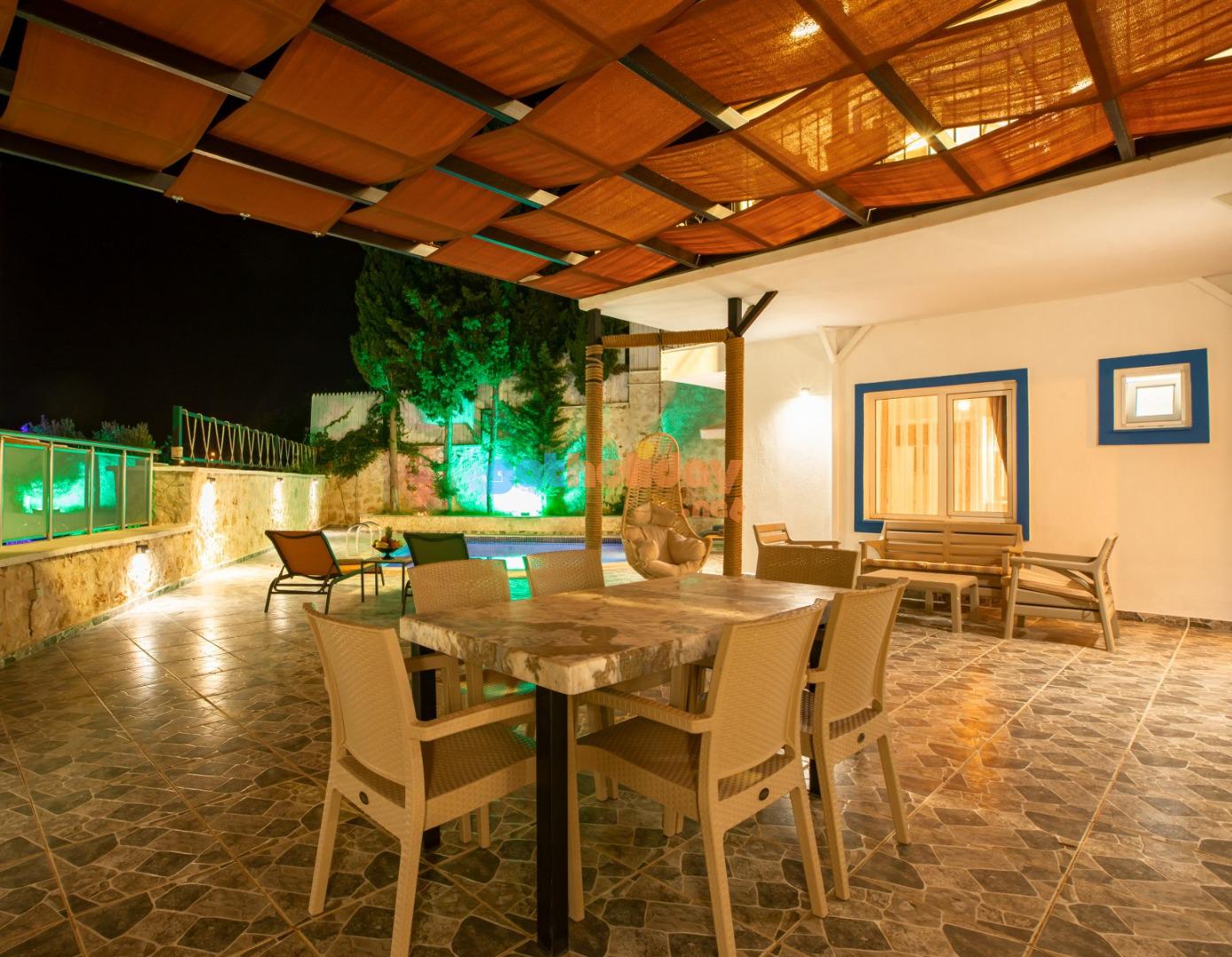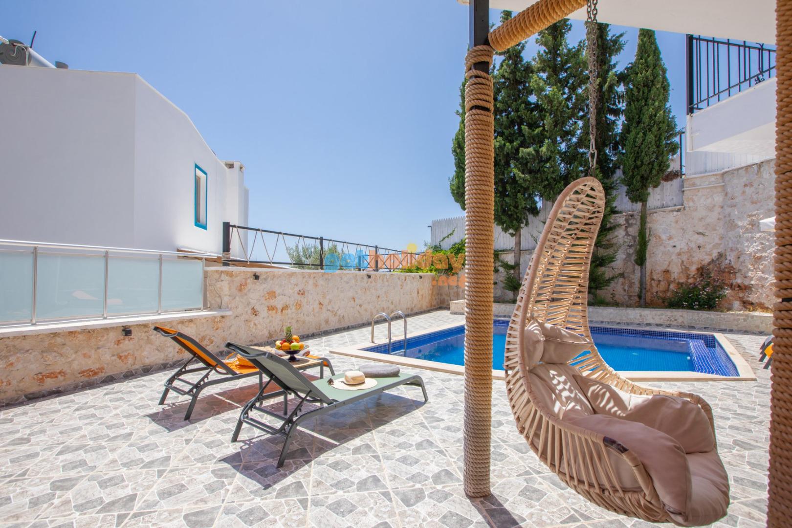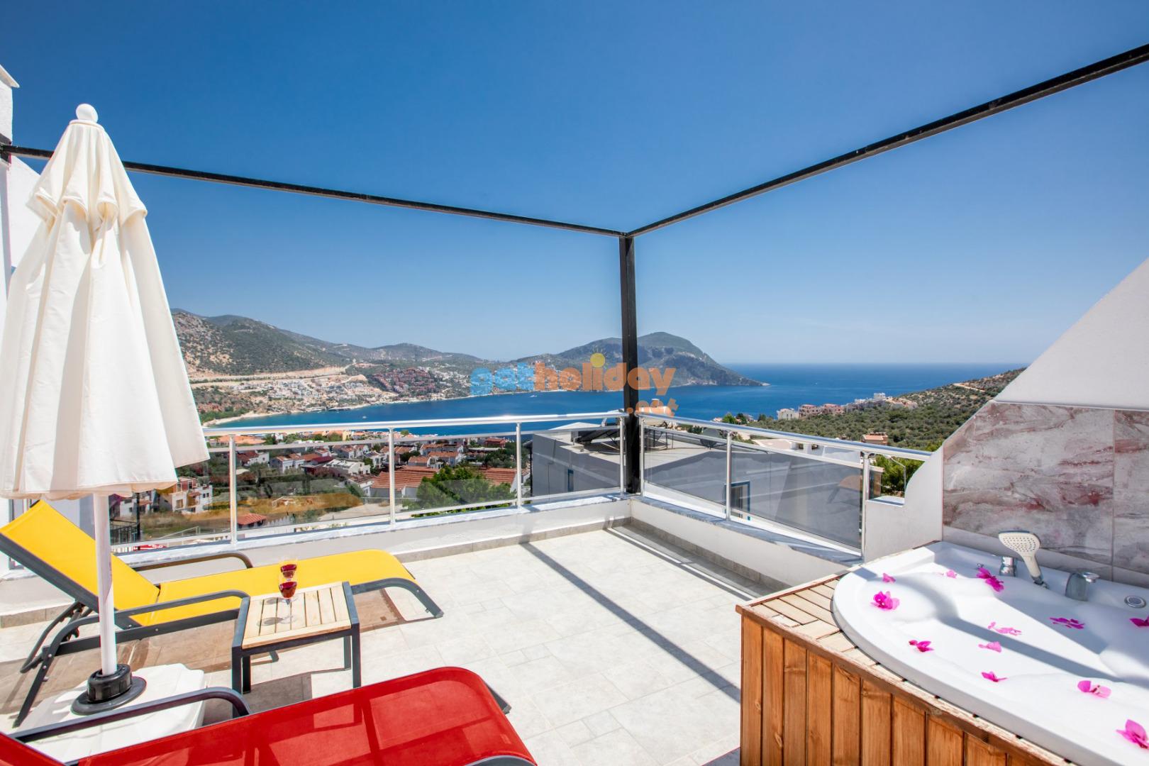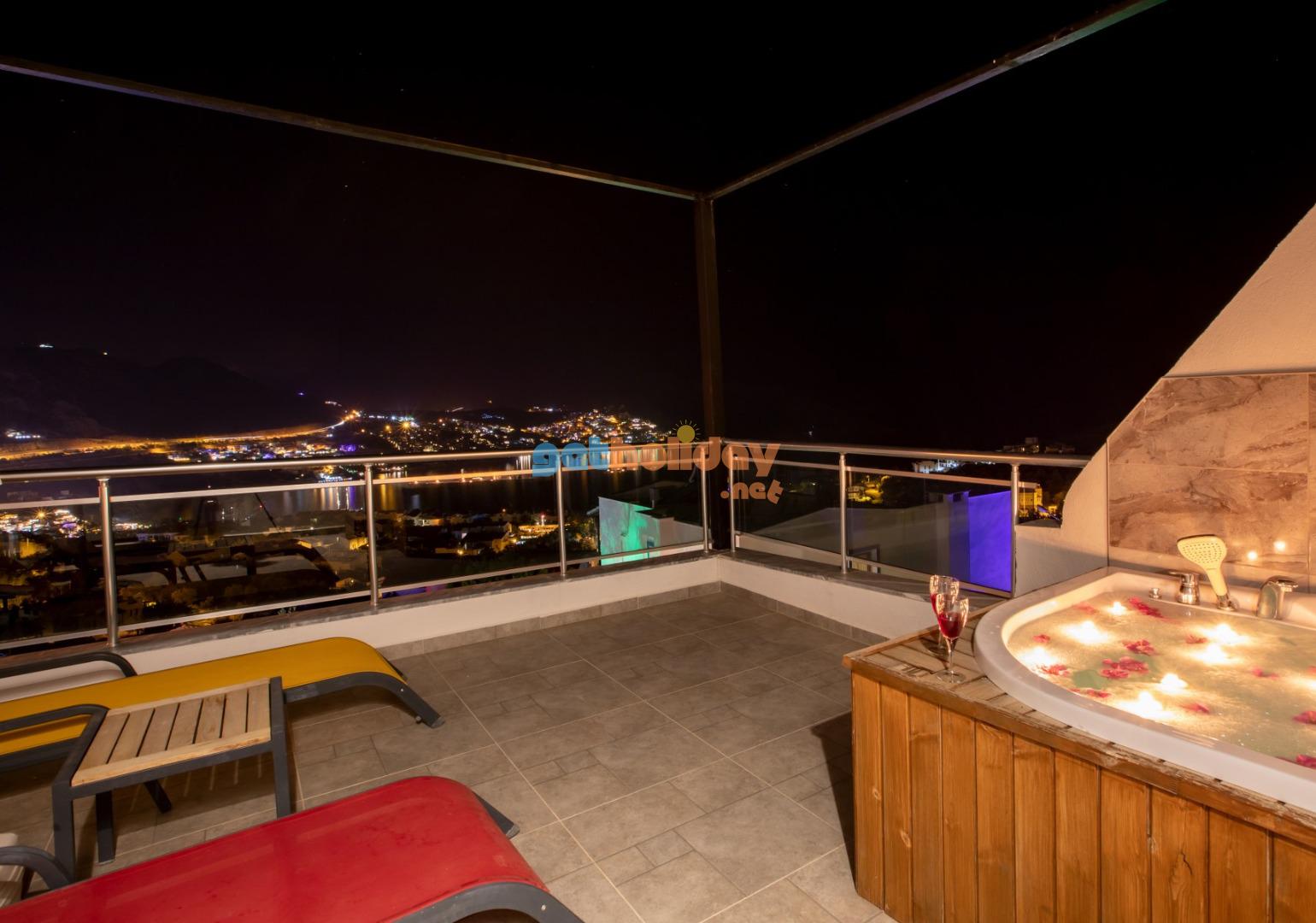 Kalkan Merkeze yürüyüş mesafesinde jakuzili 3 yatak odalı 6 kişilik kiralık villa