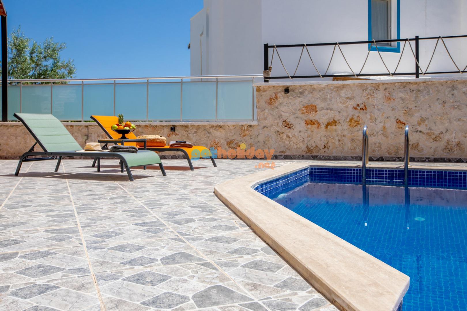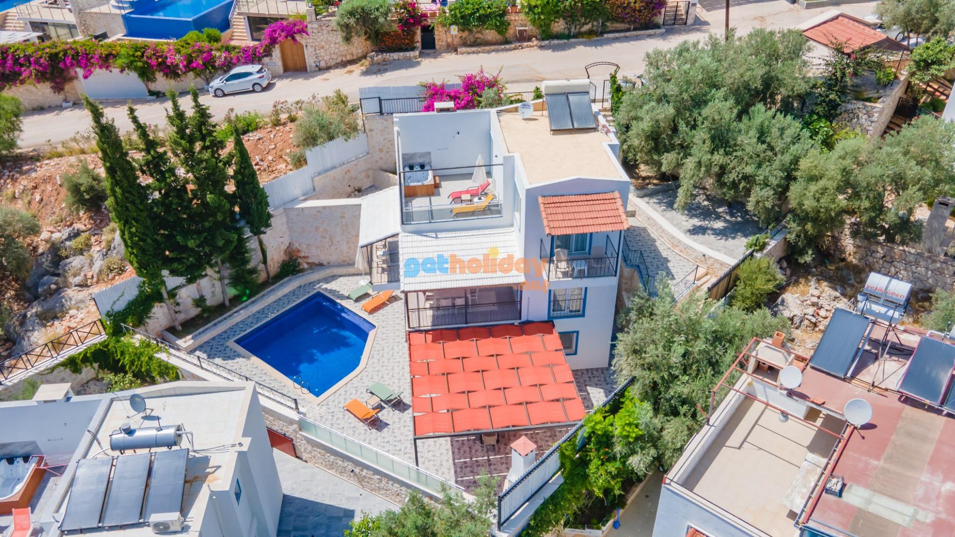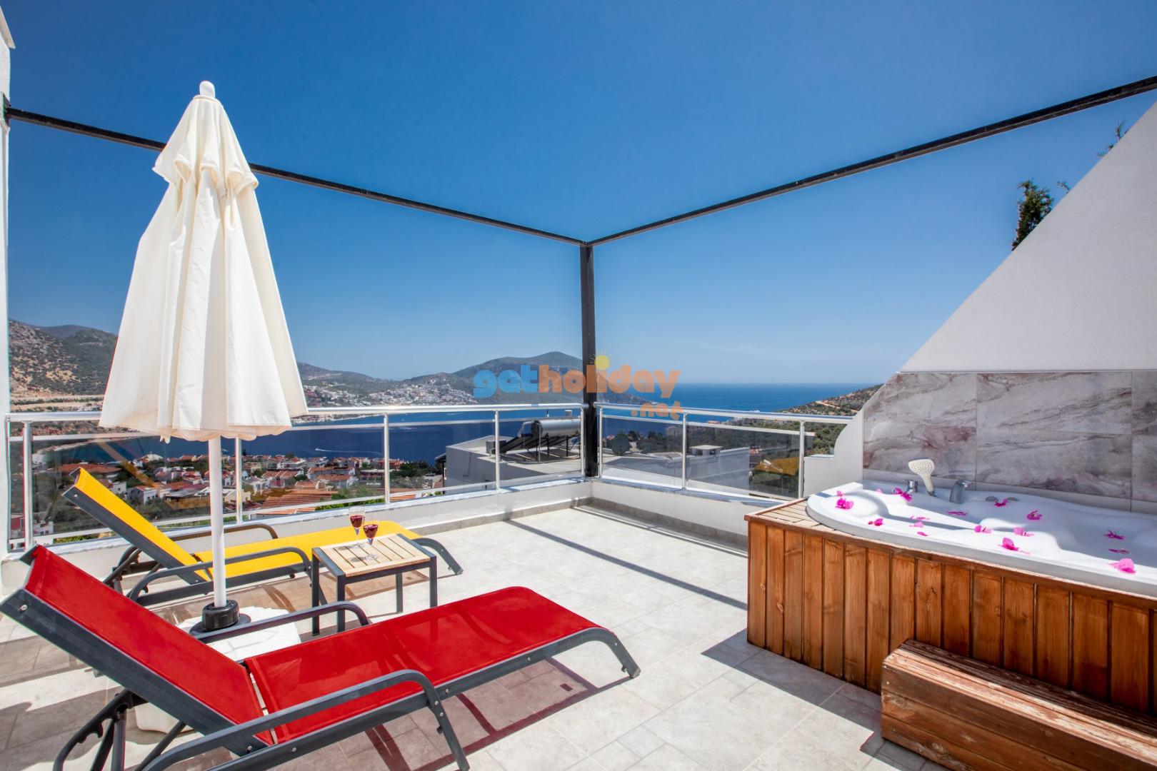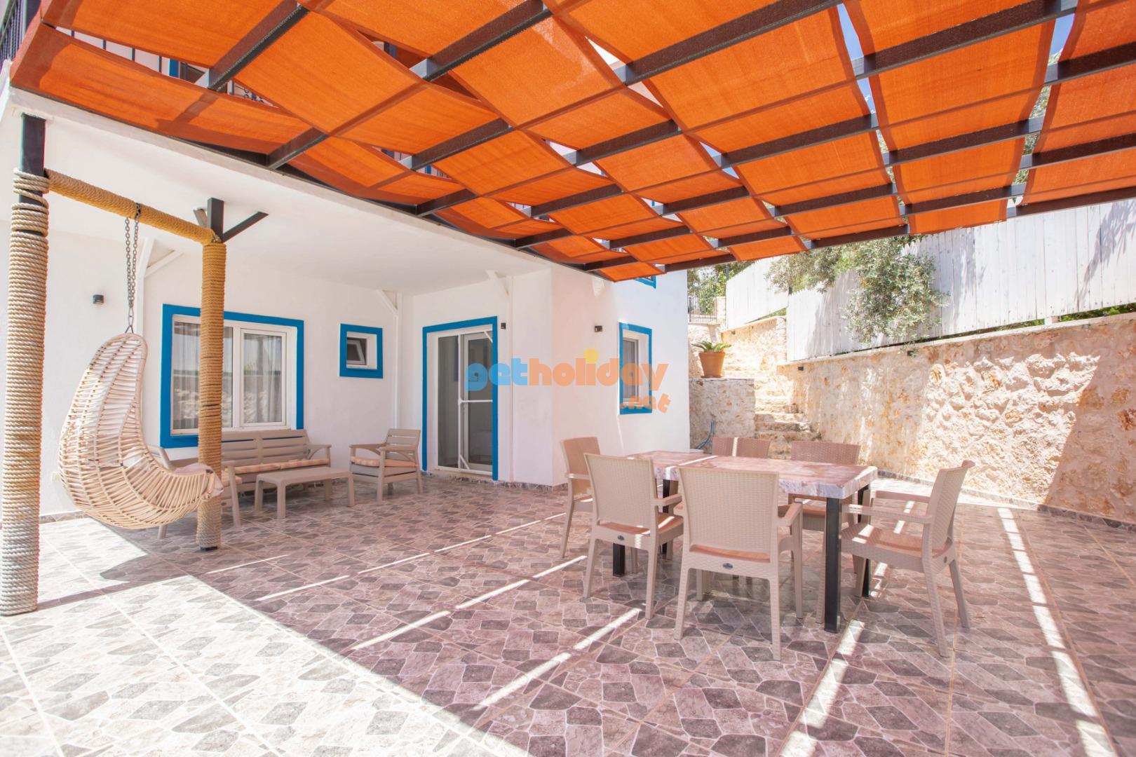 Kalkan Merkeze yürüyüş mesafesinde jakuzili 3 yatak odalı 6 kişilik kiralık villa