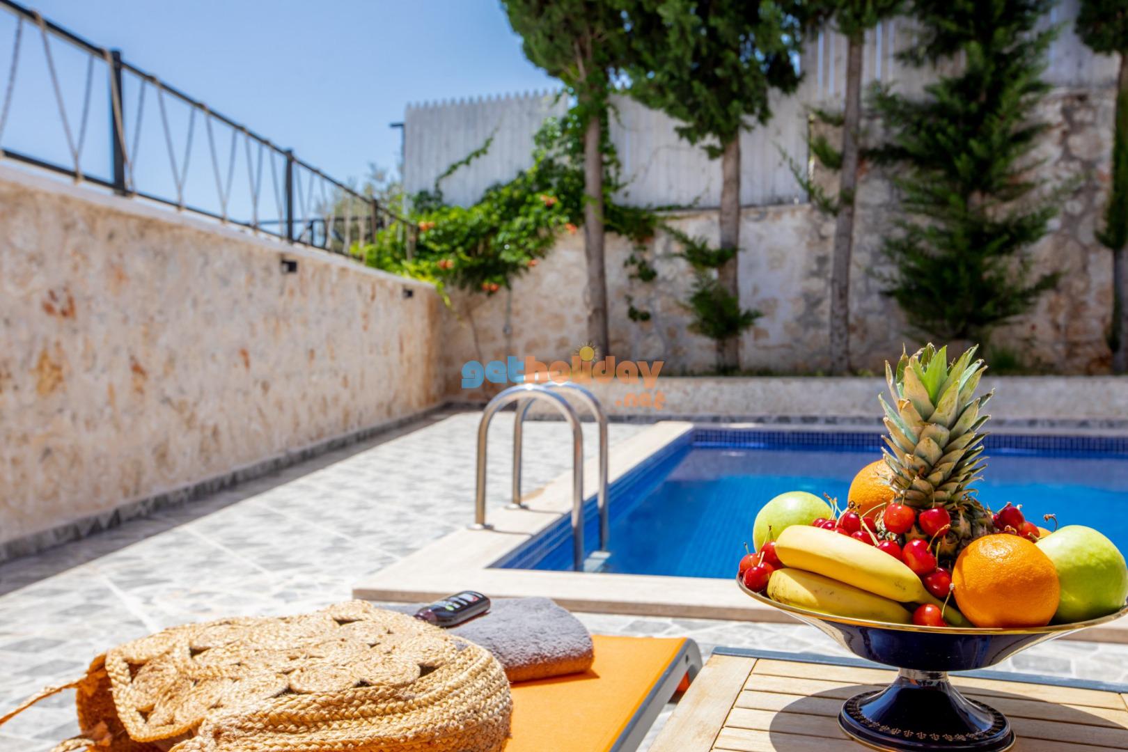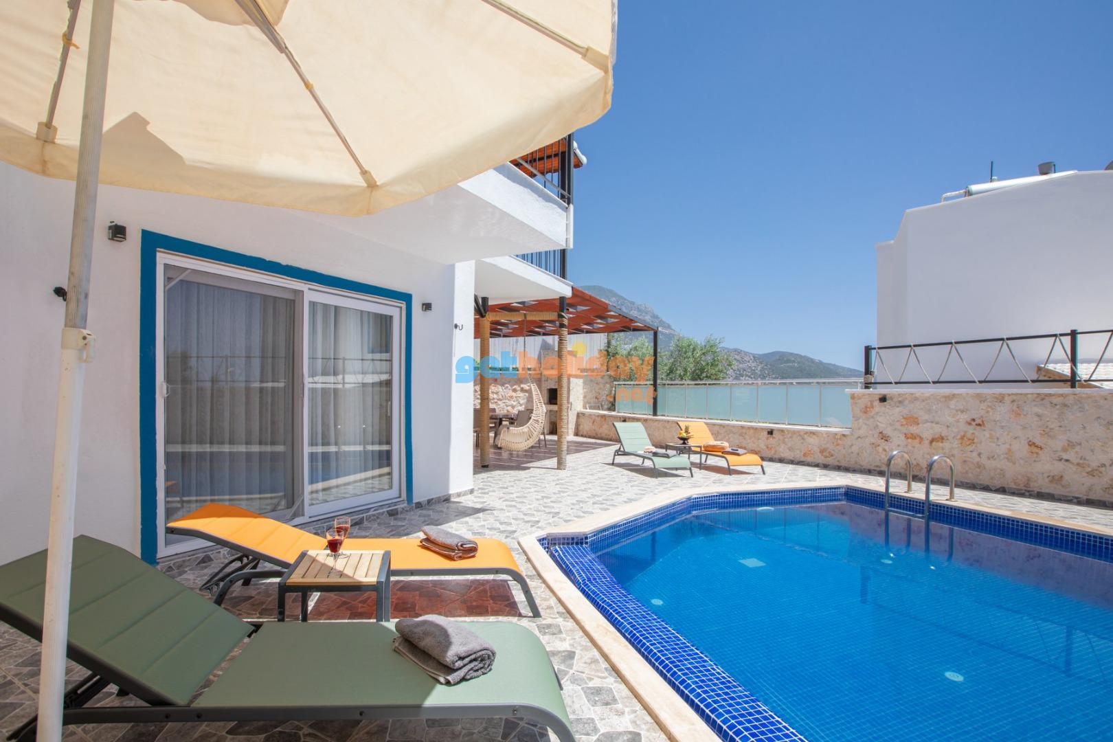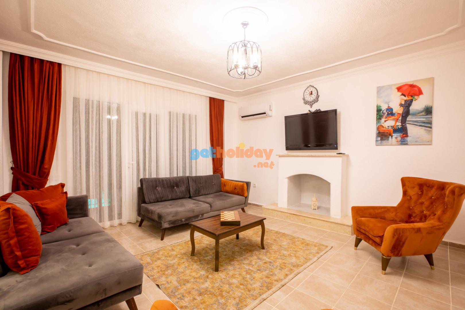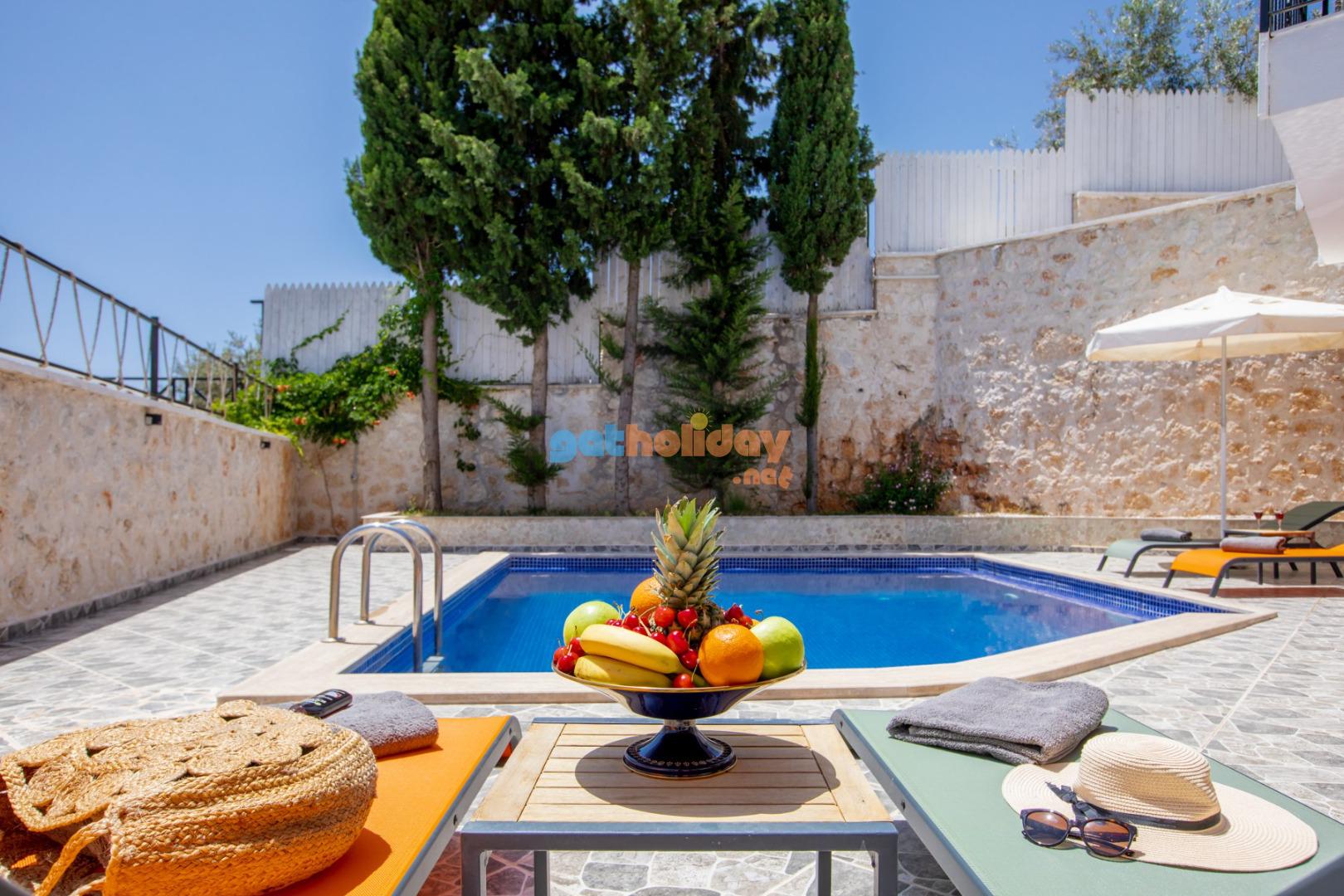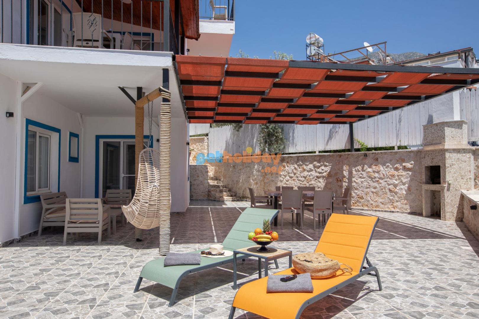 Kalkan Merkeze yürüyüş mesafesinde jakuzili 3 yatak odalı 6 kişilik kiralık villa
