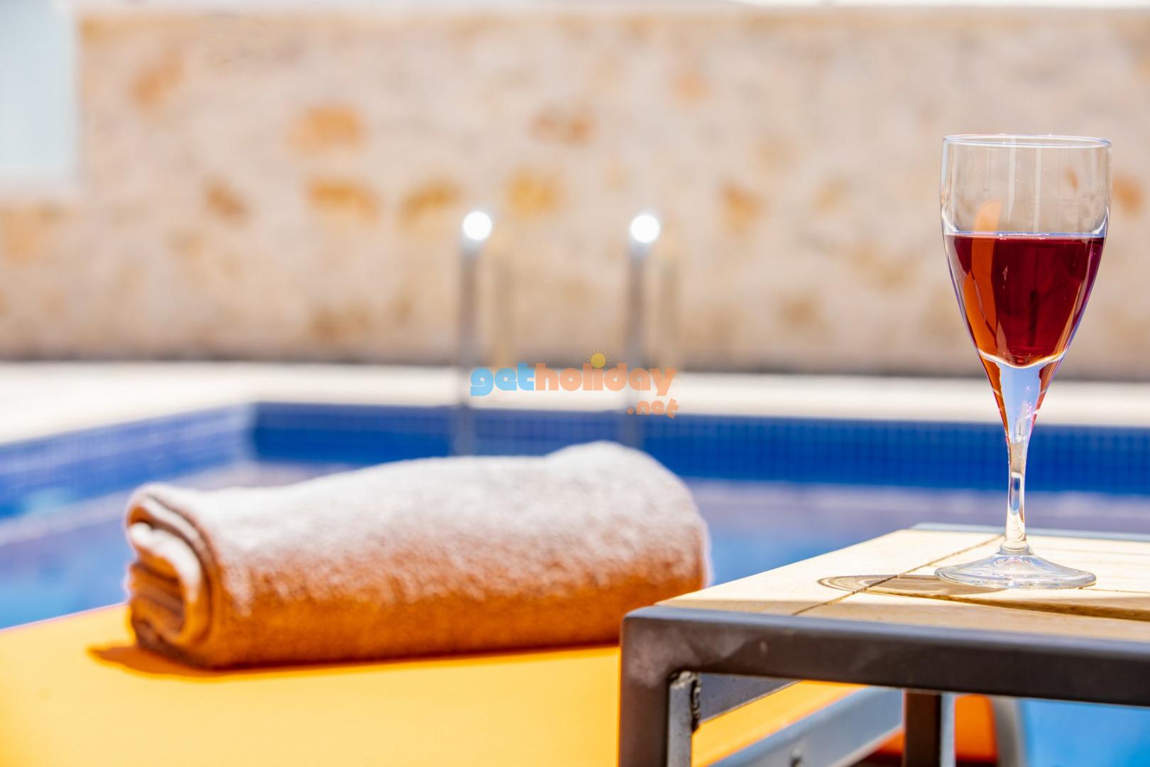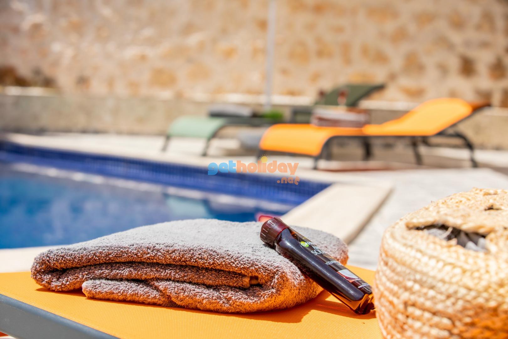 Havuz Terası Şezlonglar, güneş şemsiyesi, mangal, yemek masası ve sandalyeler bulunmaktadir.